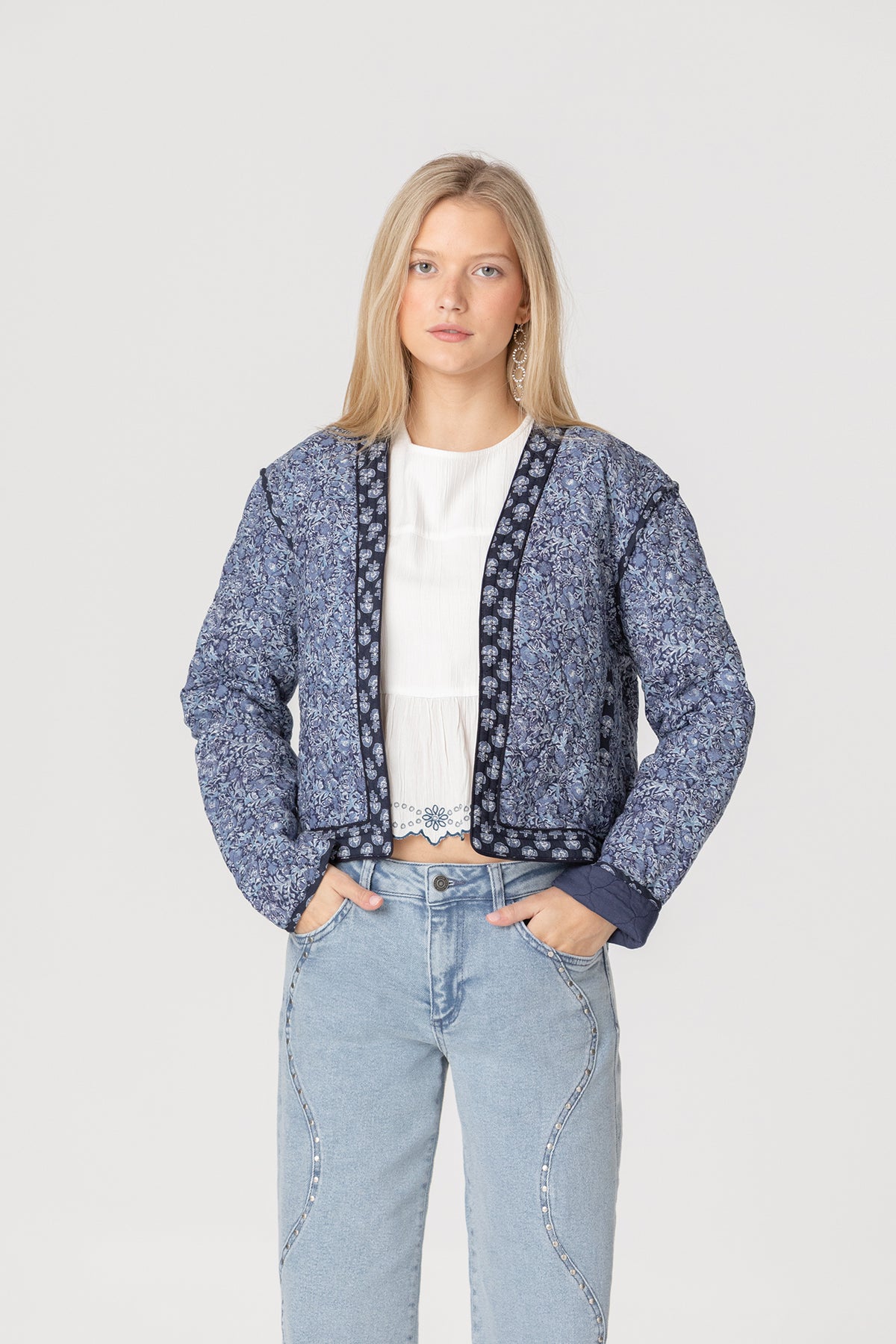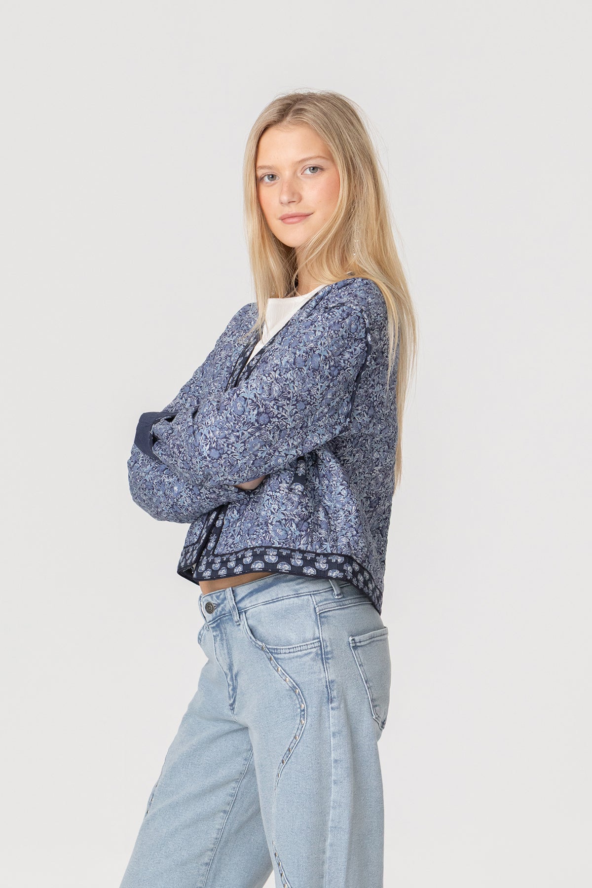 Chaqueta Estampada de Manga Larga Color Azul. Estampado de flores en tendencia. Perfecta para entretiempo. ¡Combínala con cualquiera de nuestros looks y consigue un lookazo!