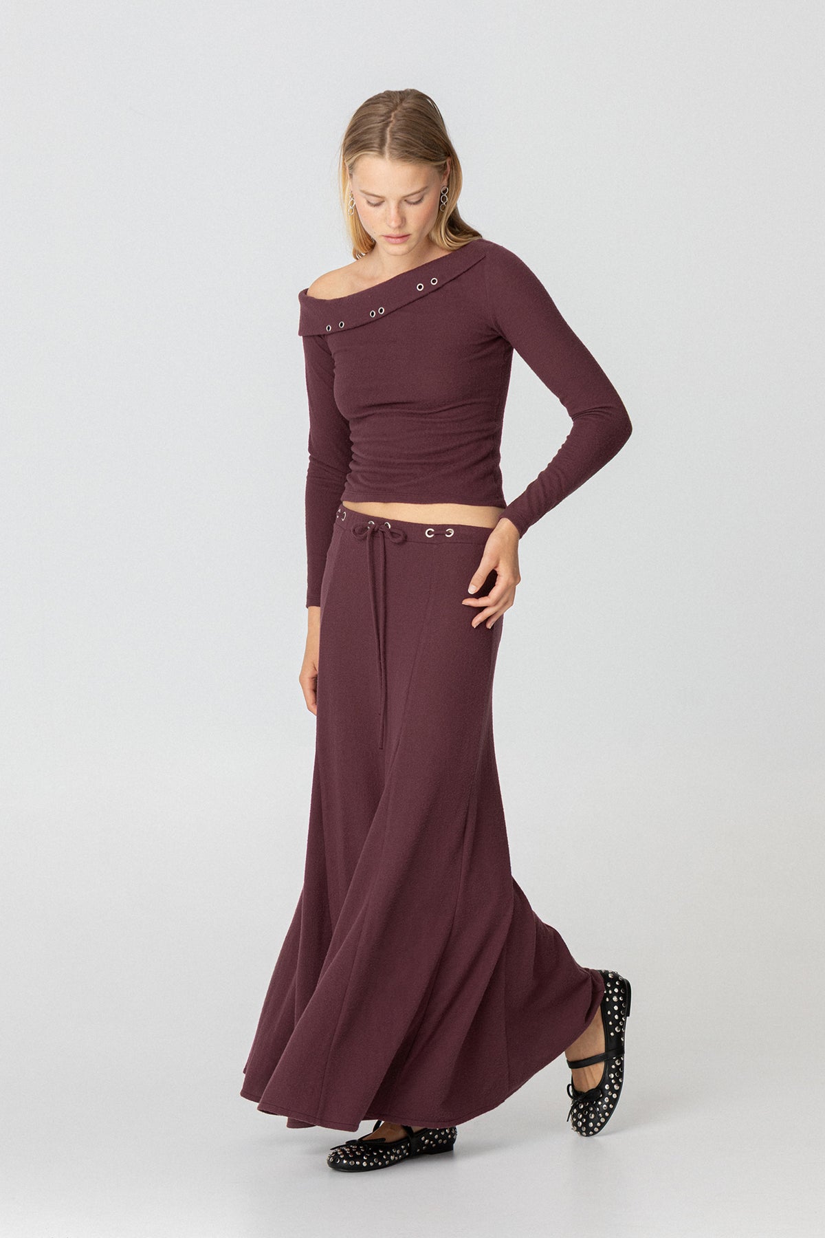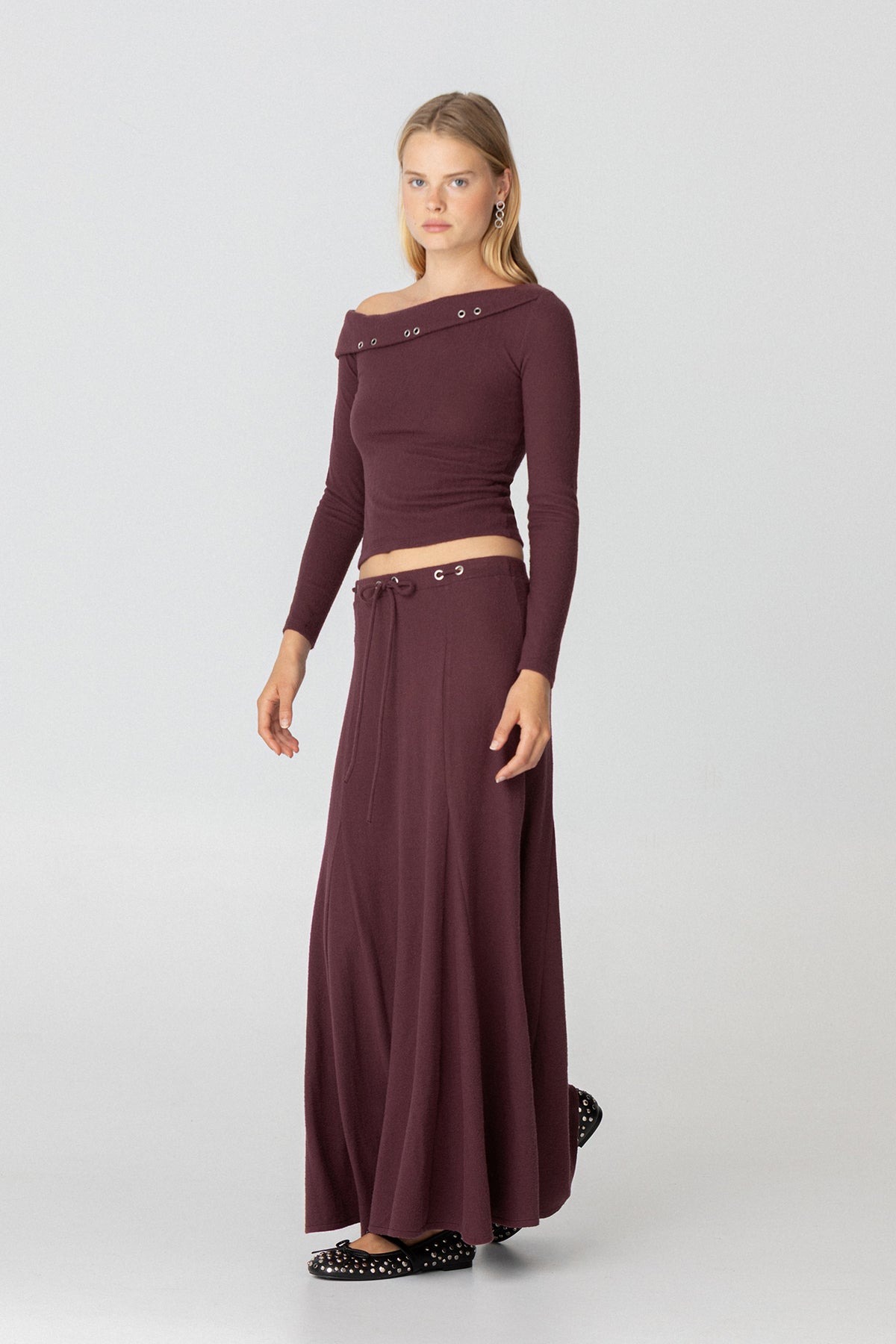 Falda Midi Color Burdeos con Detalles Eyelets. Tejido elástico que se ajusta perfectamente. Lazada a la cintura. Bajo fluido. ¡Combínala con el TOP a juego y consigue un total look completo!