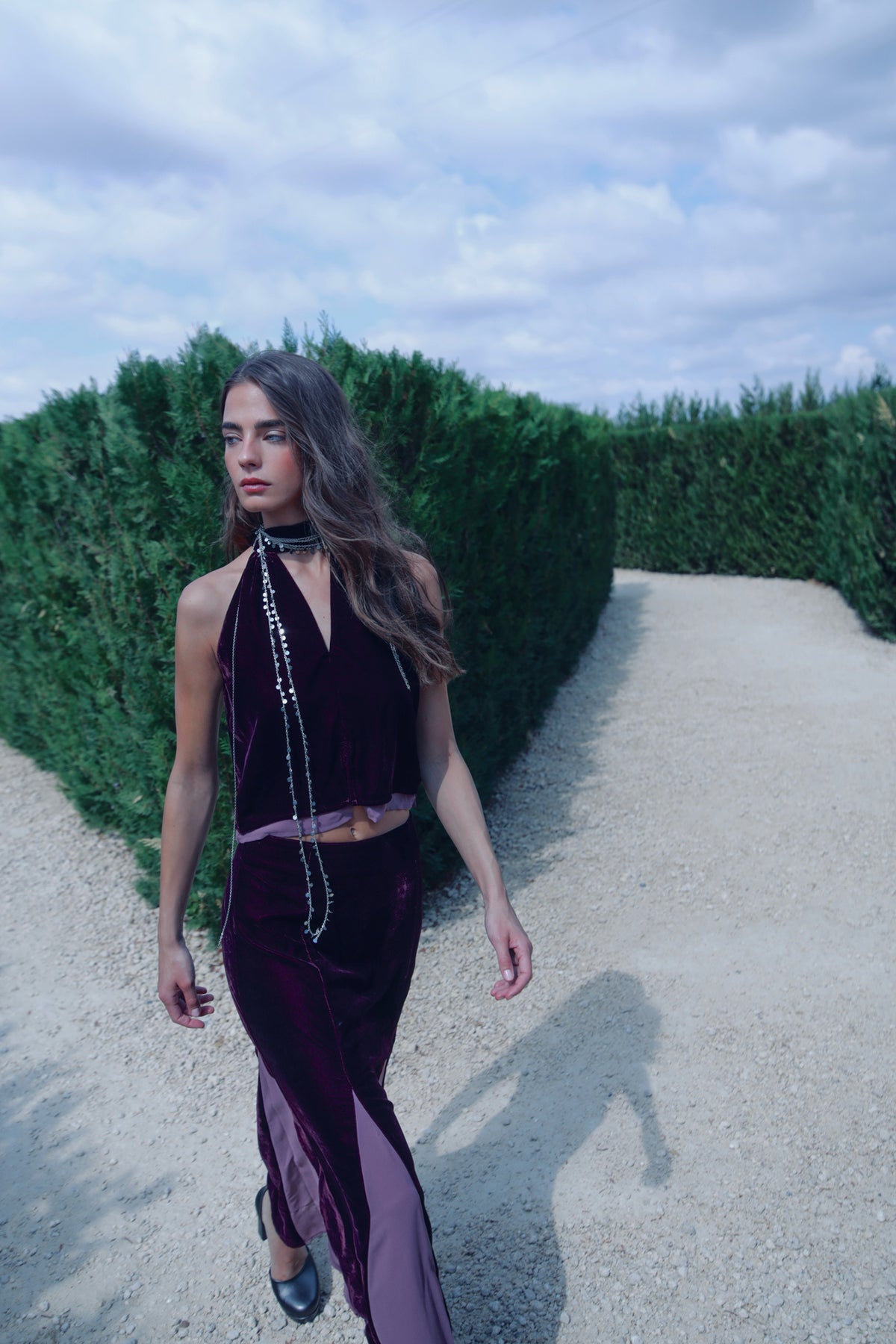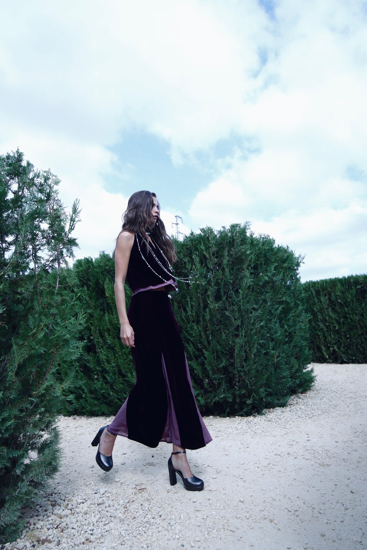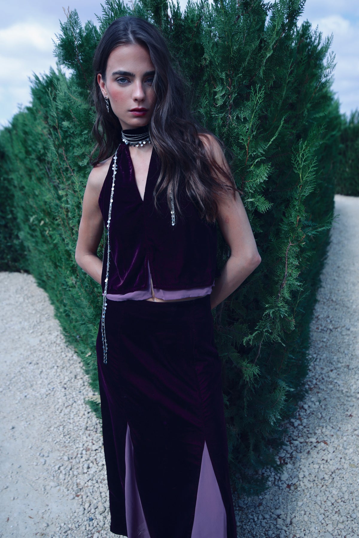Falda Larga de Terciopelo Burdeos con Detalle en Mezcla de Tejidos. Un diseño elegante y sofisticado que destaca por su acabado distintivo. ¡Combínala con el top halter a juego y consigue el look de invitada perfecto para cualquier evento especial!