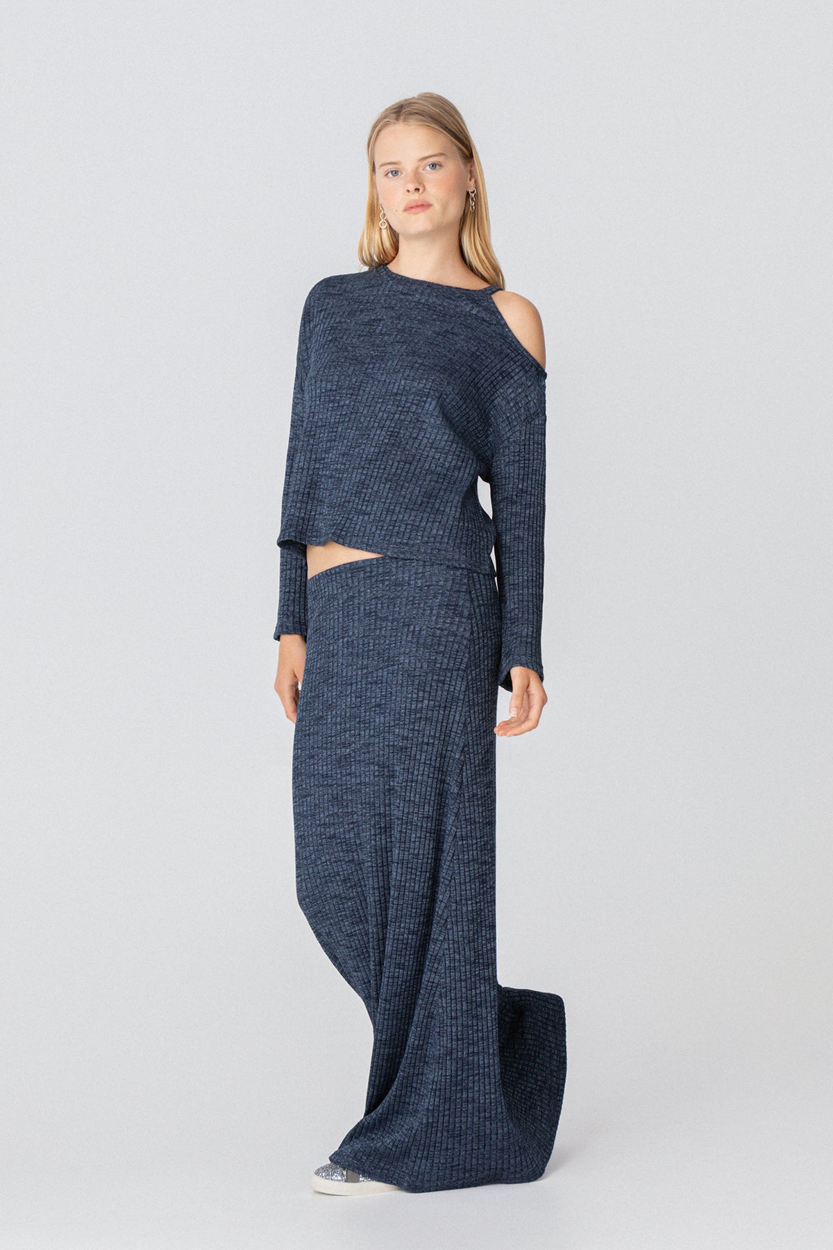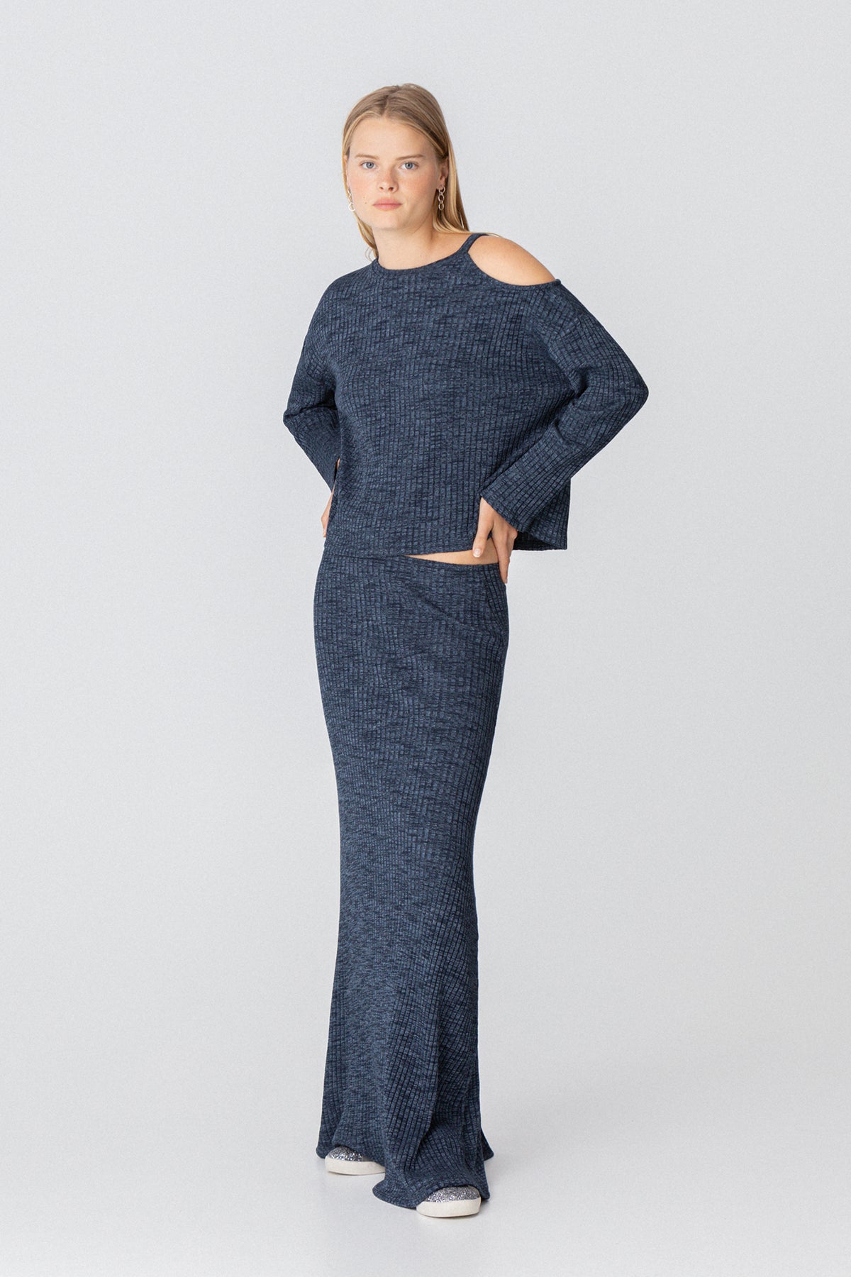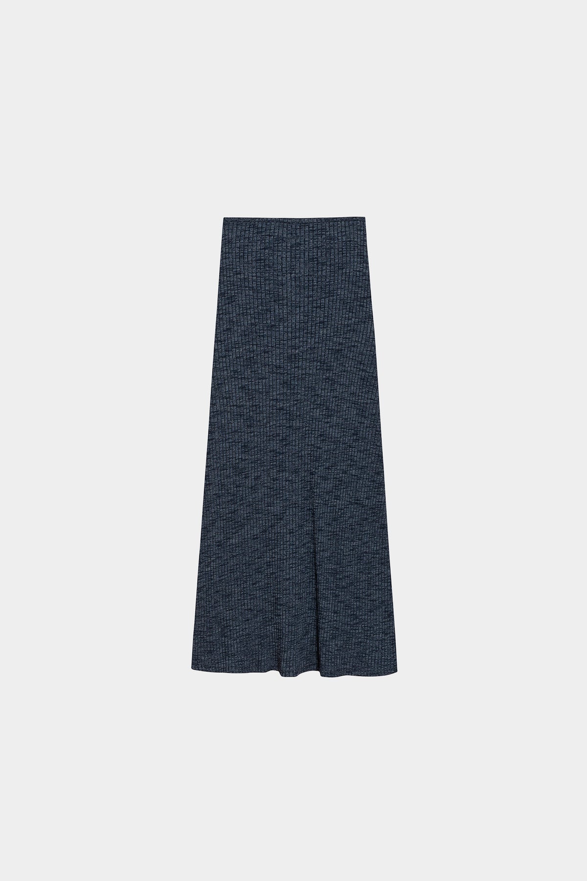 Falda Midi con Tejido Jaspeado Color Azul. Tejido elástico y suave que se ajusta perfectamente, y realza la figura. ¡Combínalo con la CAMISETA ABERTURA JASPEADO para conseguir un total look en tendencia!