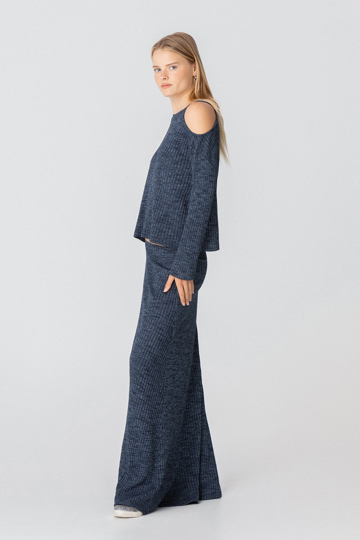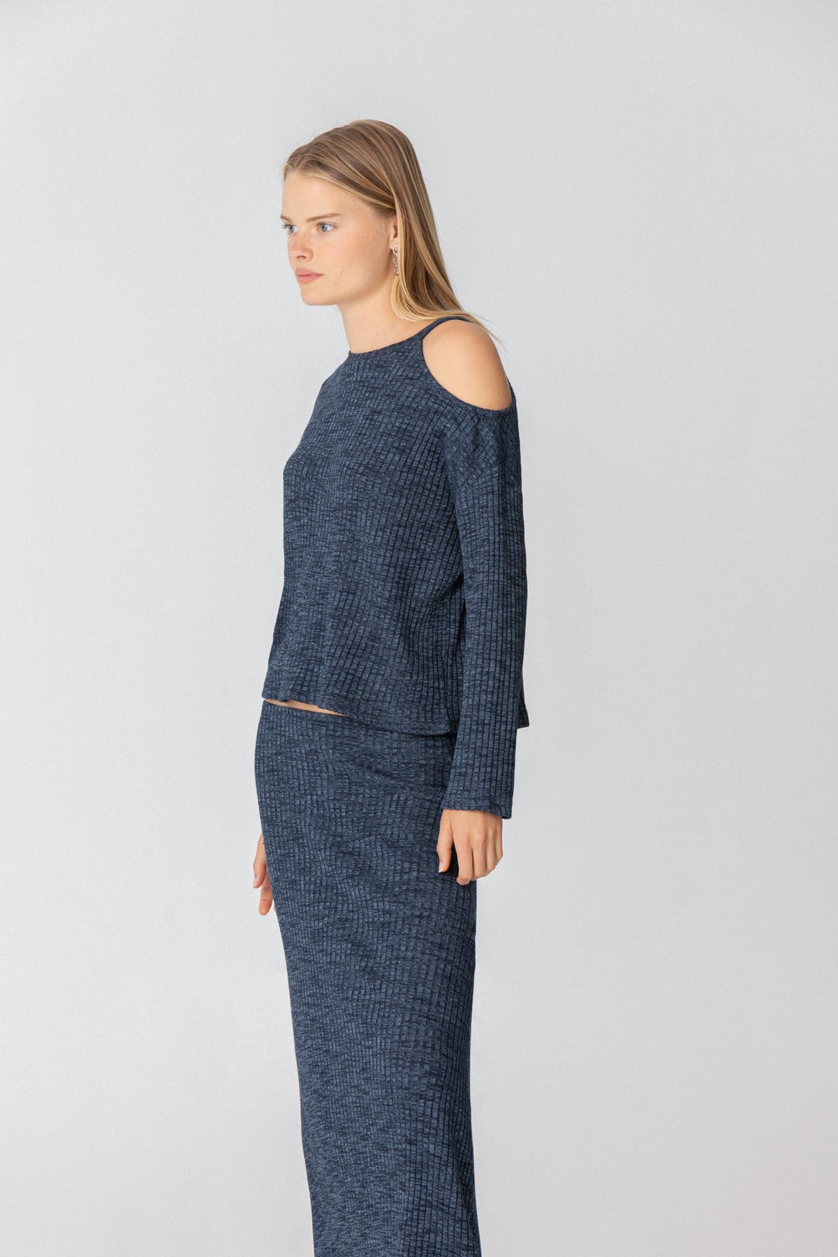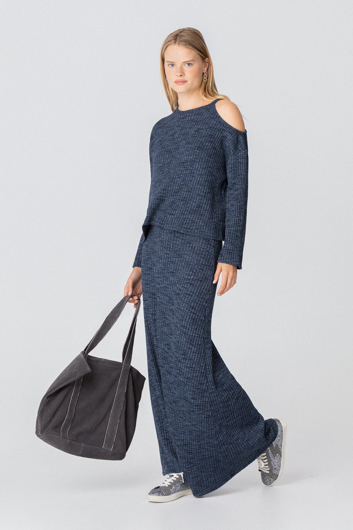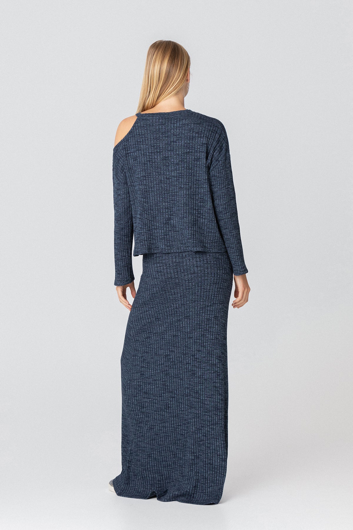 Falda Midi con Tejido Jaspeado Color Azul. Tejido elástico y suave que se ajusta perfectamente, y realza la figura. ¡Combínalo con la CAMISETA ABERTURA JASPEADO para conseguir un total look en tendencia!