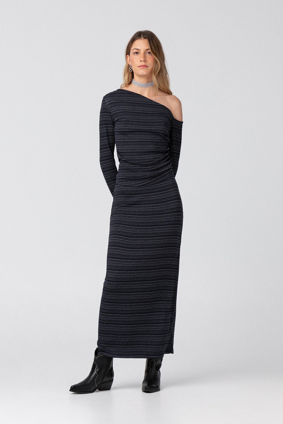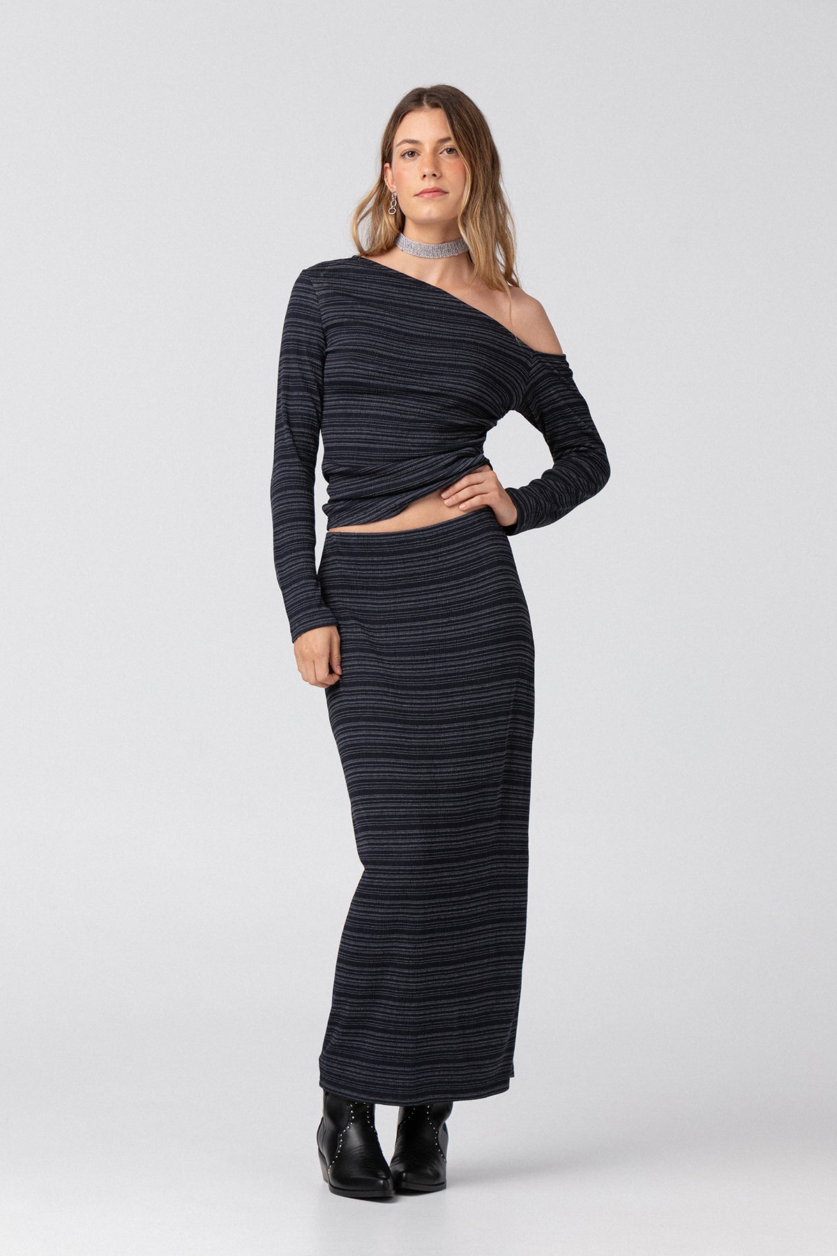 Falda Midi de Rayas con Cintura Elástica. Tejido suave que se ajusta perfectamente al cuerpo. Combínalo con el Top Asimétrico Rayas para conseguir un total look ideal. ¡No te quedes sin tus favoritos!