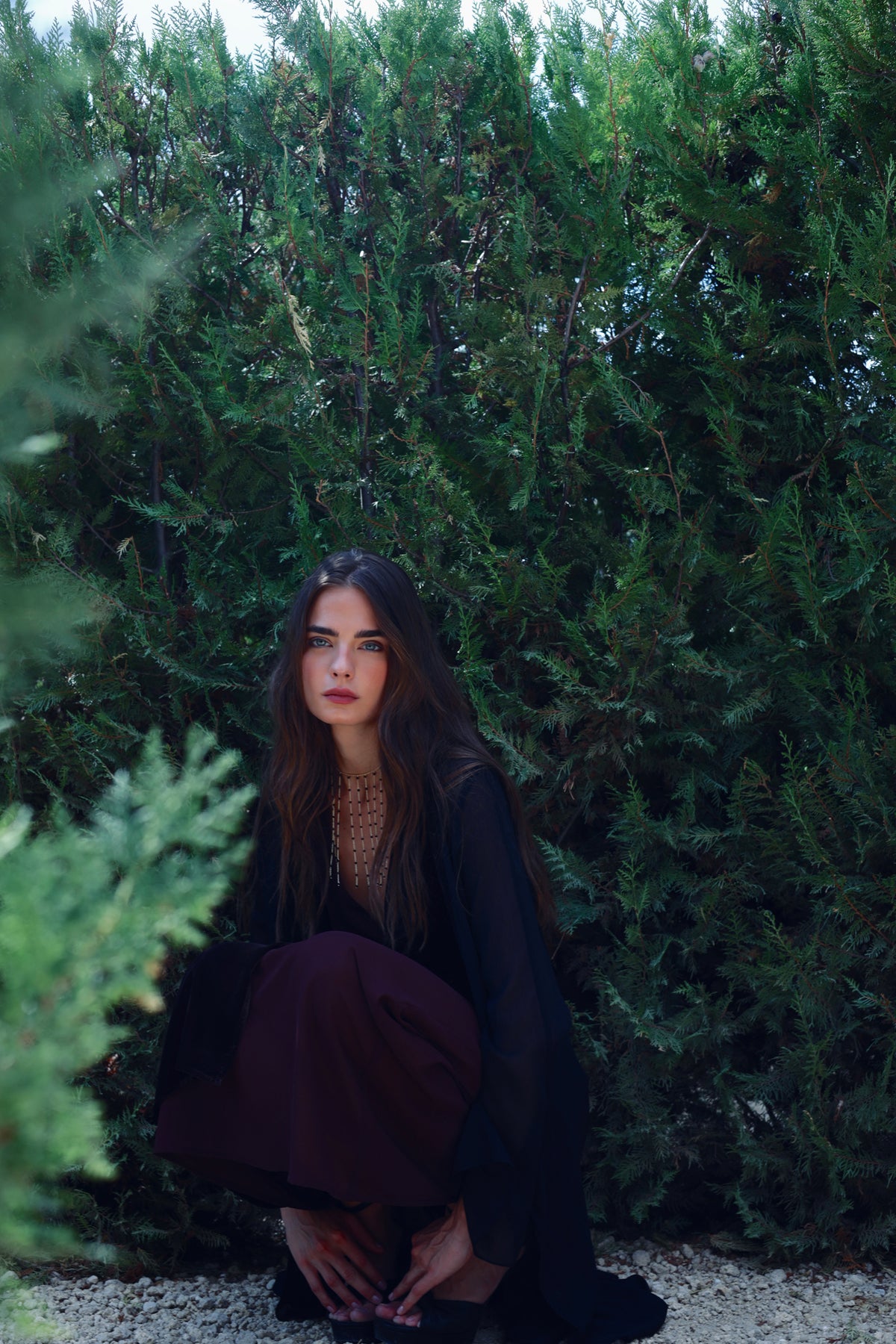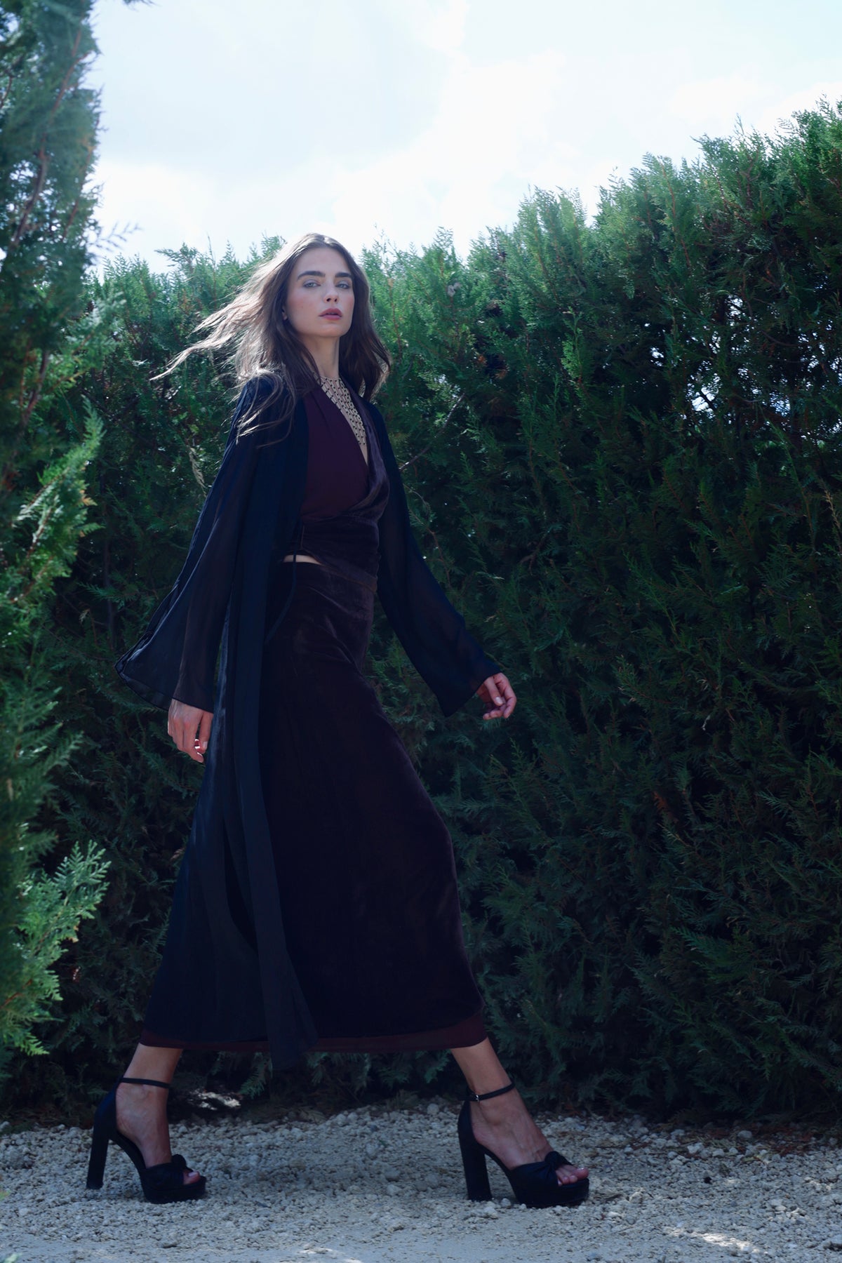 Falda Larga de Terciopelo Marrón con Detalle de Mezcla de Tejidos. Diseño elegante y sofisticado que destaca por su acabado distintivo. ¡Combínala con el top cruzado terciopelo a juego y consigue un total look ideal para cualquier evento!