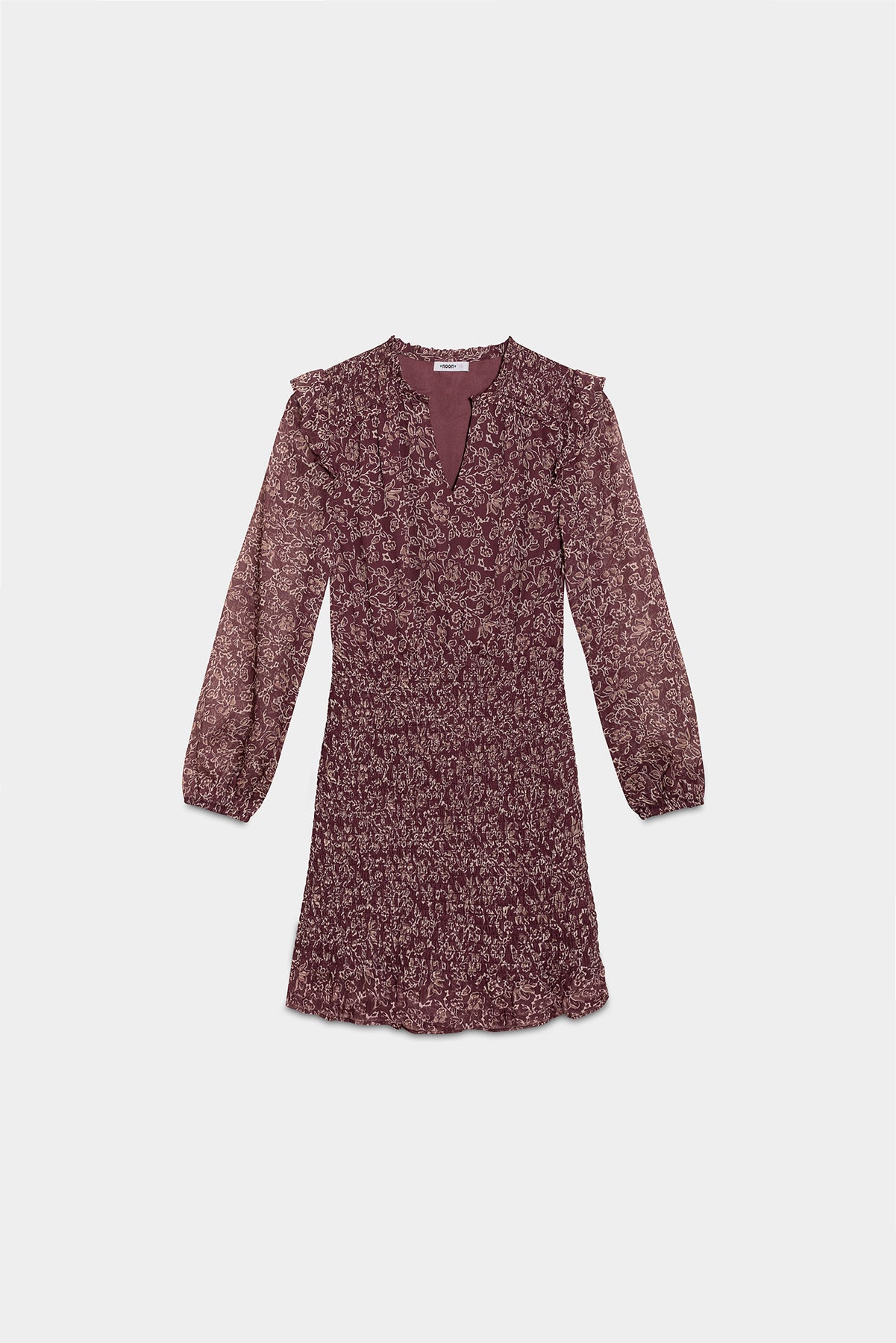 Vestido Corto de Manga Larga Estampado en Tonos Burdeos. Escote en pico y lazada para un ajuste perfecto. Ideal para cualquier ocasión especial. ¡Combínalo con nuestras botas cowboy y consigue un look en tendencia!
