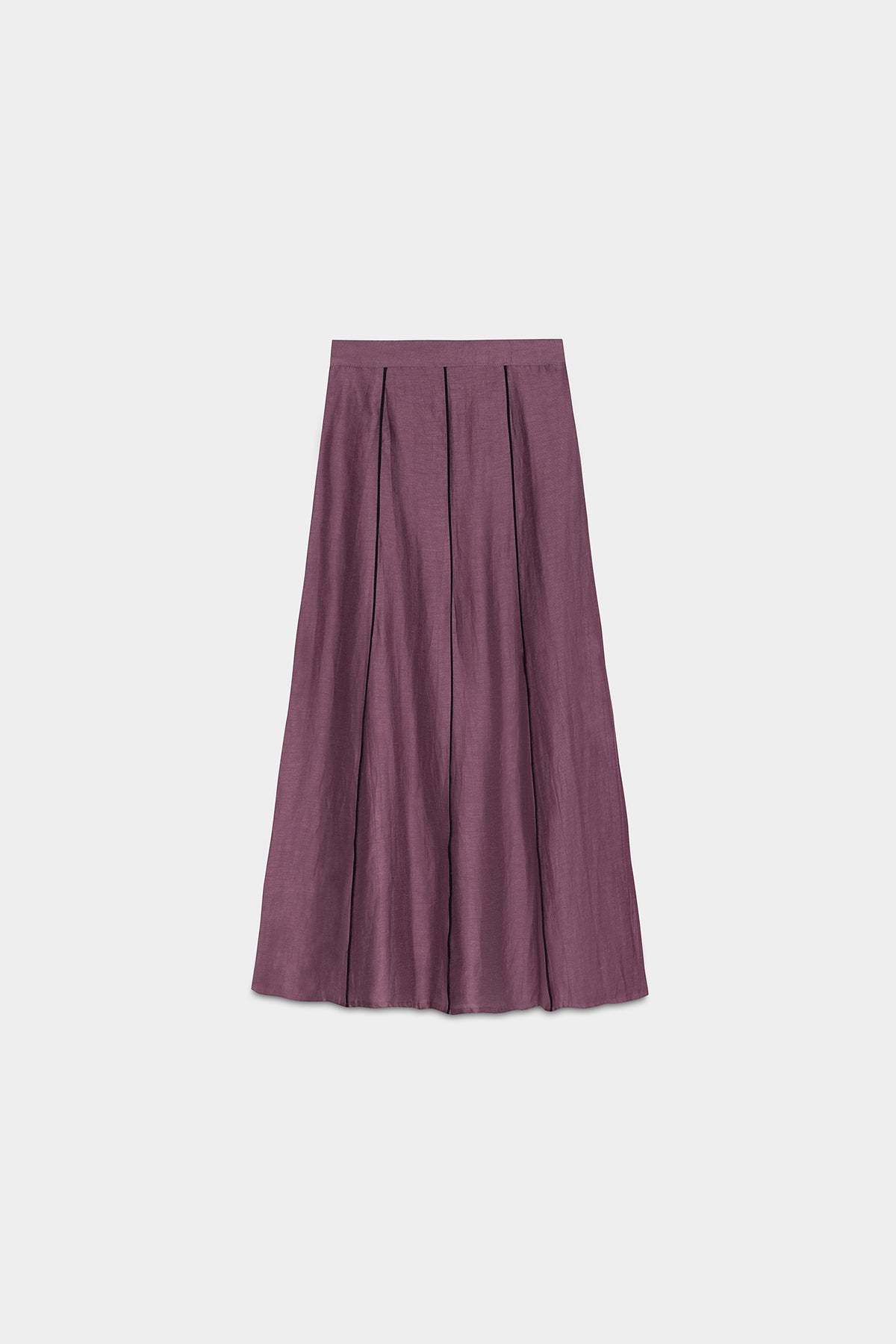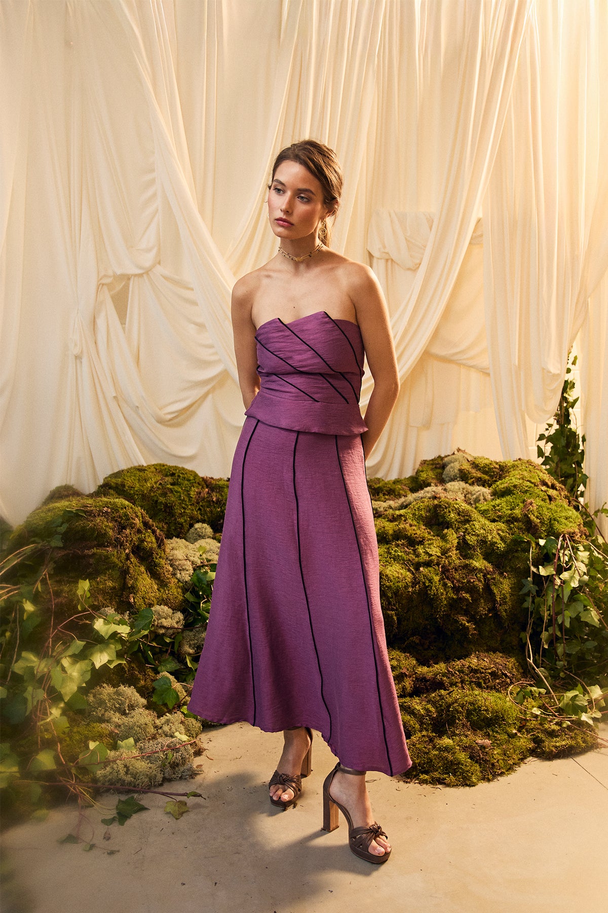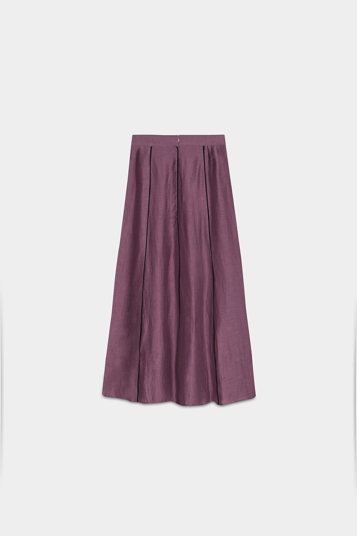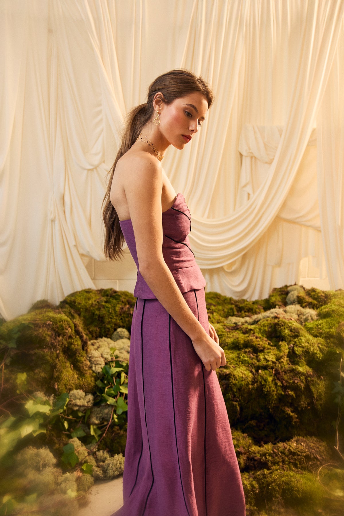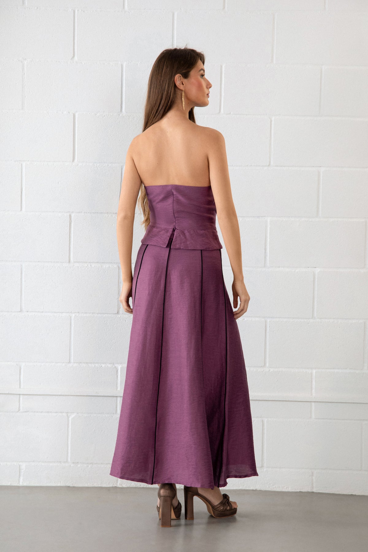 Falda Larga con Detalle de Costuras en contraste. Color morado en tendencia. Cierre con cremallera para un ajuste perfecto. Diseño elegante y sofisticado ideal para cualquier evento u ocasión especial. ¡Combínala con el Top Andrea a juego para conseguir un total look!