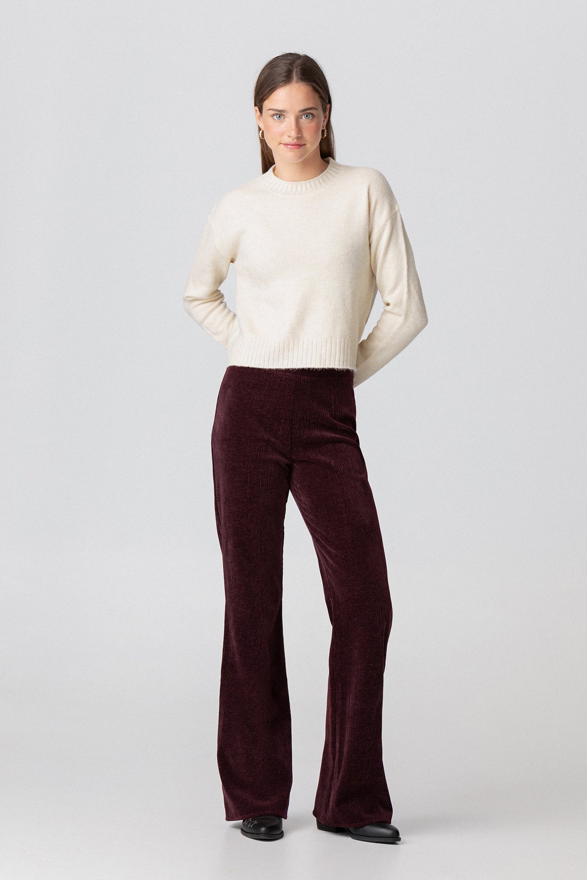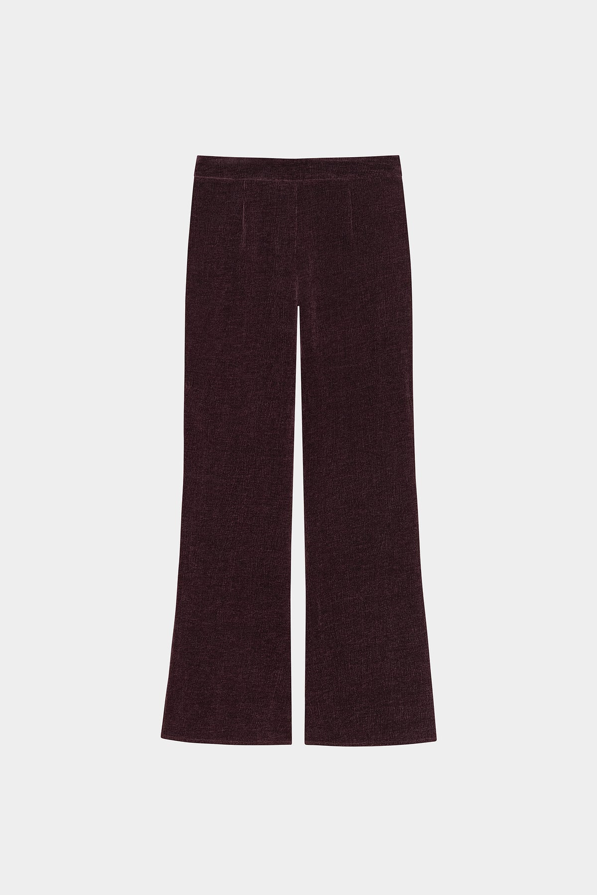Pantalón Largo de Terciopelo Burdeos con Detalle de Textura. Cintura elástica que se ajusta perfectamente. Talle alto y bajo acampanado. ¡Combínalo la blazer a juego para conseguir un look completo!