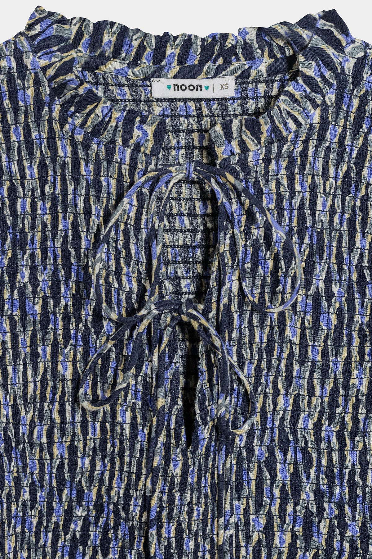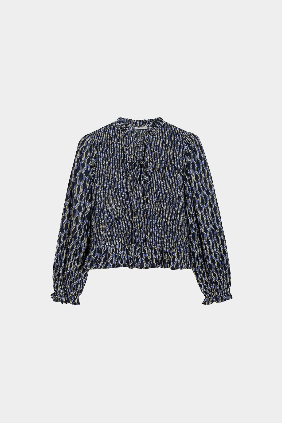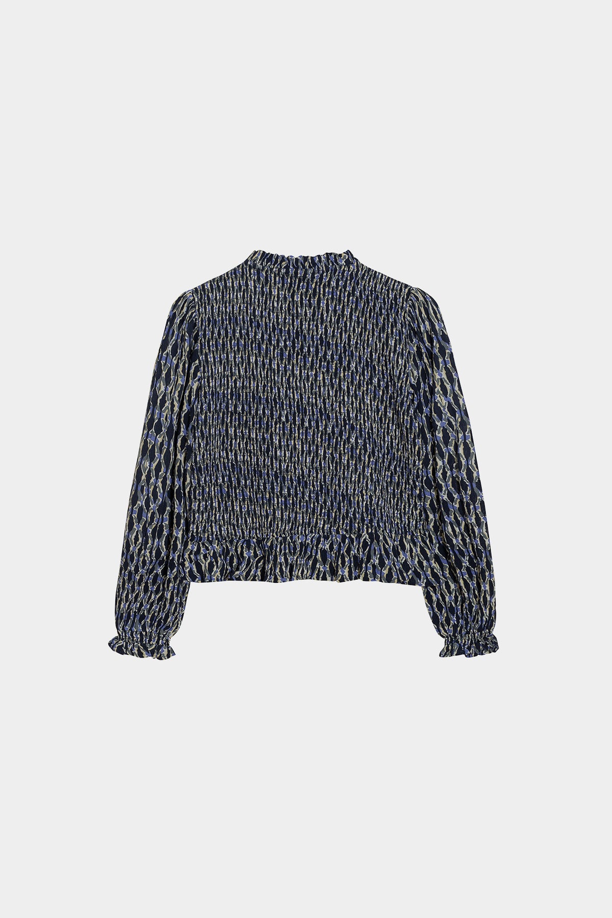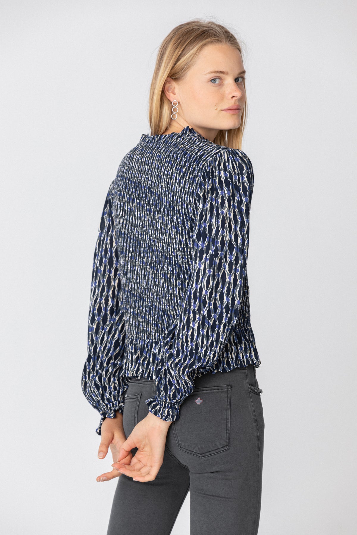 Top Estampado de Manga Larga y Tejido Fruncido. Tejido nido de abeja en el cuerpo que se ajusta a la perfección. Cierre con lazada en el escote y puños elásticos. Estampado en tendencia. ¡Combínalo con nuestros jeans y consigue un look completo!