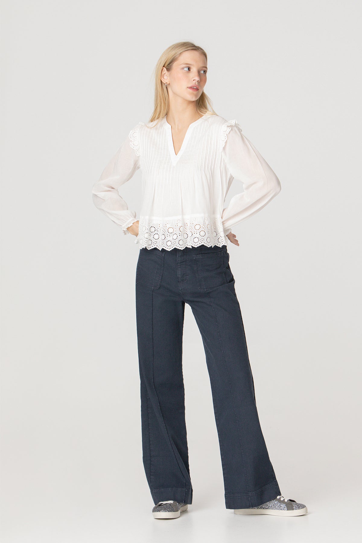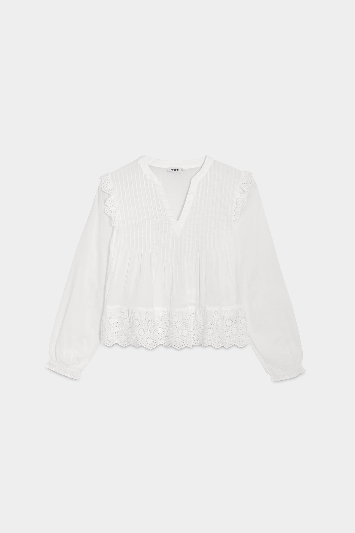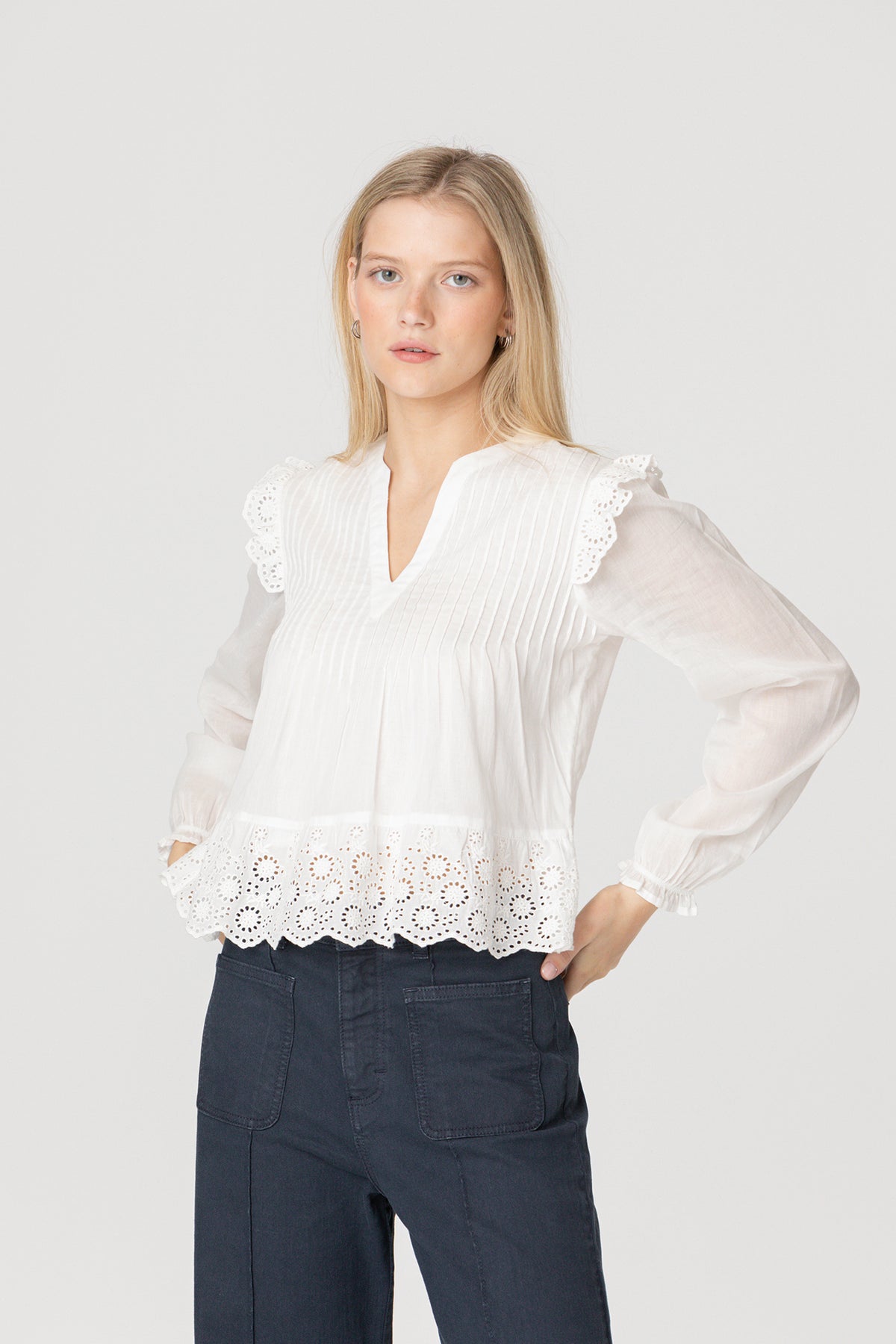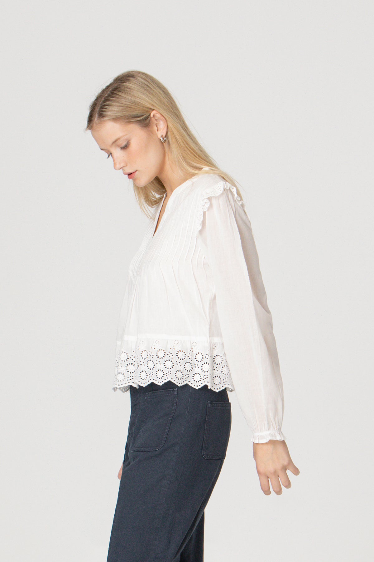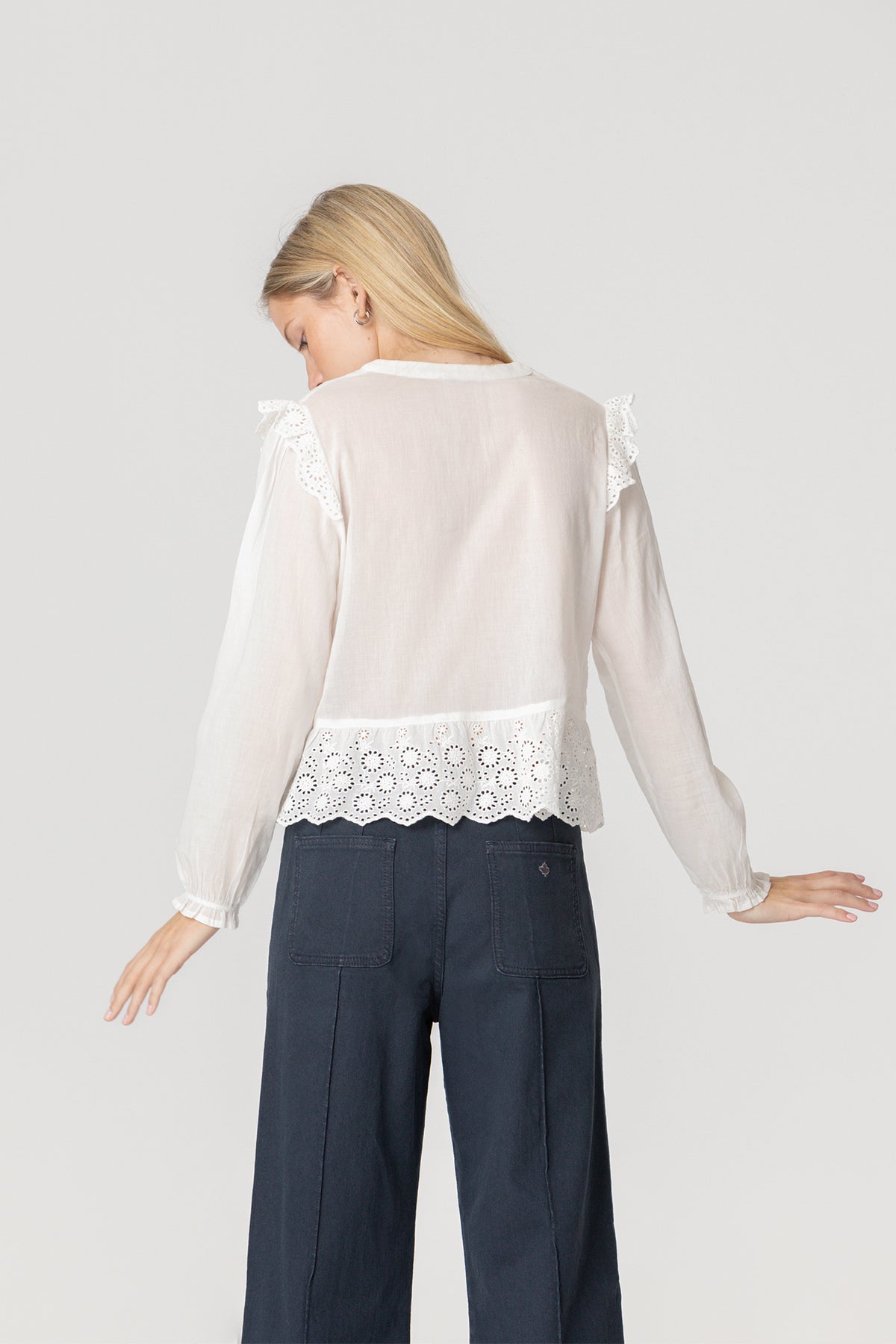 Blusa Blanca de Manga Larga con Volantes en los Hombros. Escote de Pico. Detalle de calados en el bajo y los hombros que aportan un toque elegante a la prenda. ¡Combínala con cualquiera de nuestros jeans y dale un toque elegante a tus looks diarios!