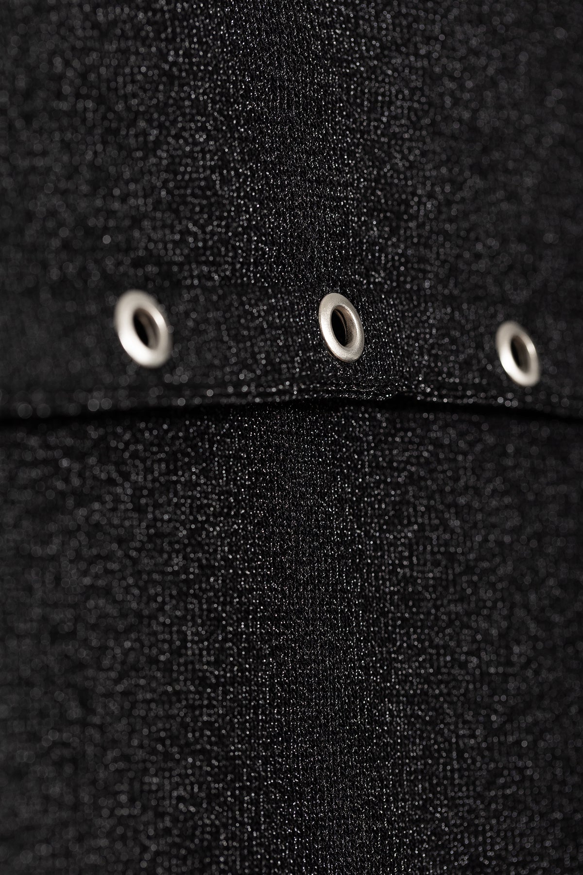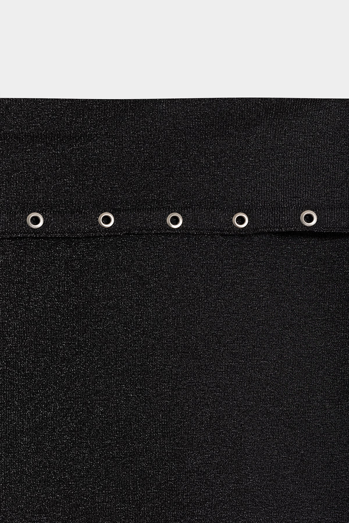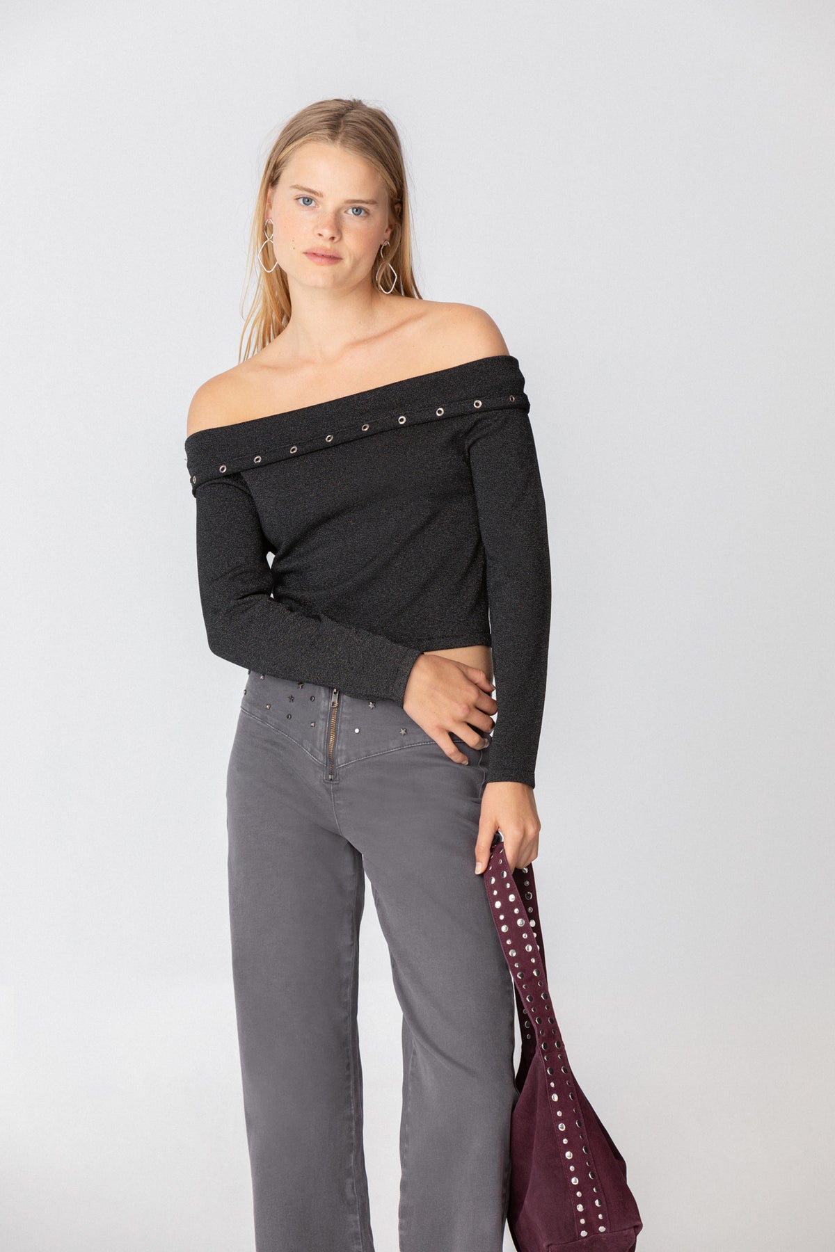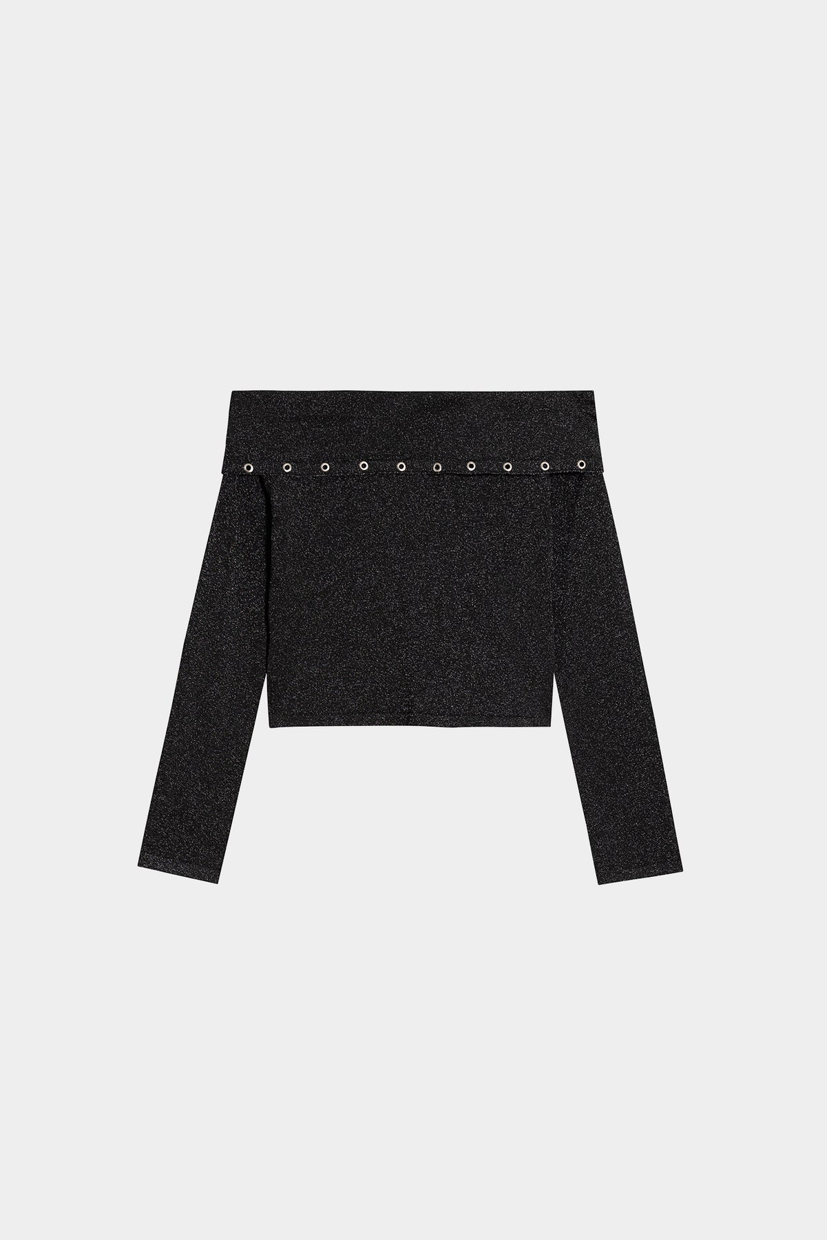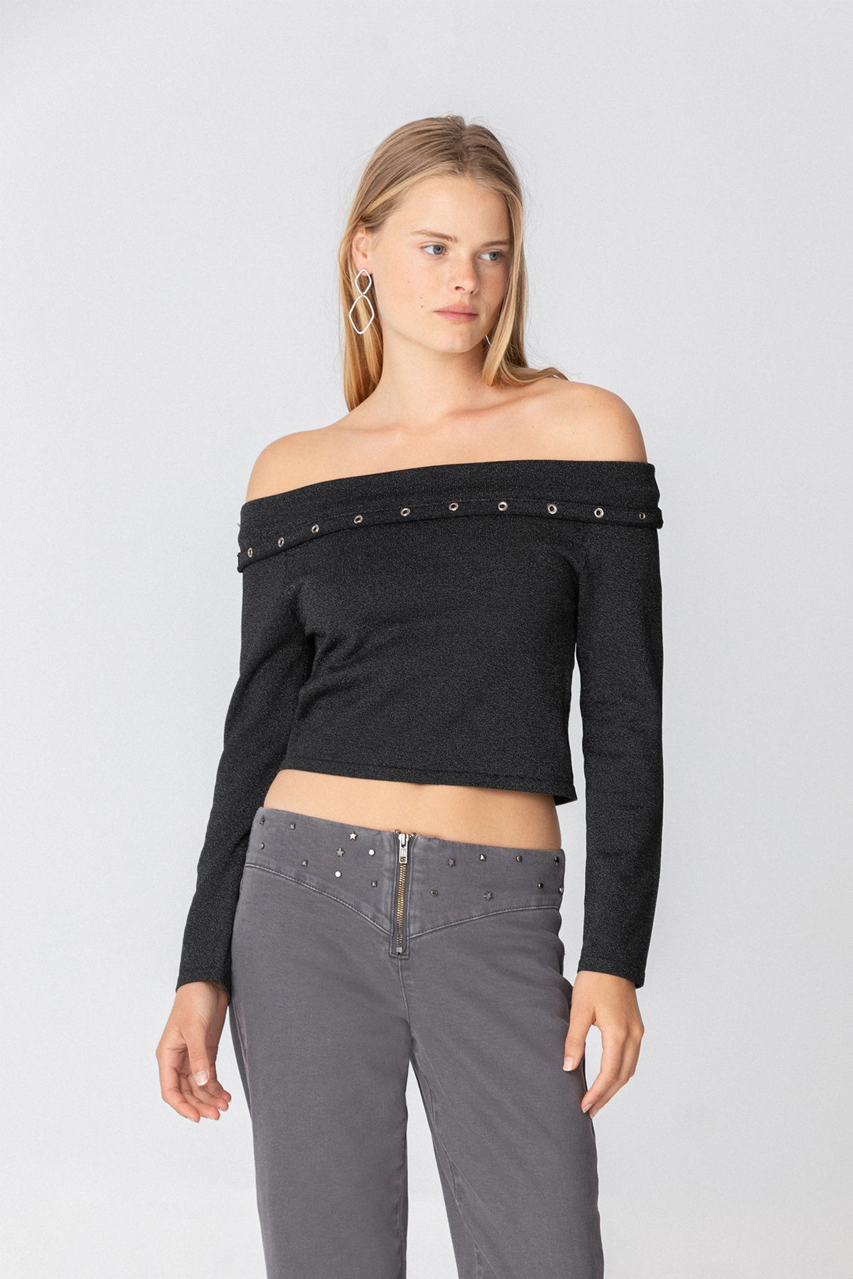 Top de manga larga con escote en palabra de honor, color Negro. Tejido con brillo que se ajusta perfectamente. Detalle de anillas en el escote. ¡Combínalo con cualquiera de nuestras faldas y consigue un look de noche ideal!
