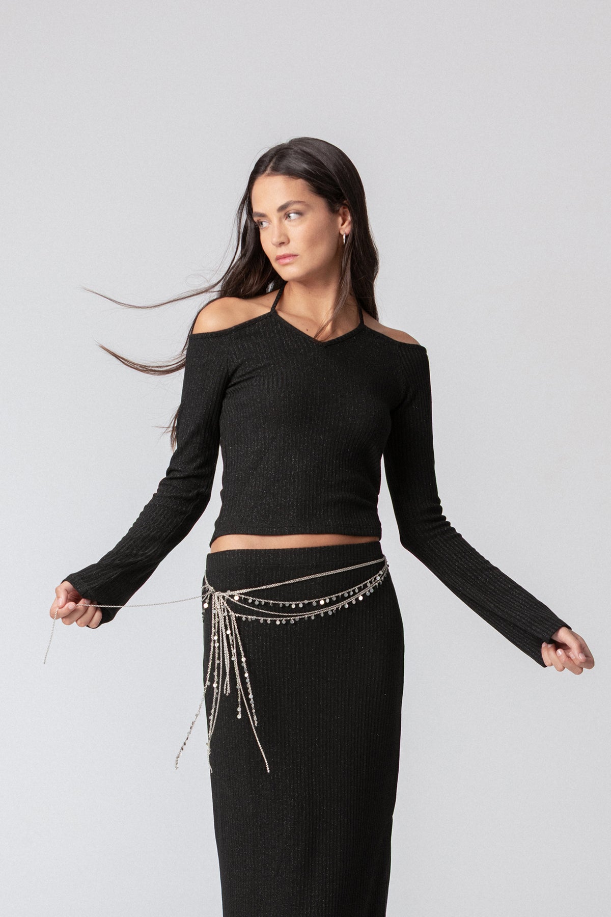 Top de Manga Larga con Hombros al Descubierto y Detalle Lurex. Tejido elástico con destellos lurex. Hombros al descubierto y lazada al cuello para un ajuste perfecto. ¡Combínalo con la falda a juego y consigue un total look deslumbrante en tus noches más especiales!