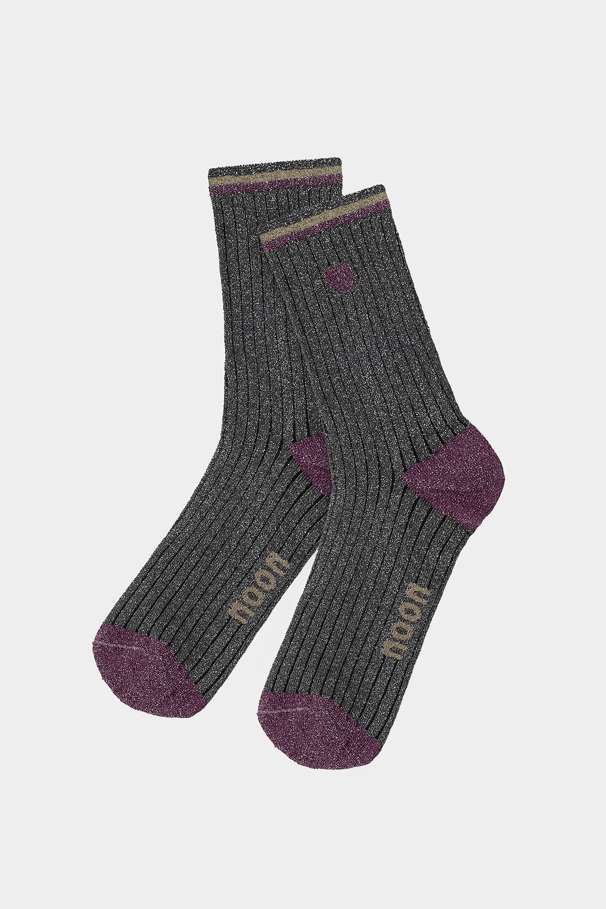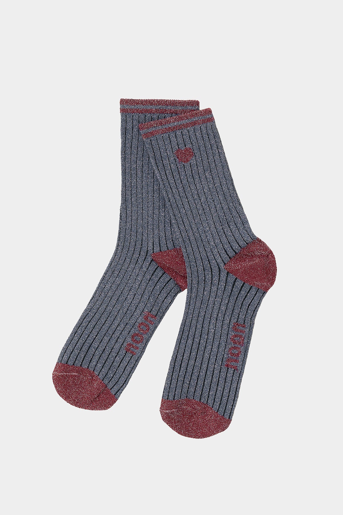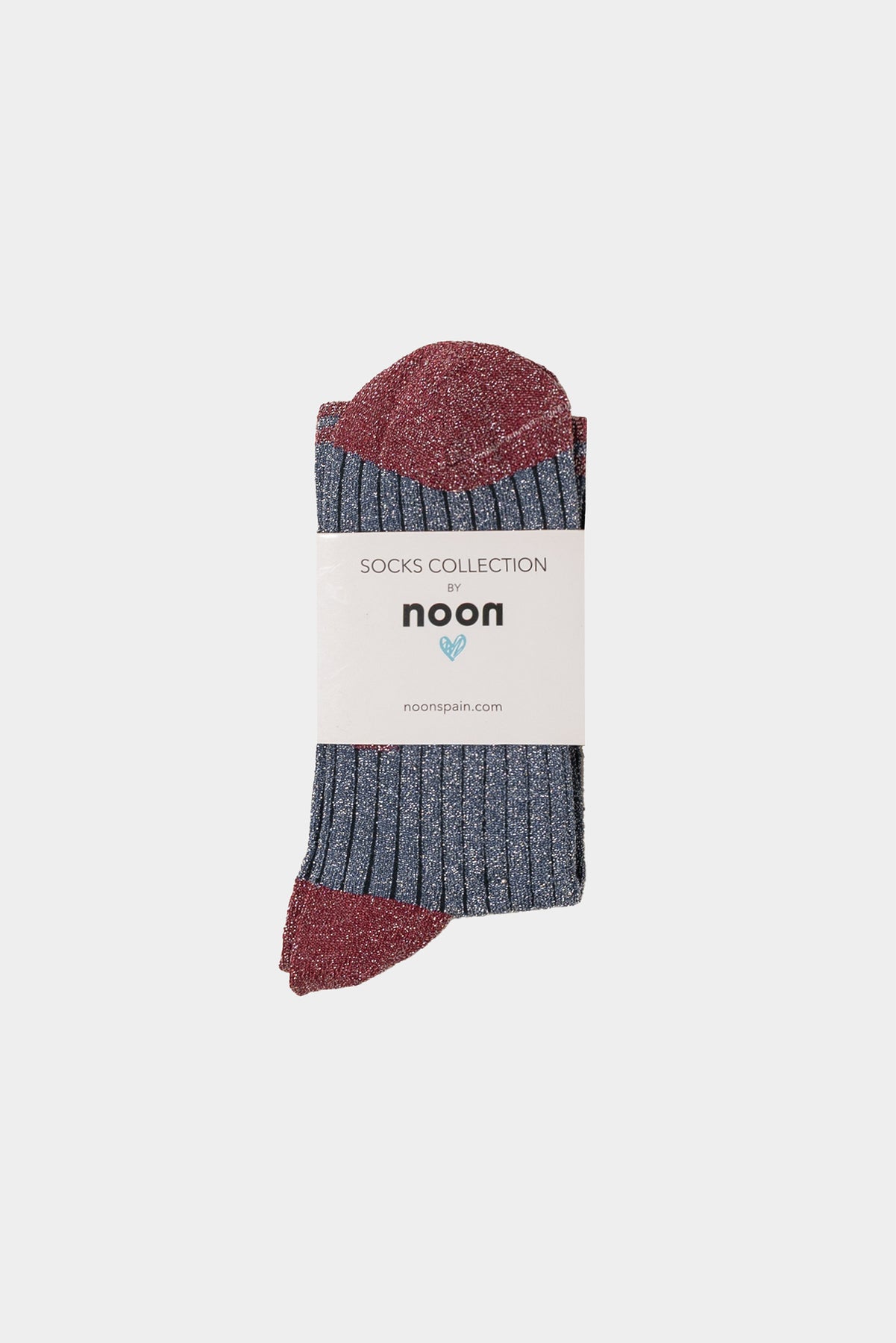 Calcetines de Rayas y Tejido Lurex con Brillo. Disponible en color Azul y Gris para que elijas tu favorito. Detalle del logo de noon en contraste. ¡Dale un toque de color a tus looks!
