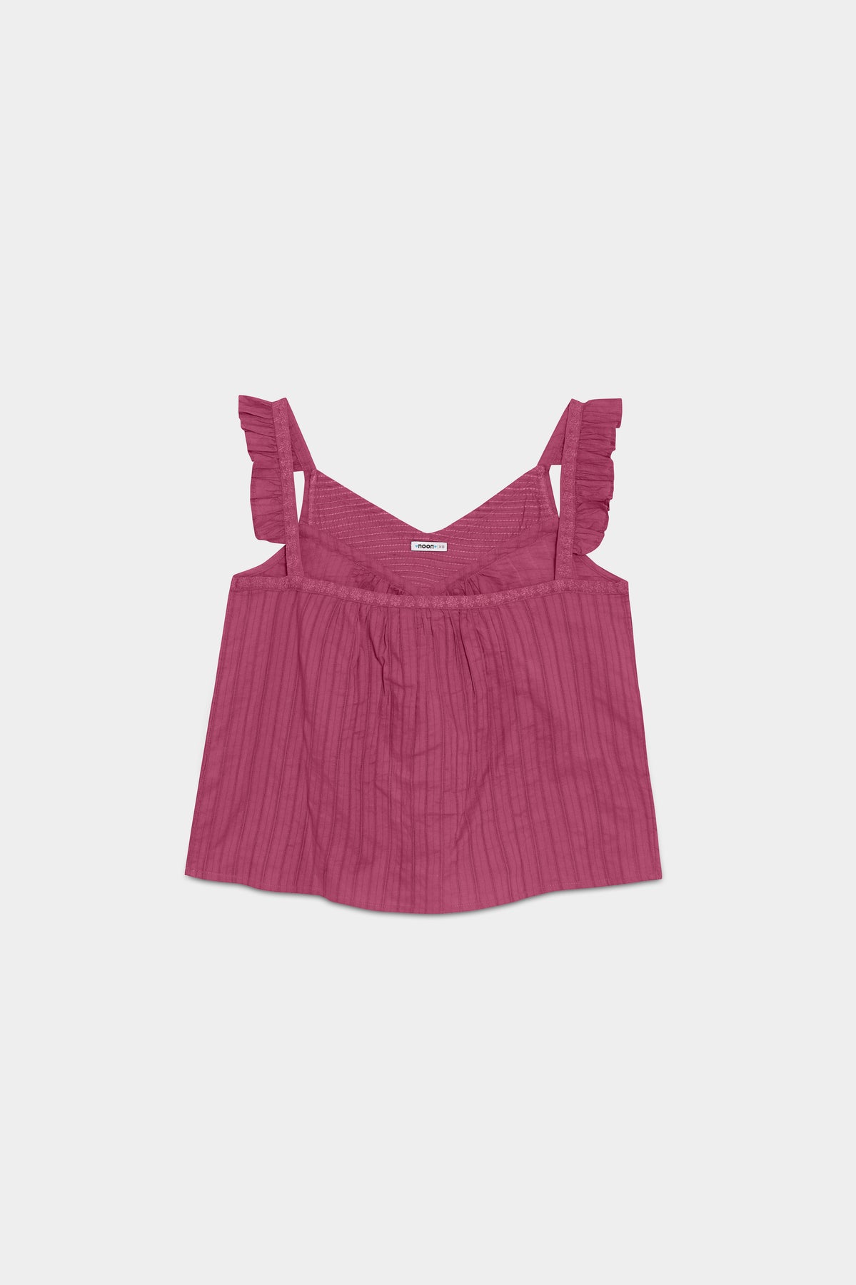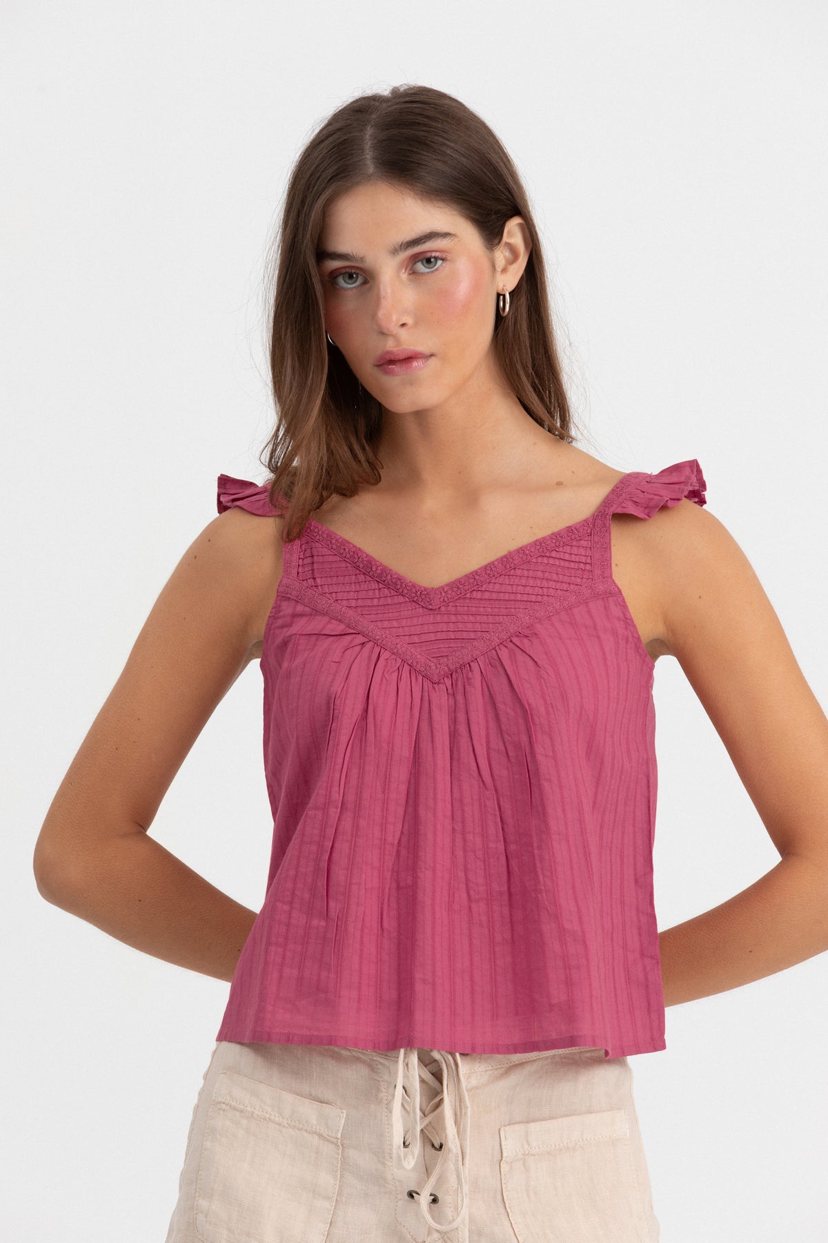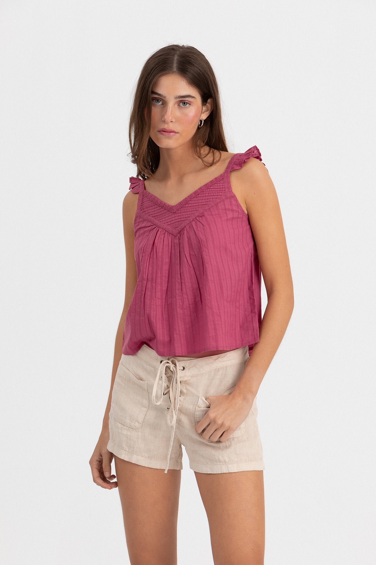 Top Sin Mangas con Tejido Fluido Color Burdeos. Escote de pico. El tejido fluido aporta movimiento a la prenda. Detalle de jaretas y volantes en las mangas. ¡Puedes combinarlo con cualquiera de nuestras faldas, jeans o shorts!