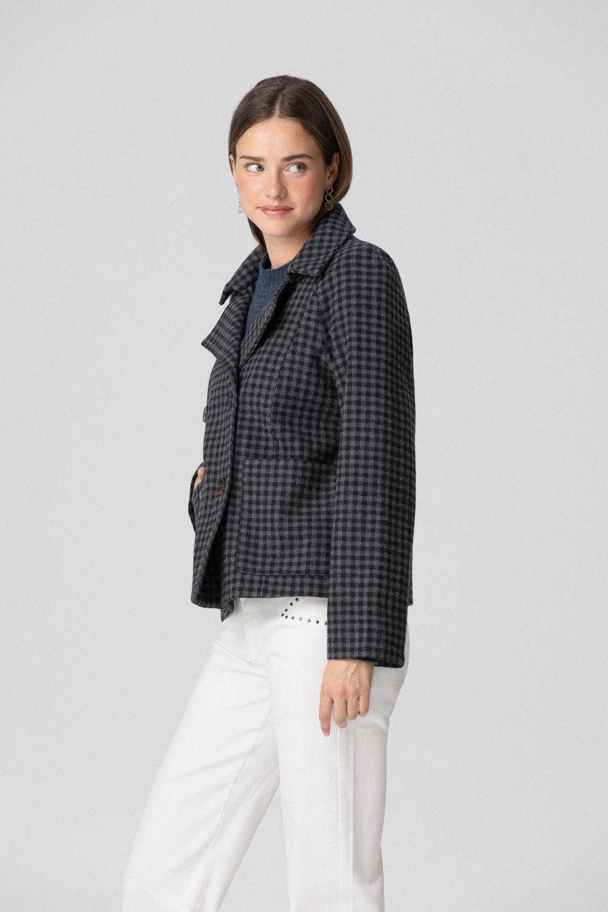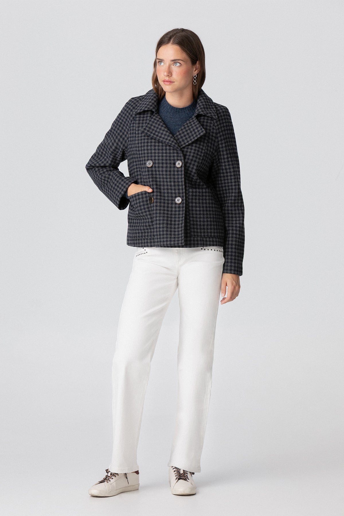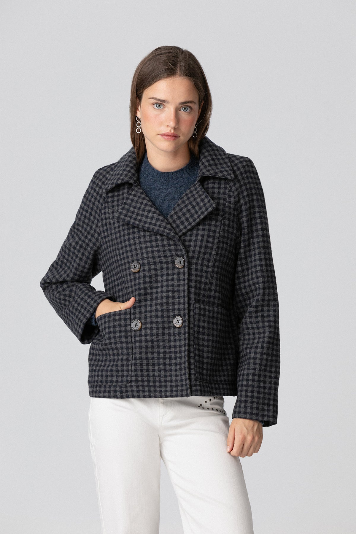 Short Blue Check Coat. Double-breasted closure with four front buttons. Elegant and versatile design, ideal for fall and winter. Perfect for any occasion. Get it now!