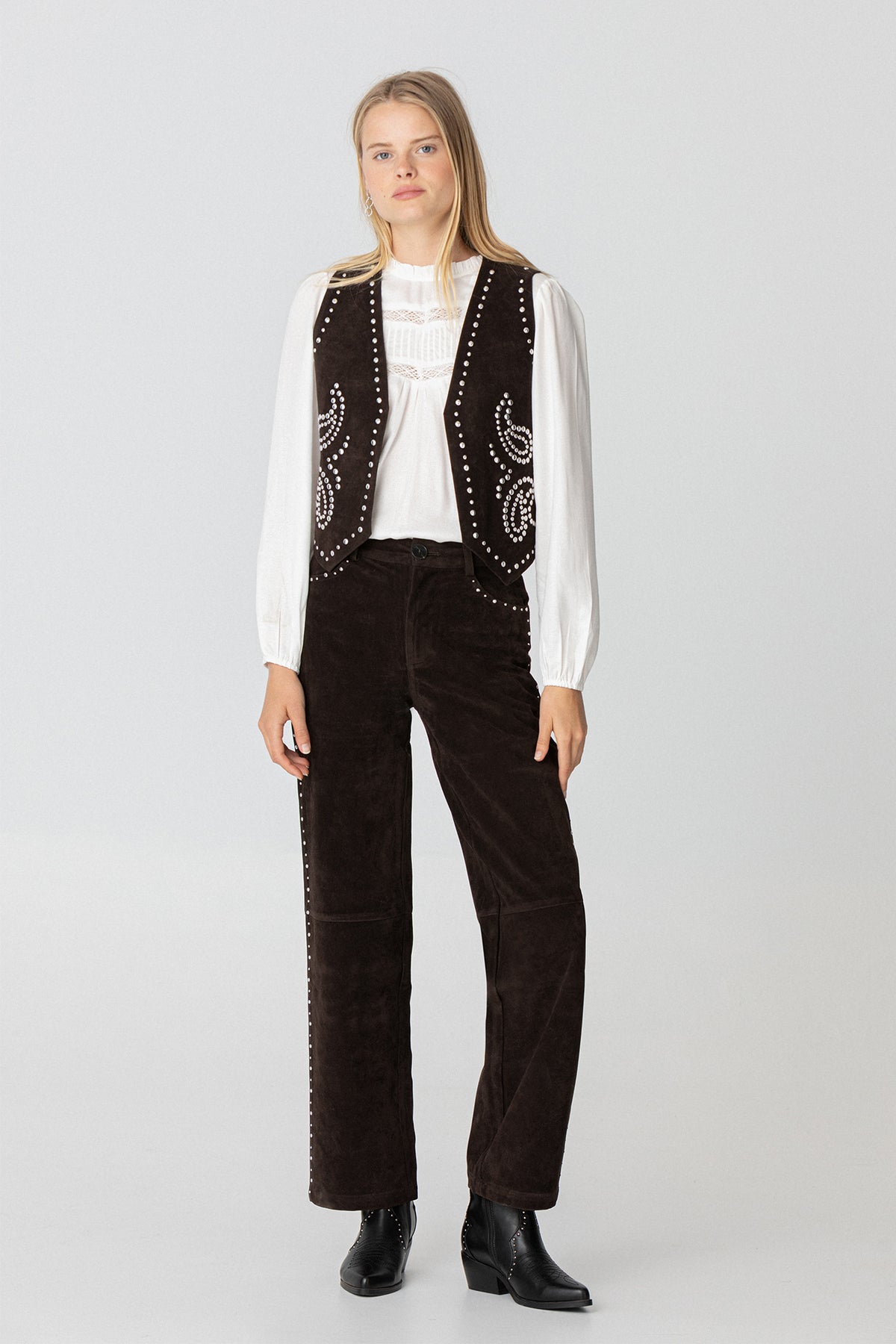 Suede Vest with Stud Detail. Vest without Trendy brown suede sleeves. The stud detail adds a touch of style. different from the garment. Combine it with our jeans and turn it into a a must-have for the season!