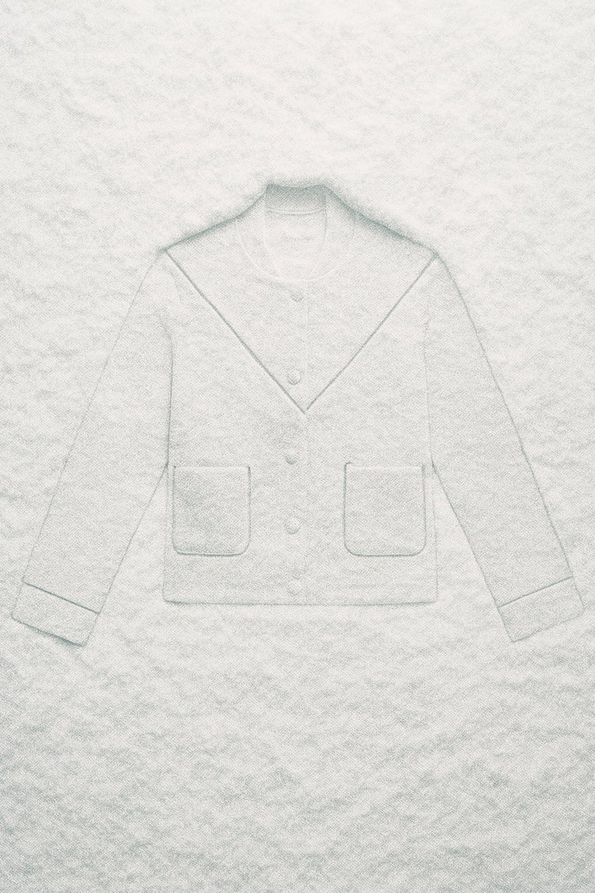 Cropped herringbone jacket in gray. Mandarin collar, two pockets, and front button closure. Contrasting black details add a casual touch. Get it now!