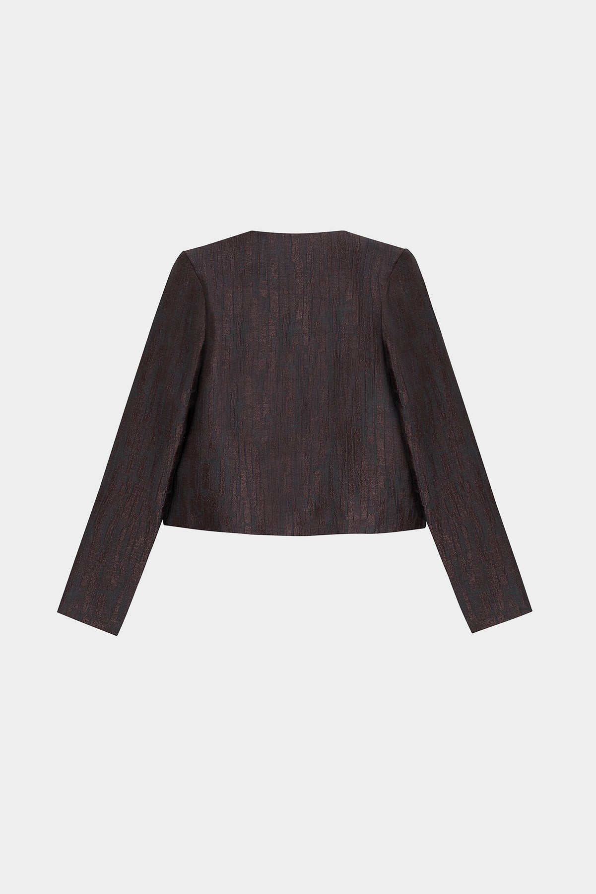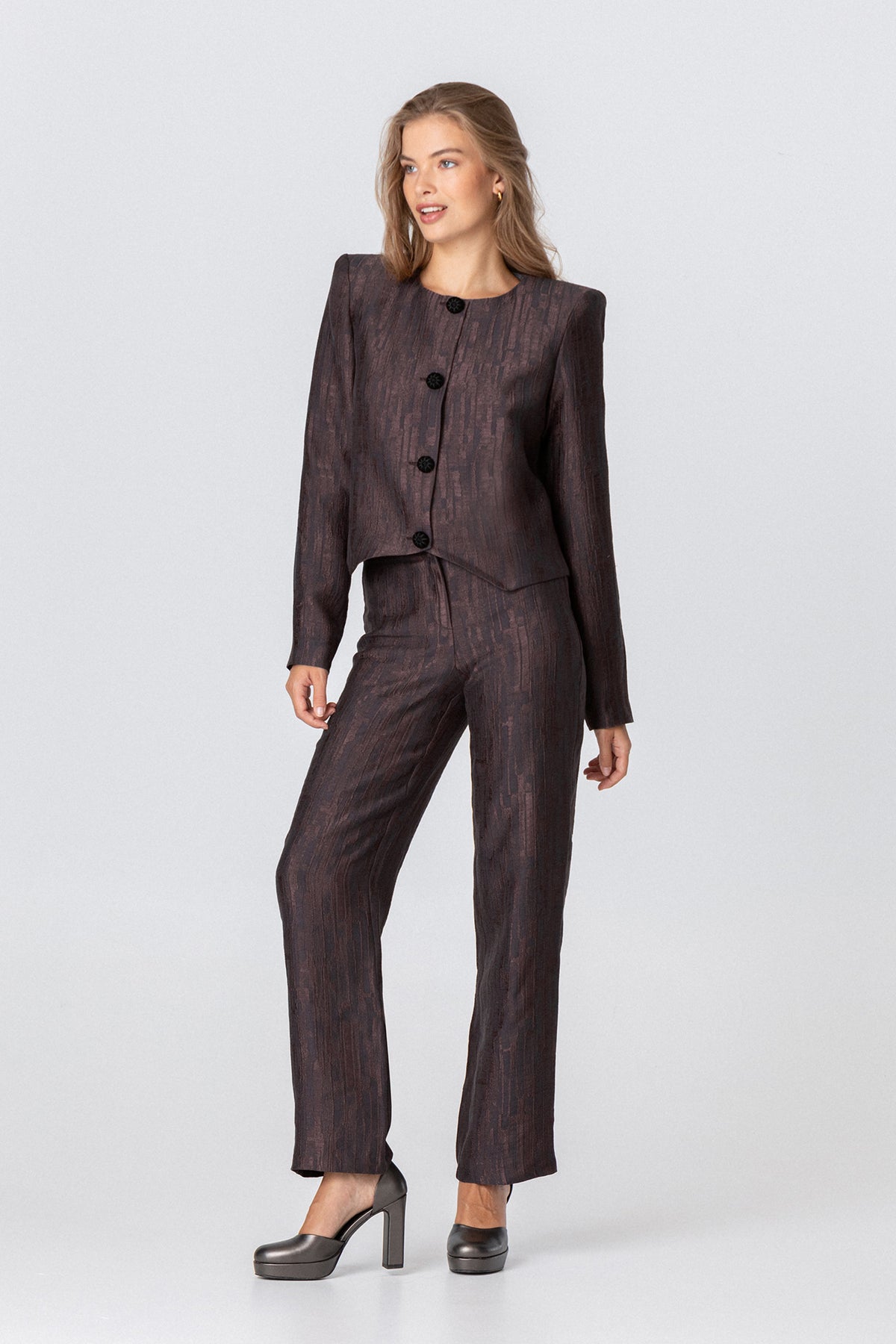 Cropped blazer with purple shoulder pads. Zipper closure. Front with covered buttons. Lurex fabric detail with shine. Combine it with the matching PANTS and get a complete look to look radiant at your next event!