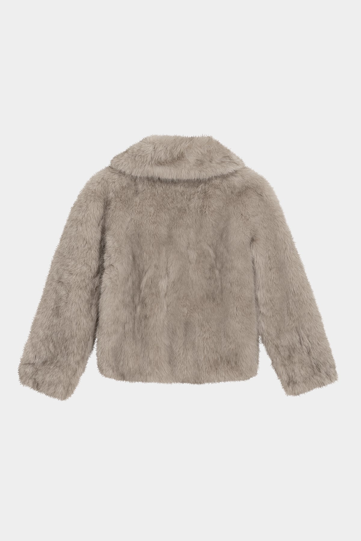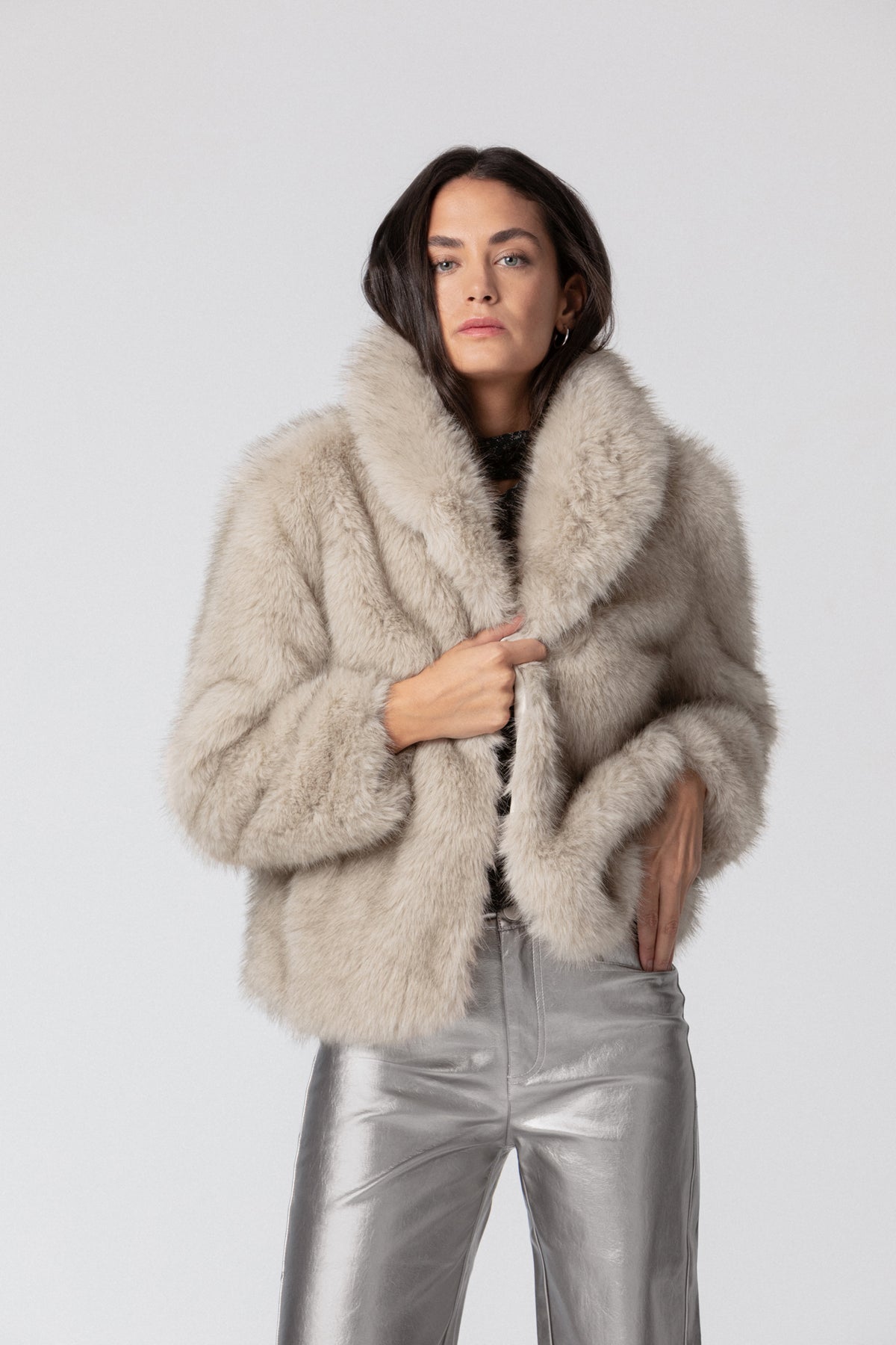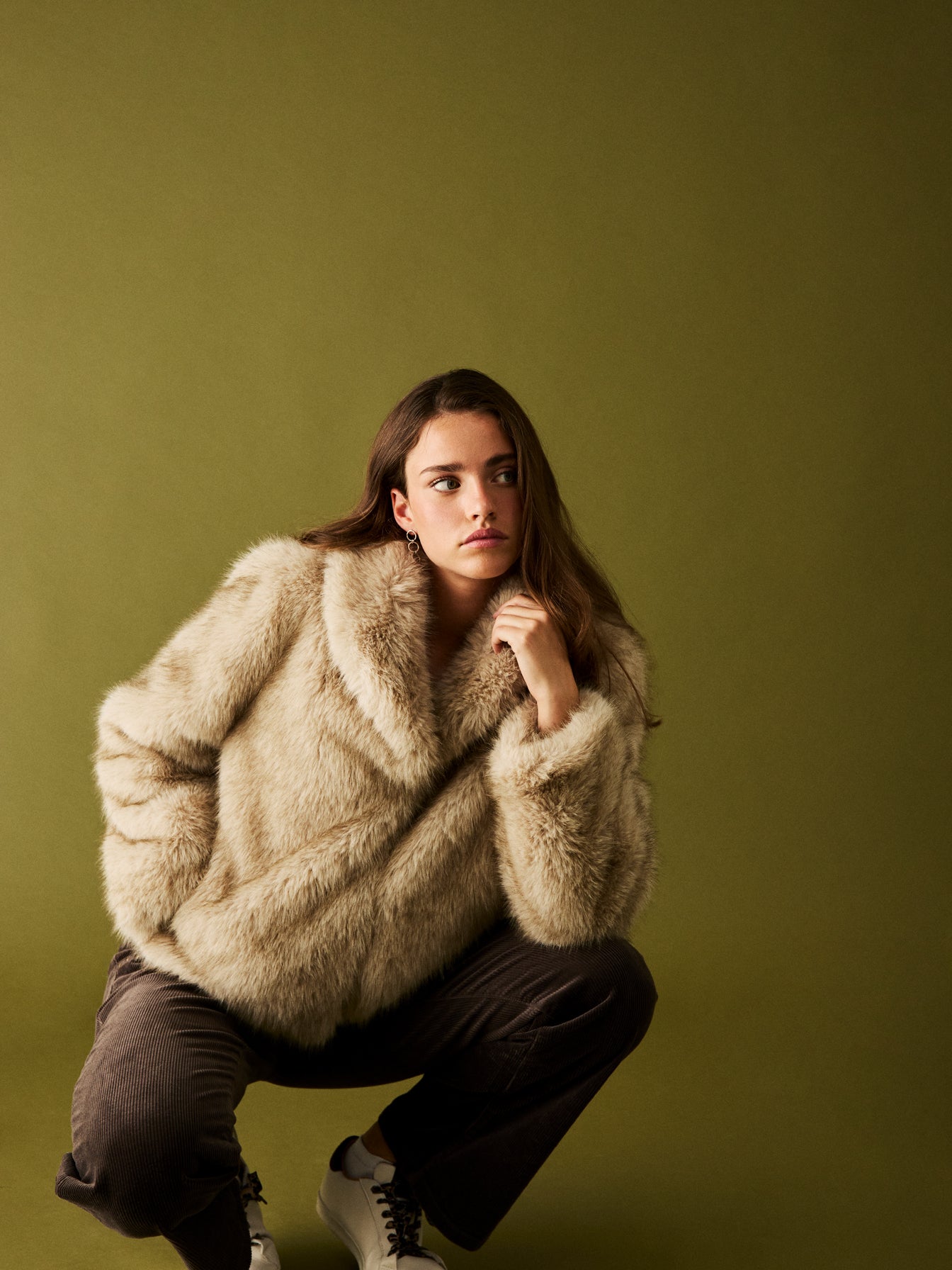 Long-sleeved faux fur jacket in ecru. Soft fabric. Snap closure and two side pockets. Fully lined. Get a formal and elegant look by pairing it with any of our pants!