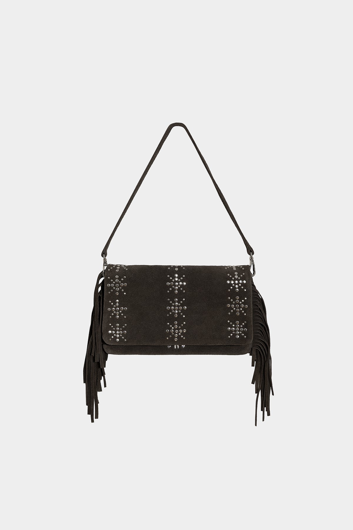 Leather Bag with Studs and Fringes. Brown color, Trendy studs and fringes. Noon logo on the front. Pocket Zippered interior. The perfect complement to your everyday looks!