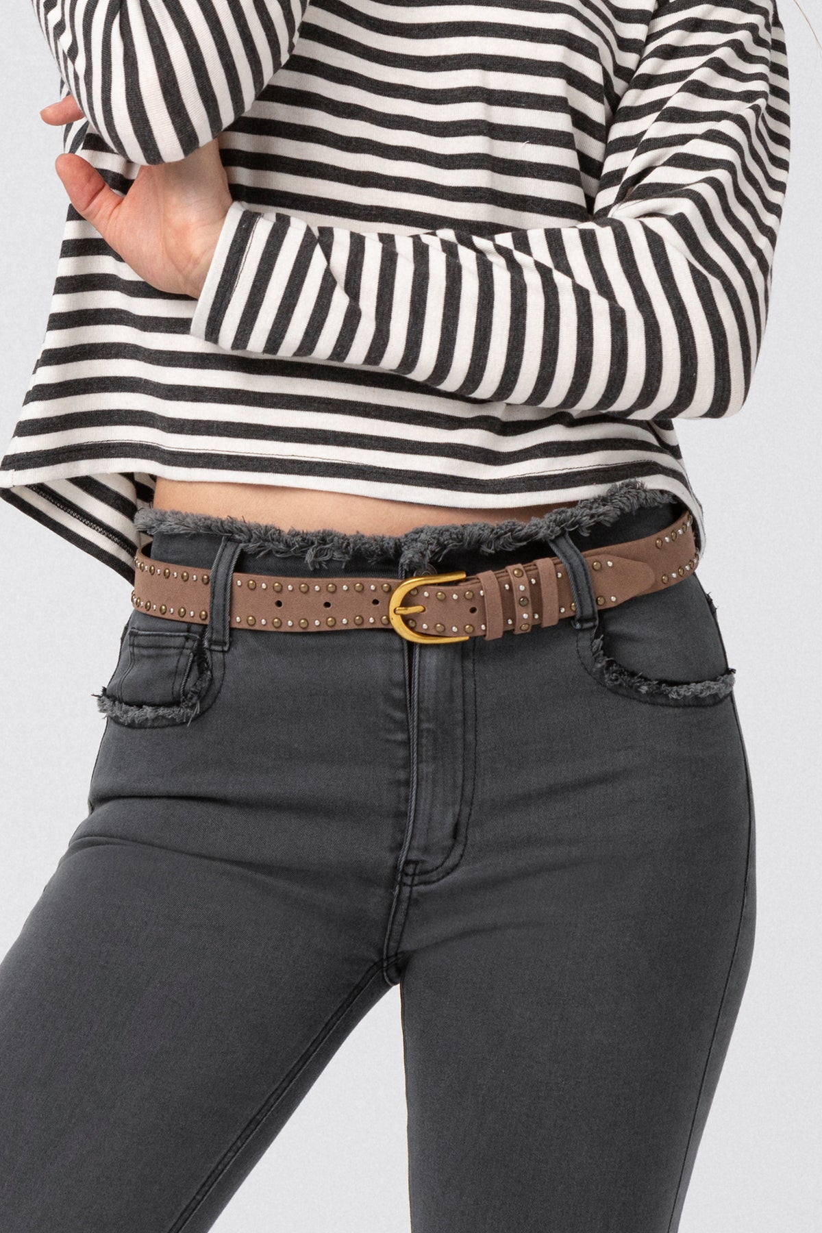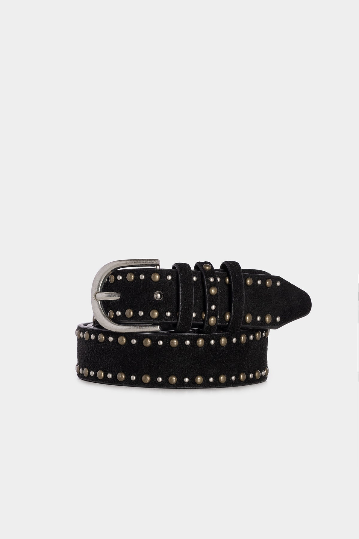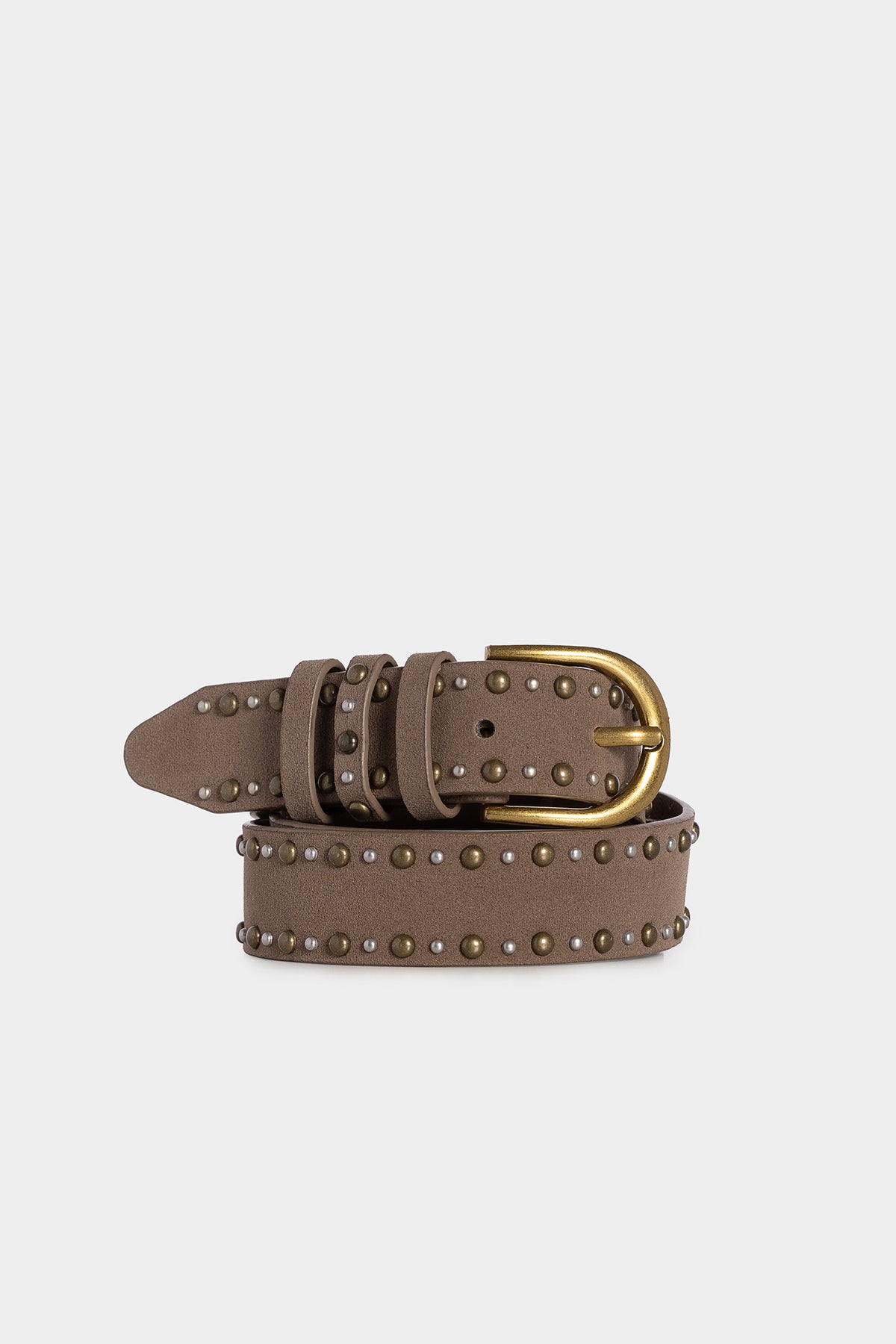 Suede Belt with Stud Detail. Available in brown and black. Metal buckle. Stud detailing in gold and silver tones. The perfect complement to your look!