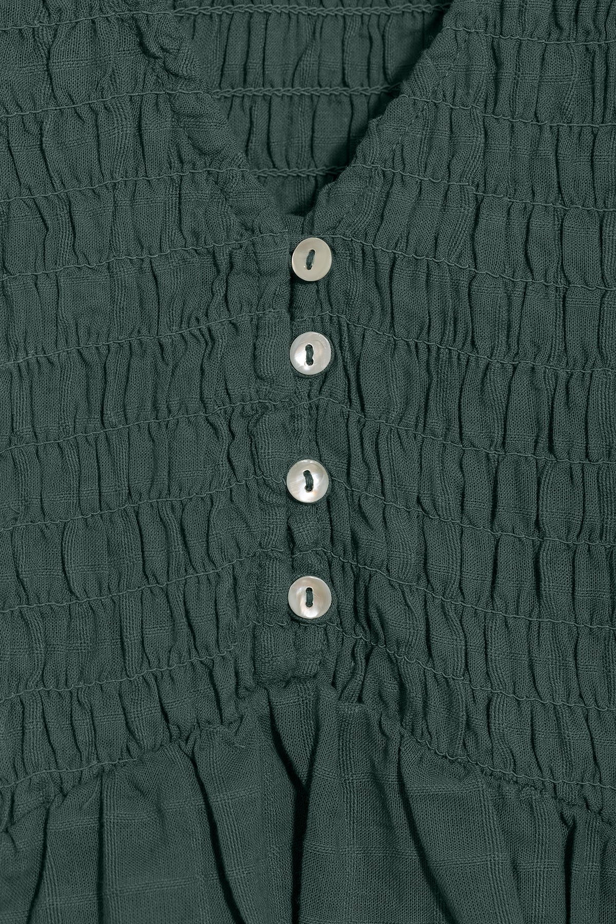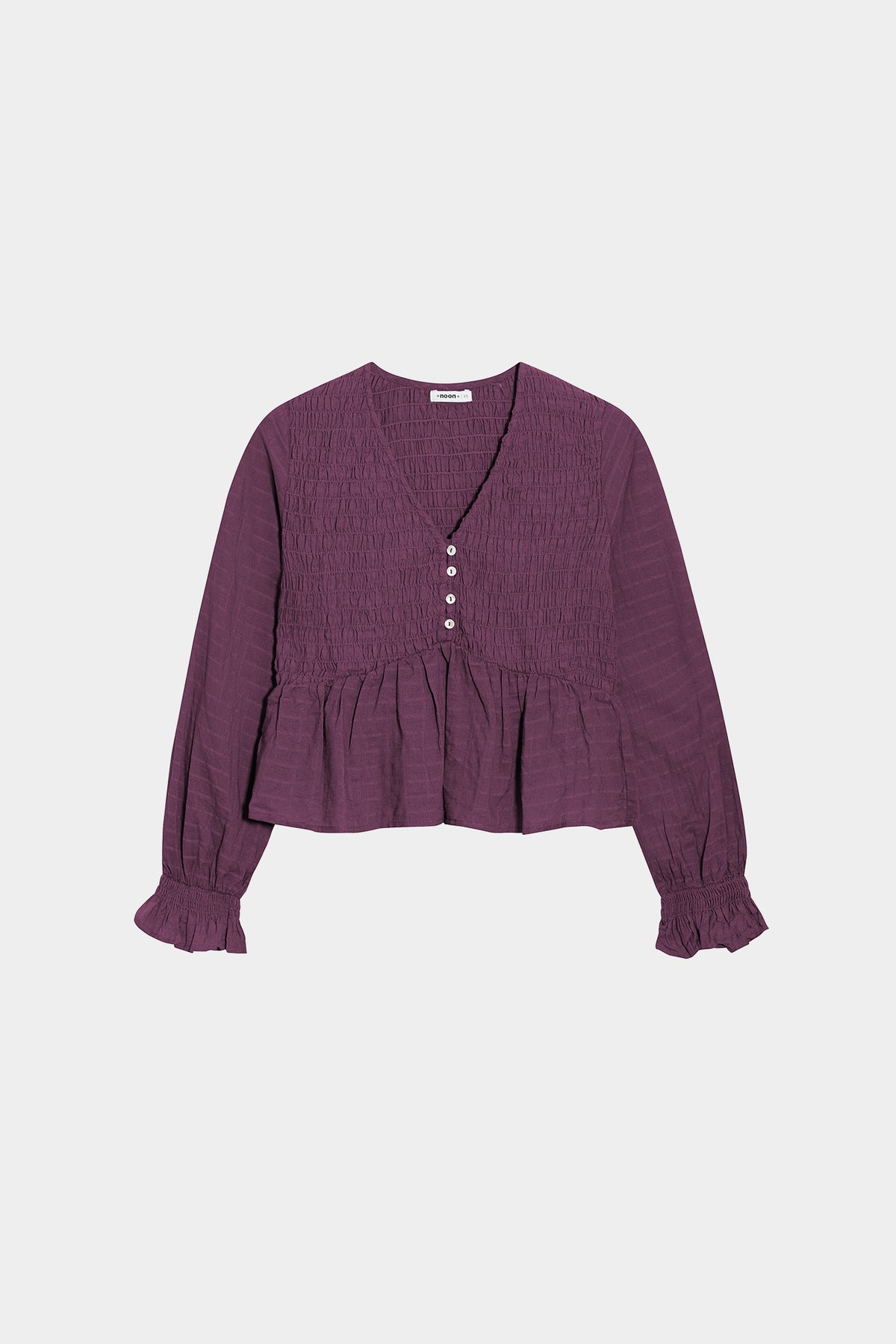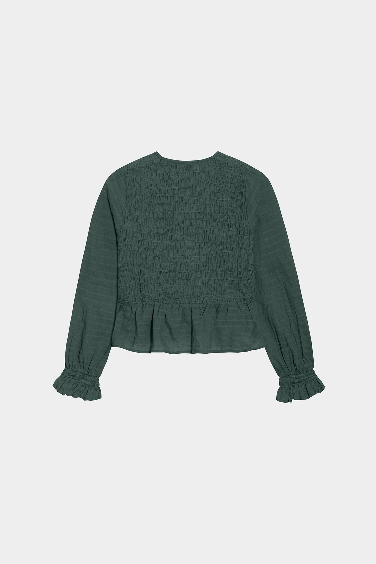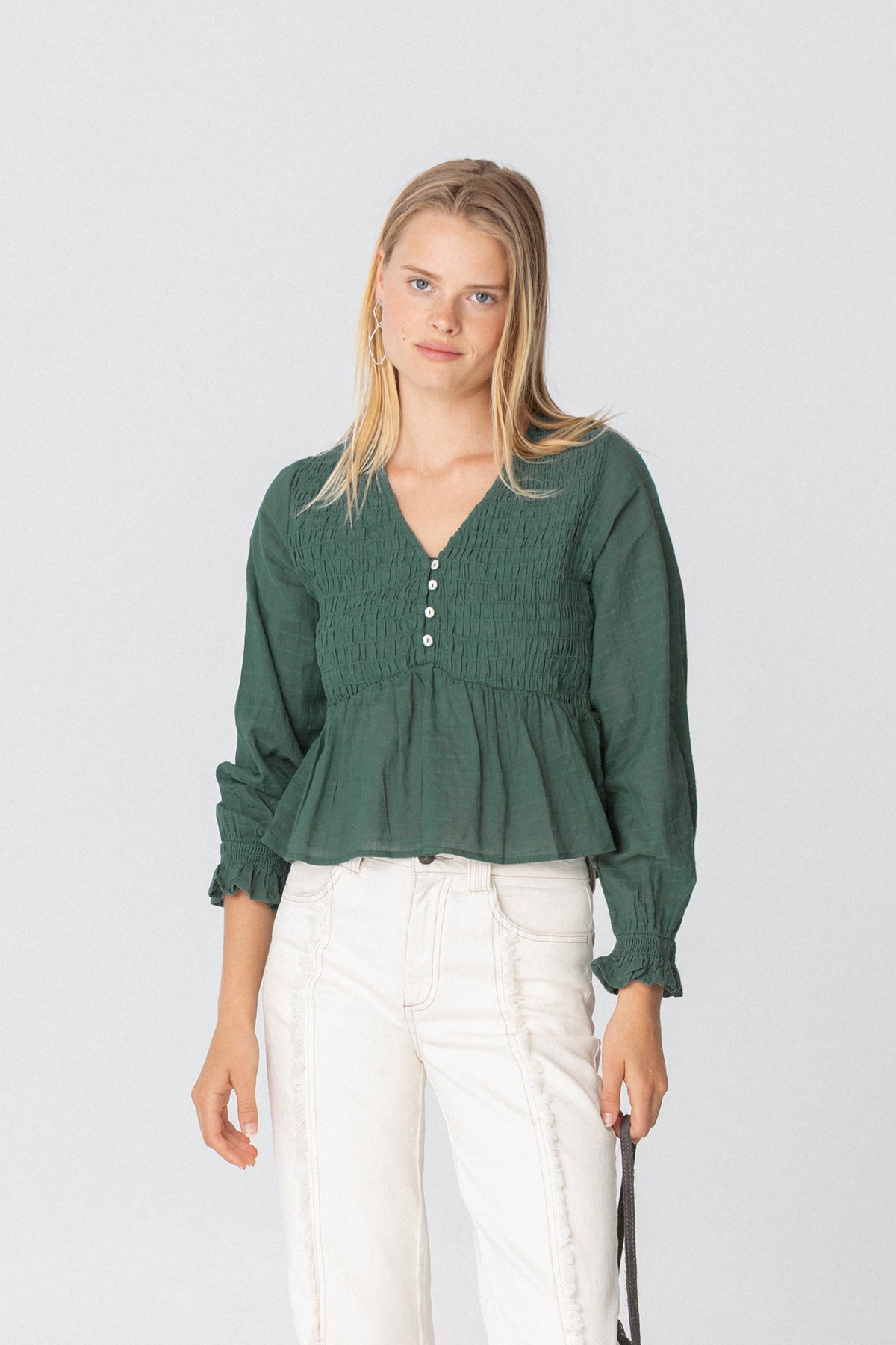 Gathered cotton blouse with a V-neckline and front button closure. Elastic cuffs for a perfect fit. Pair it with any of our jeans and look radiant every day!