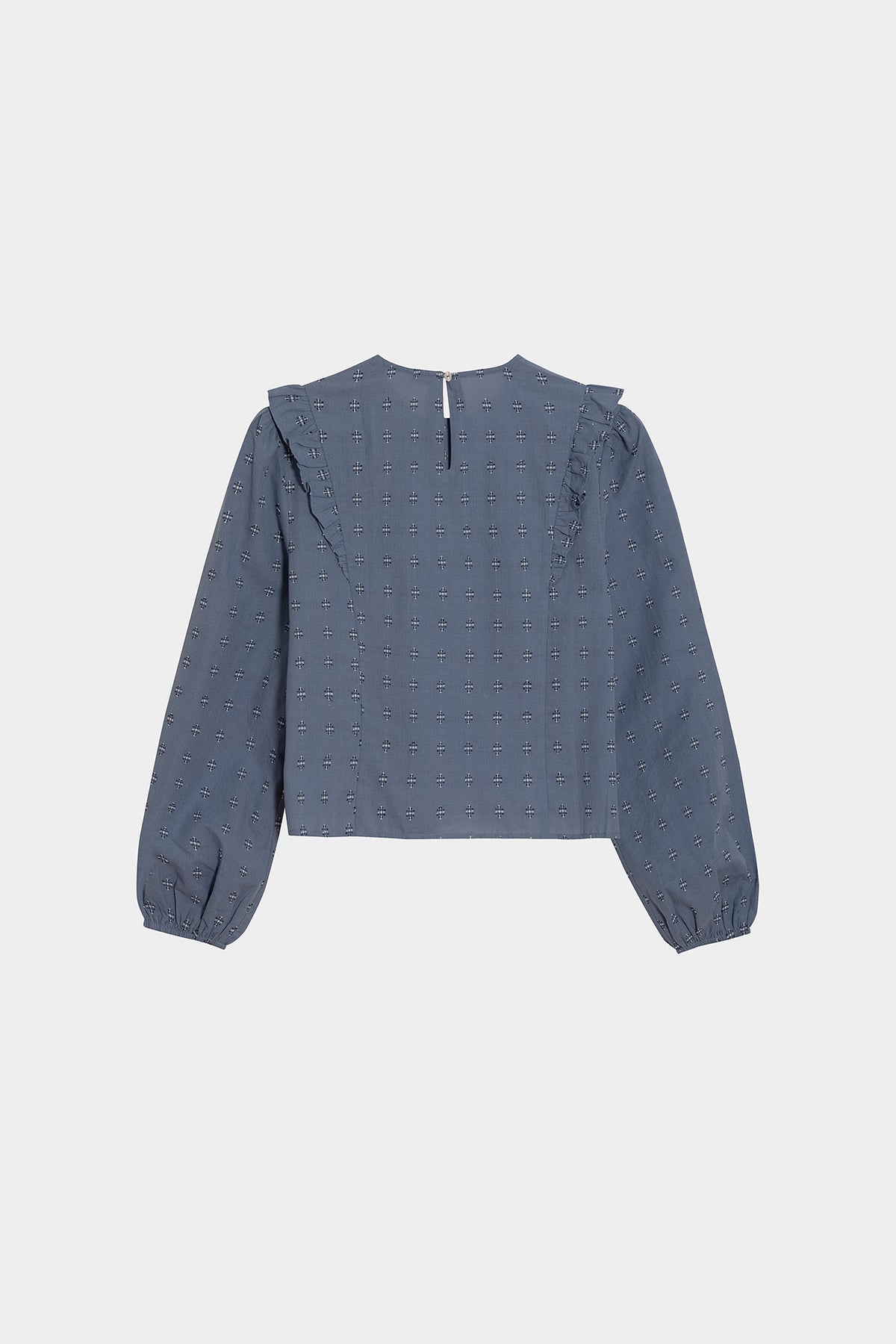 Long-sleeved blouse with ruffle detail. Blue color and printed fabric. Ruffles on the shoulders add a youthful touch to the garment . Elastic sleeves and button closure at the neck. Get it and set the trend this season!