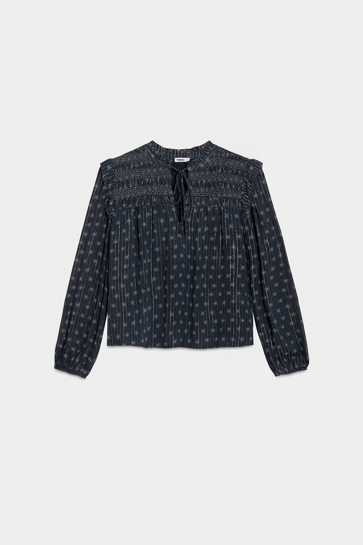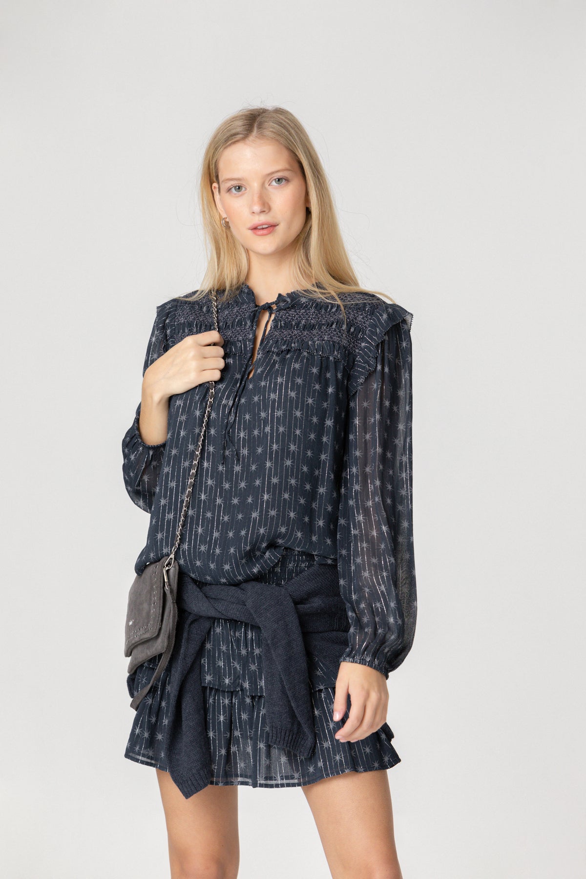 Flowy printed blouse with long sleeves. Fabric Lurex with shimmer and gathered detail. Tie at the neck for an adjustable fit. Perfect ! Pair it with the matching gathered mini skirt for a complete look. Looks perfect!