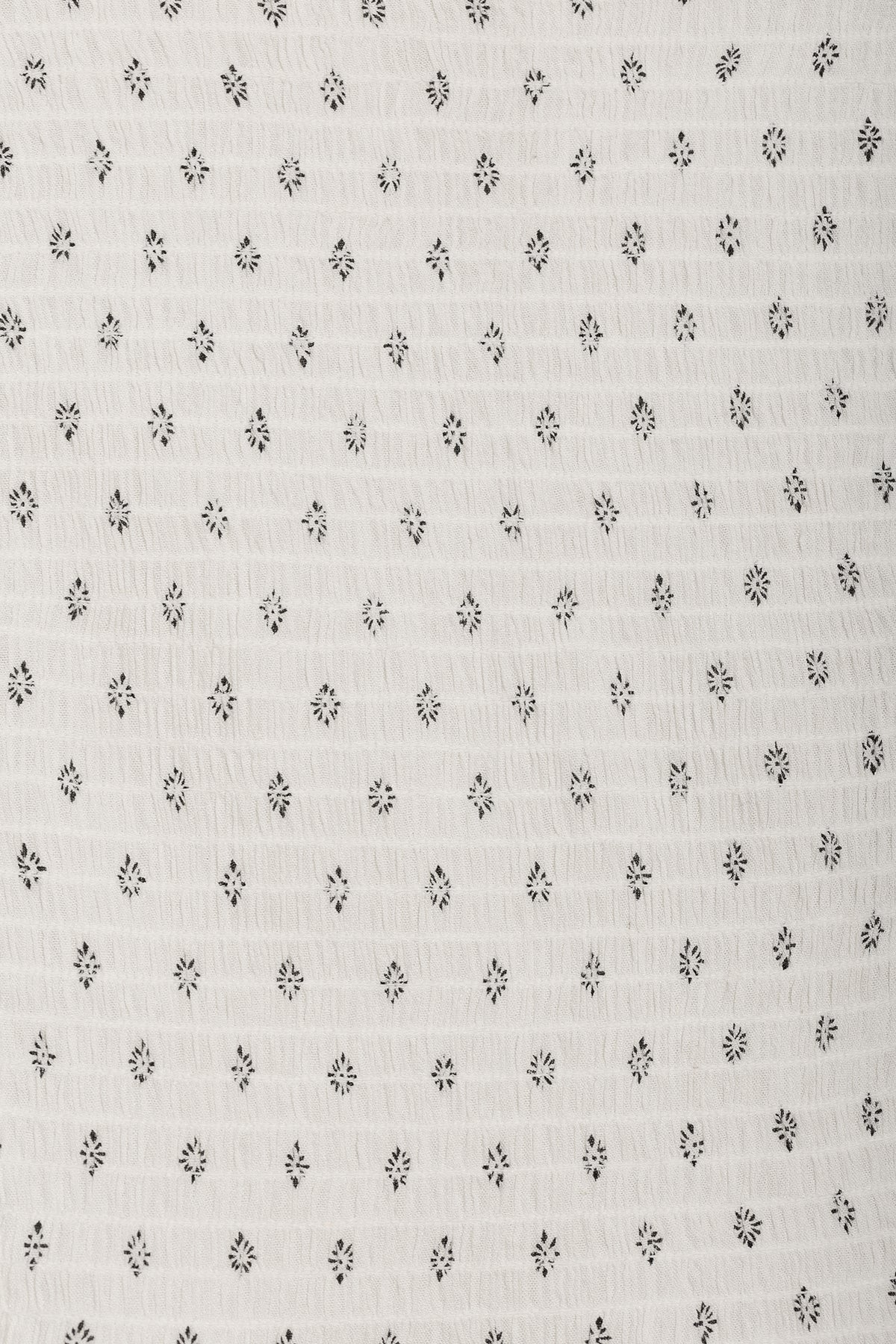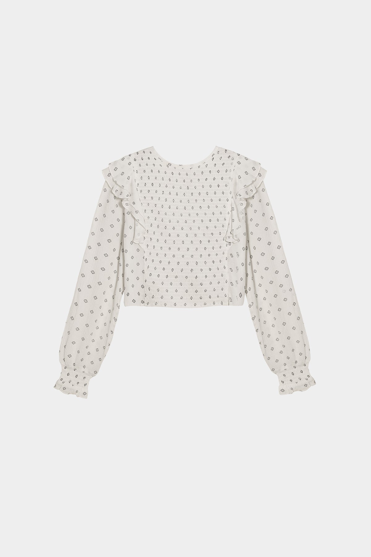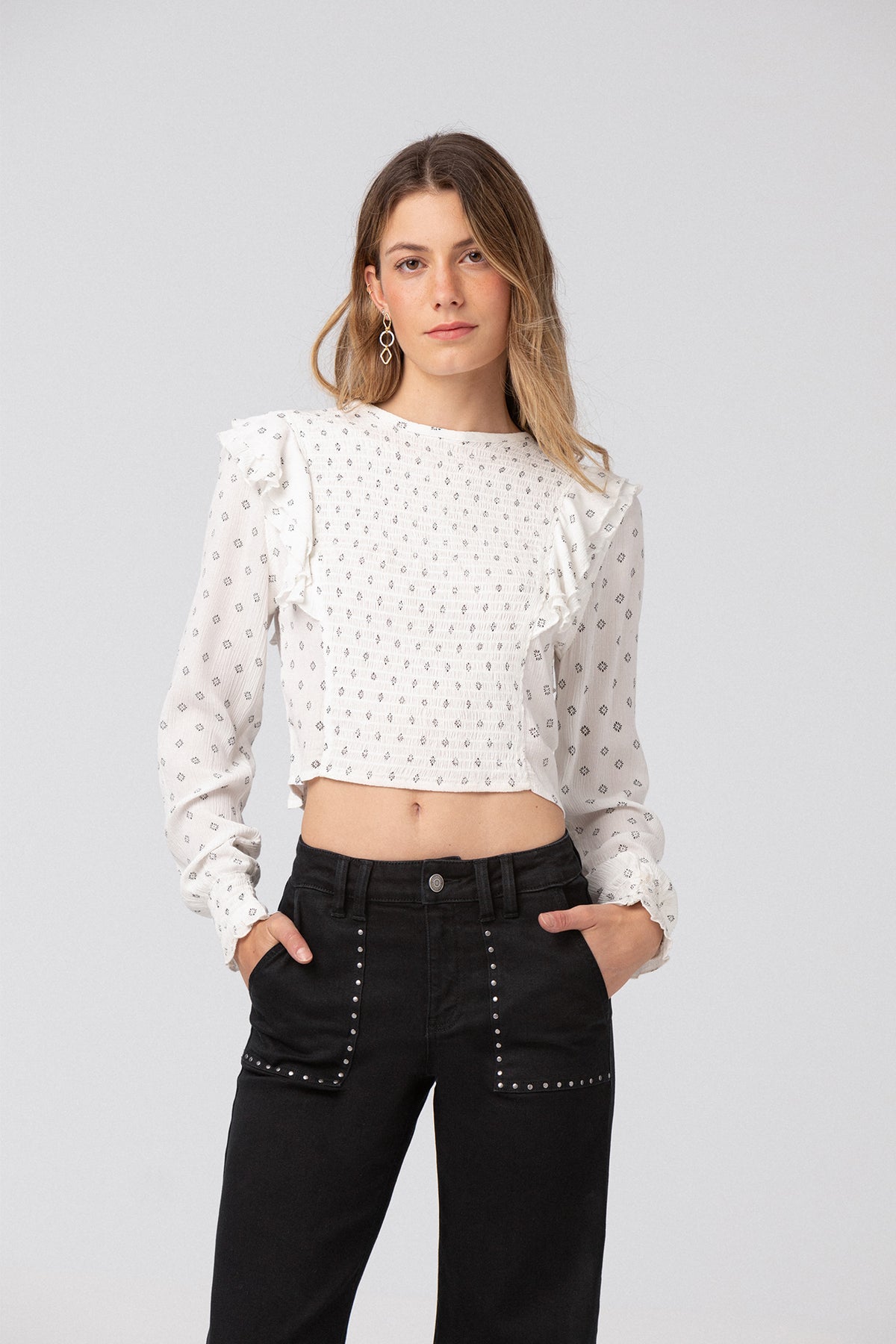 White Printed Long-Sleeved Blouse with Gathered Fabric . Made from stretch fabric for texture and style. Featuring long sleeves and elastic cuffs. A versatile staple, perfect for any occasion. Get it now!