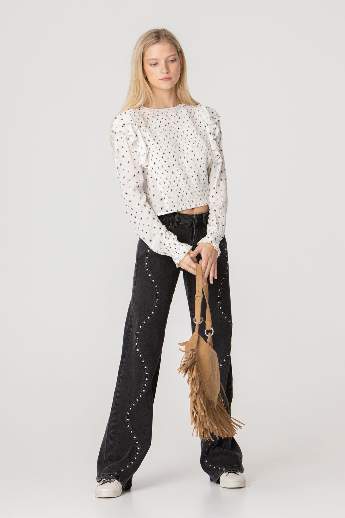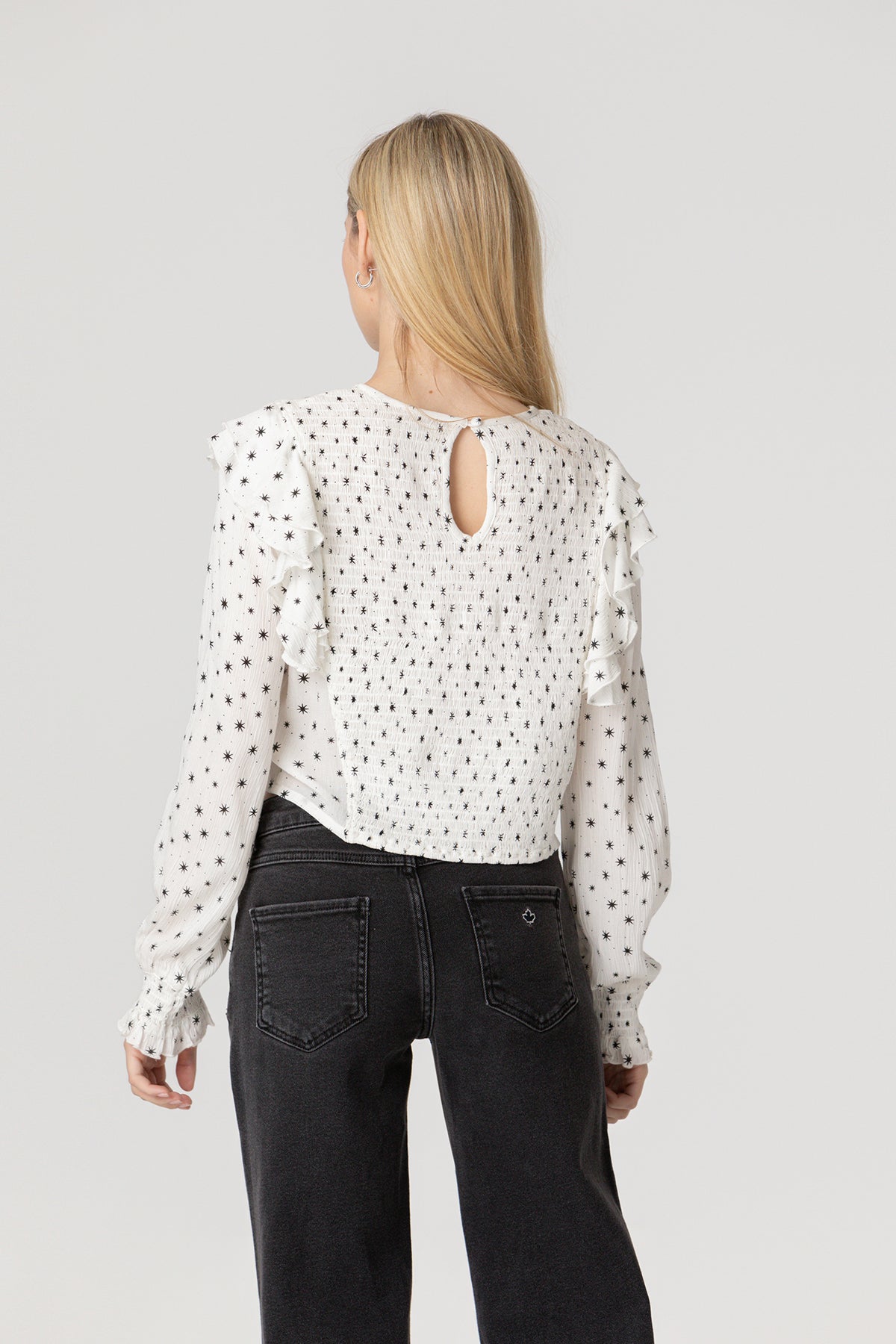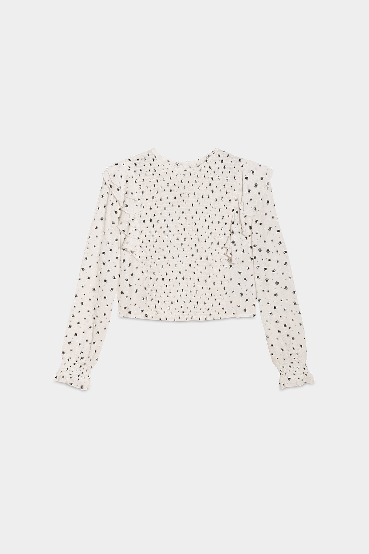 White Printed Blouse with Long Sleeves and Gathered Fabric . Made from stretch fabric that adds texture and style. Long sleeves and Elastic cuffs. A basic and versatile garment, ideal for any occasion. This is a great opportunity. Get it now!