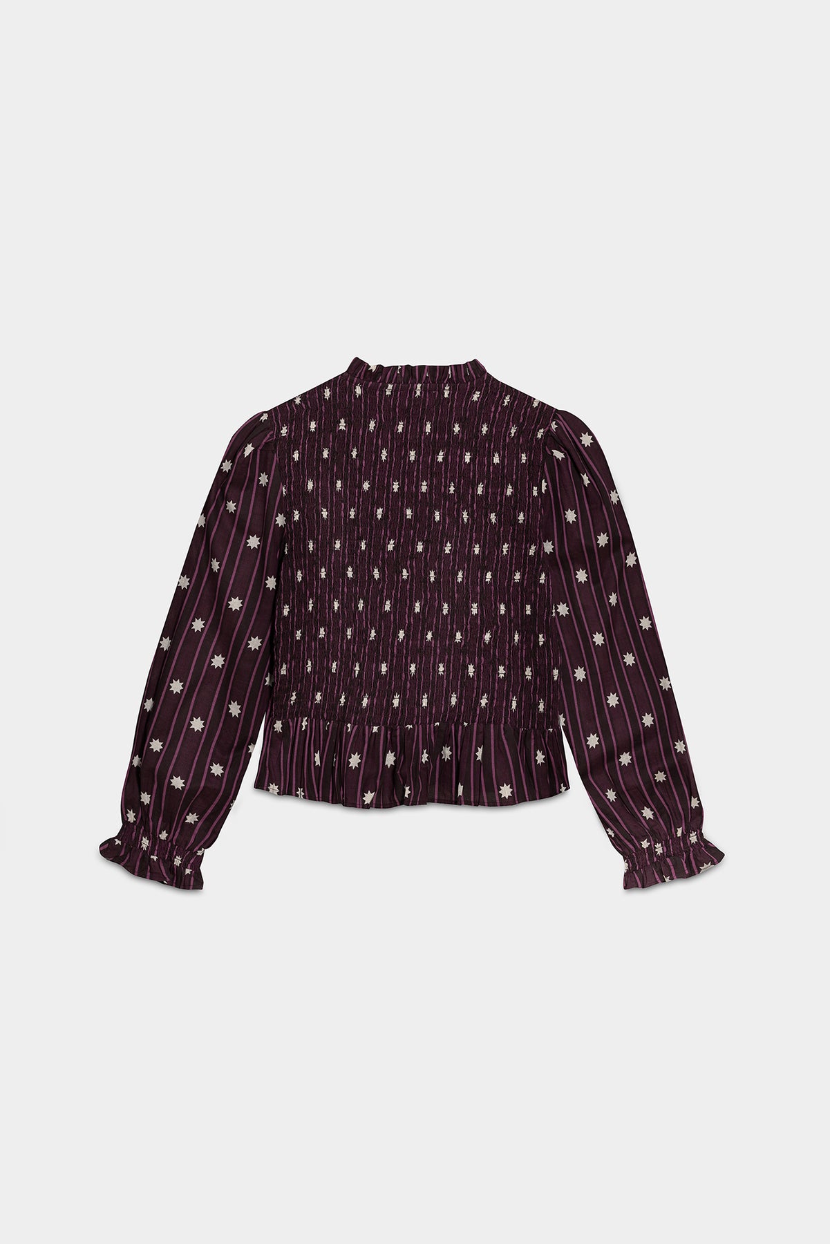 Long-sleeved top with a burgundy print. Flowy sleeves. and ruffles at the neck, cuffs and hem that add movement to the garment. Neckline with a tie. Gathered bodice that fits perfectly and enhances the Figure. Add an elegant touch to your everyday looks with this garment!