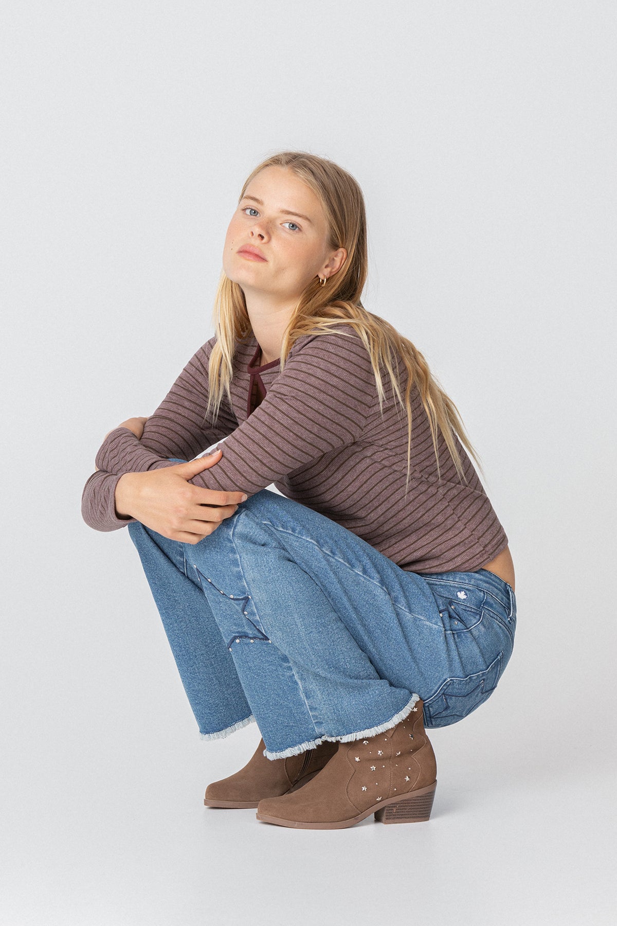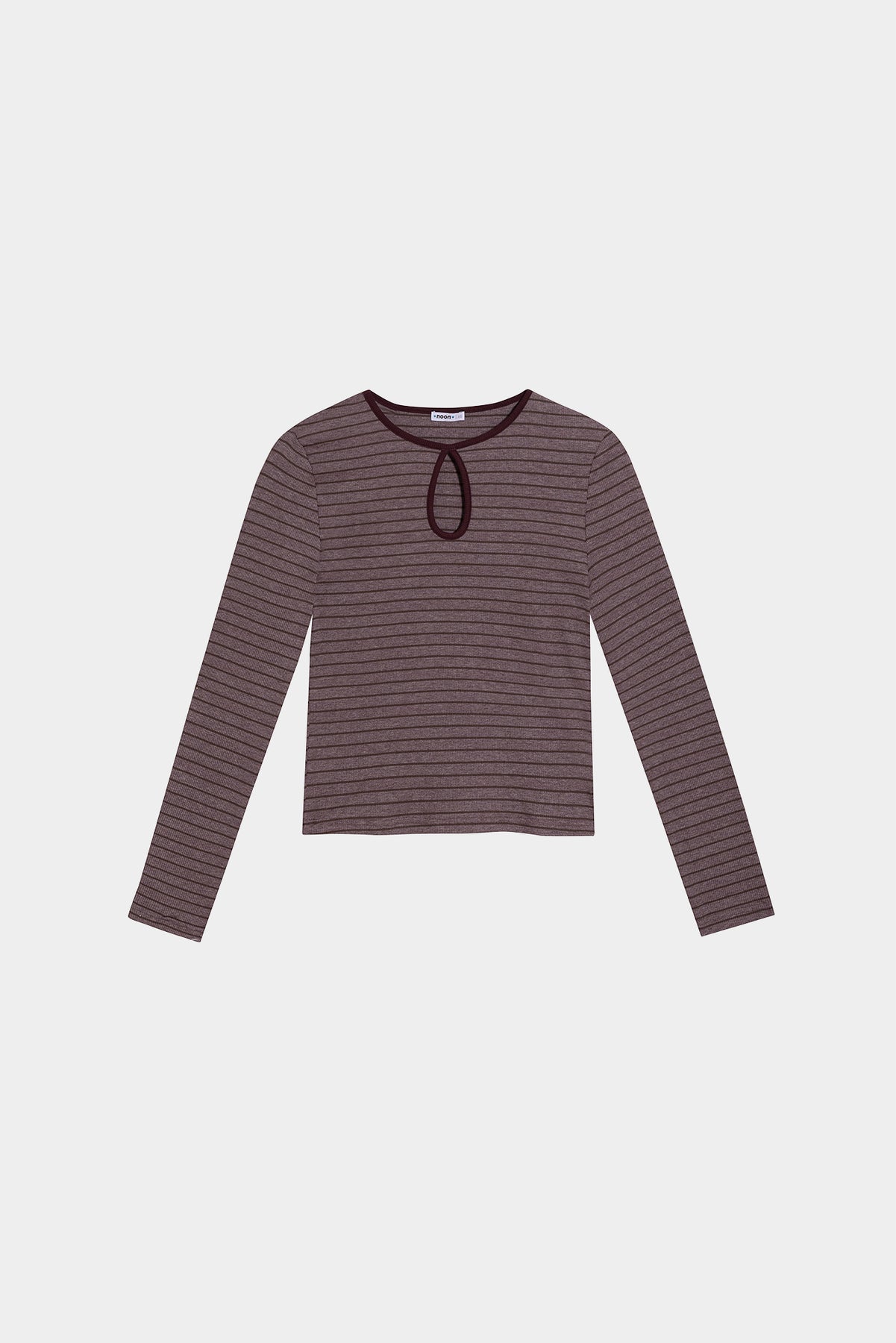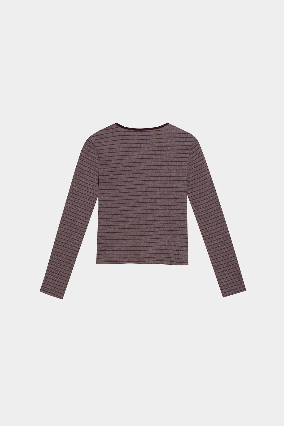Long-sleeved striped T-shirt. Front slit adds a youthful touch. Stretch fabric for a perfect fit. Get it now!