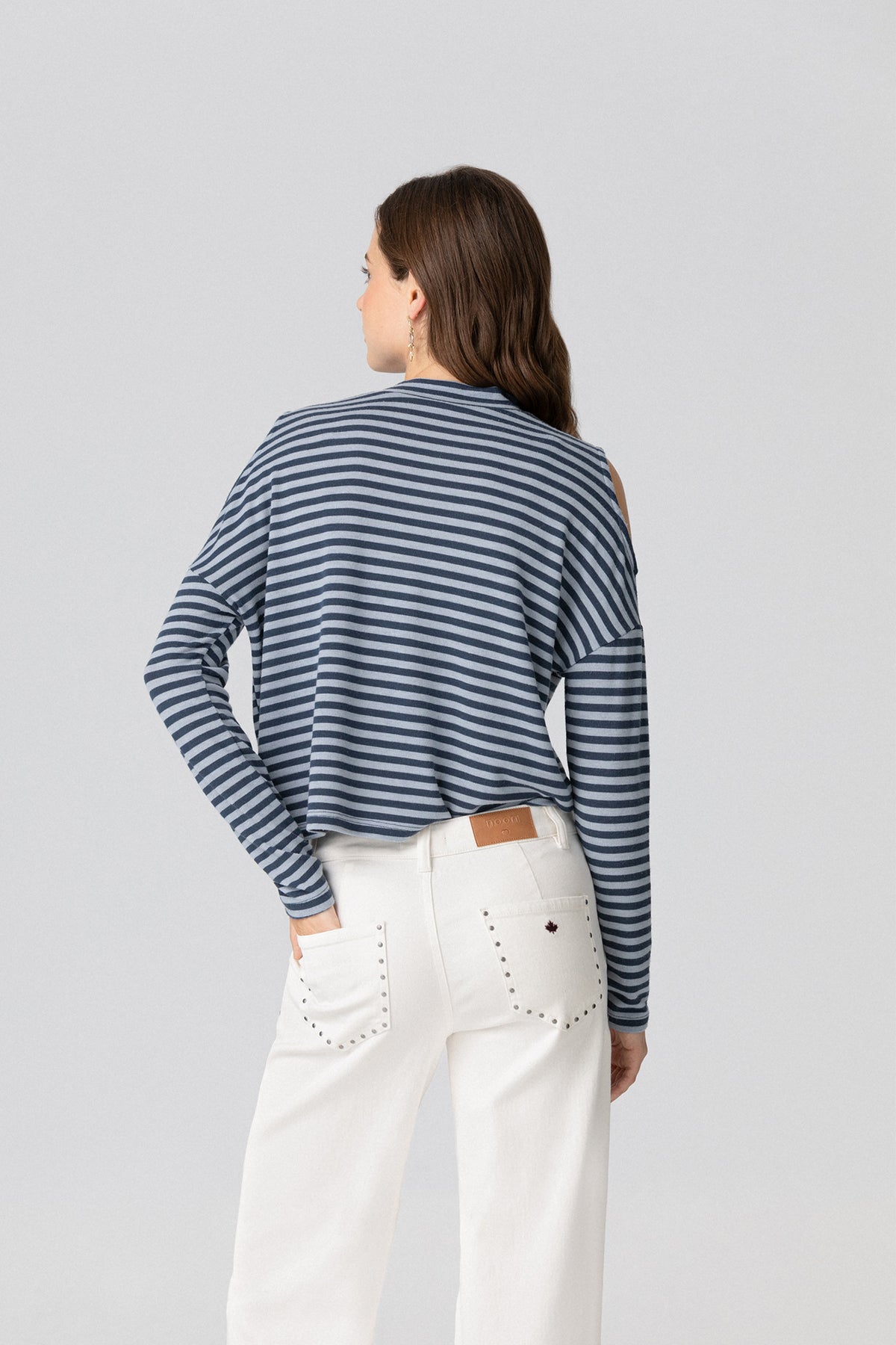 Long Sleeve Striped Off Shoulder T-Shirt Open back. Round neck, stretch cotton fabric. Available in two colors for you to choose your favorite. Combine it with any of our jeans!