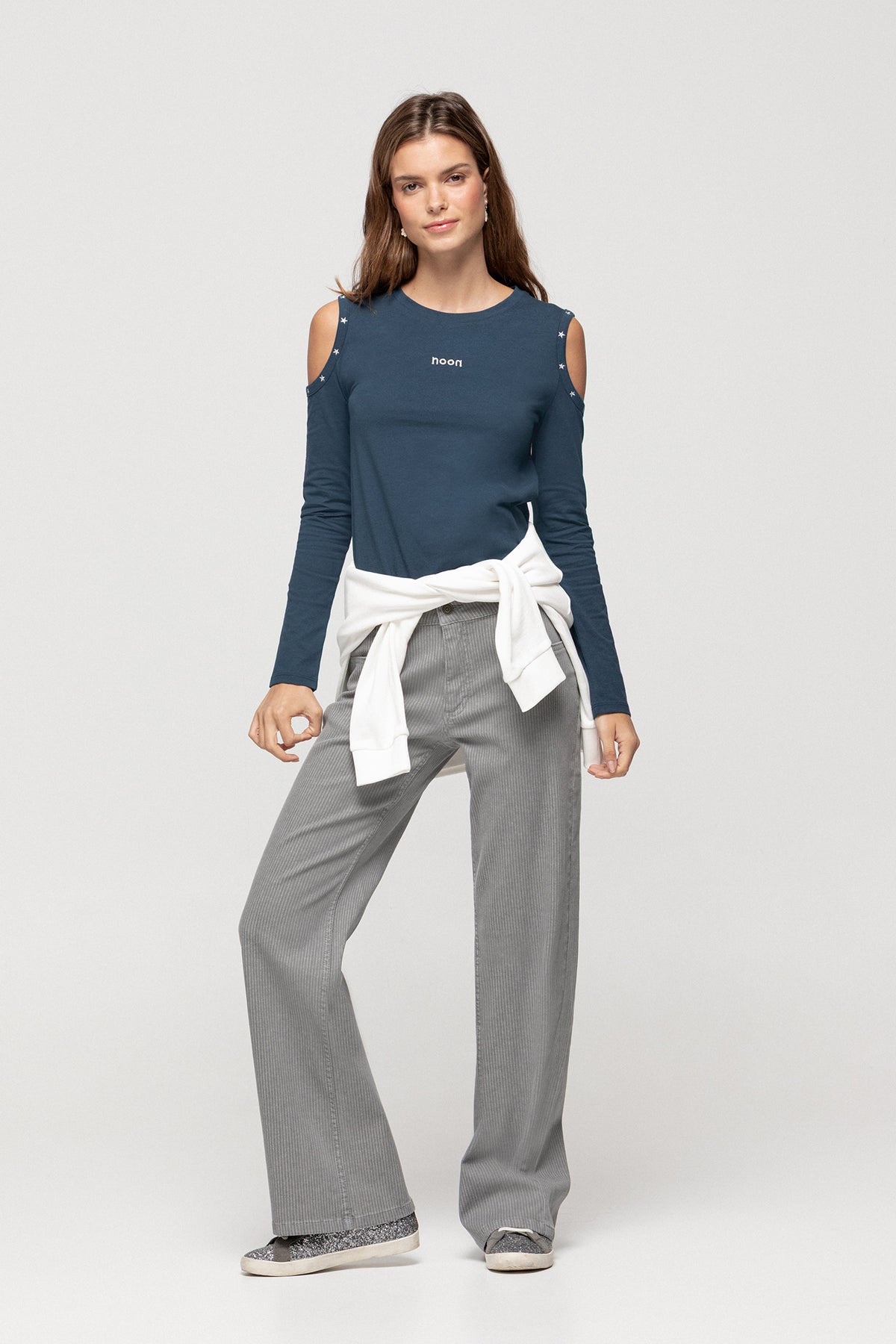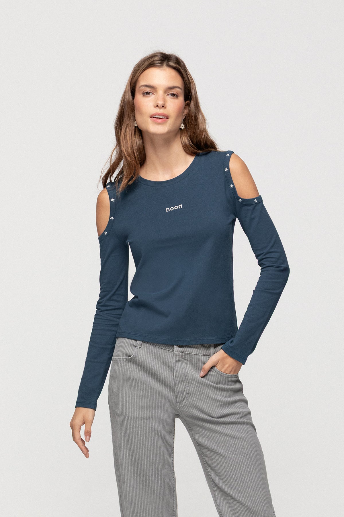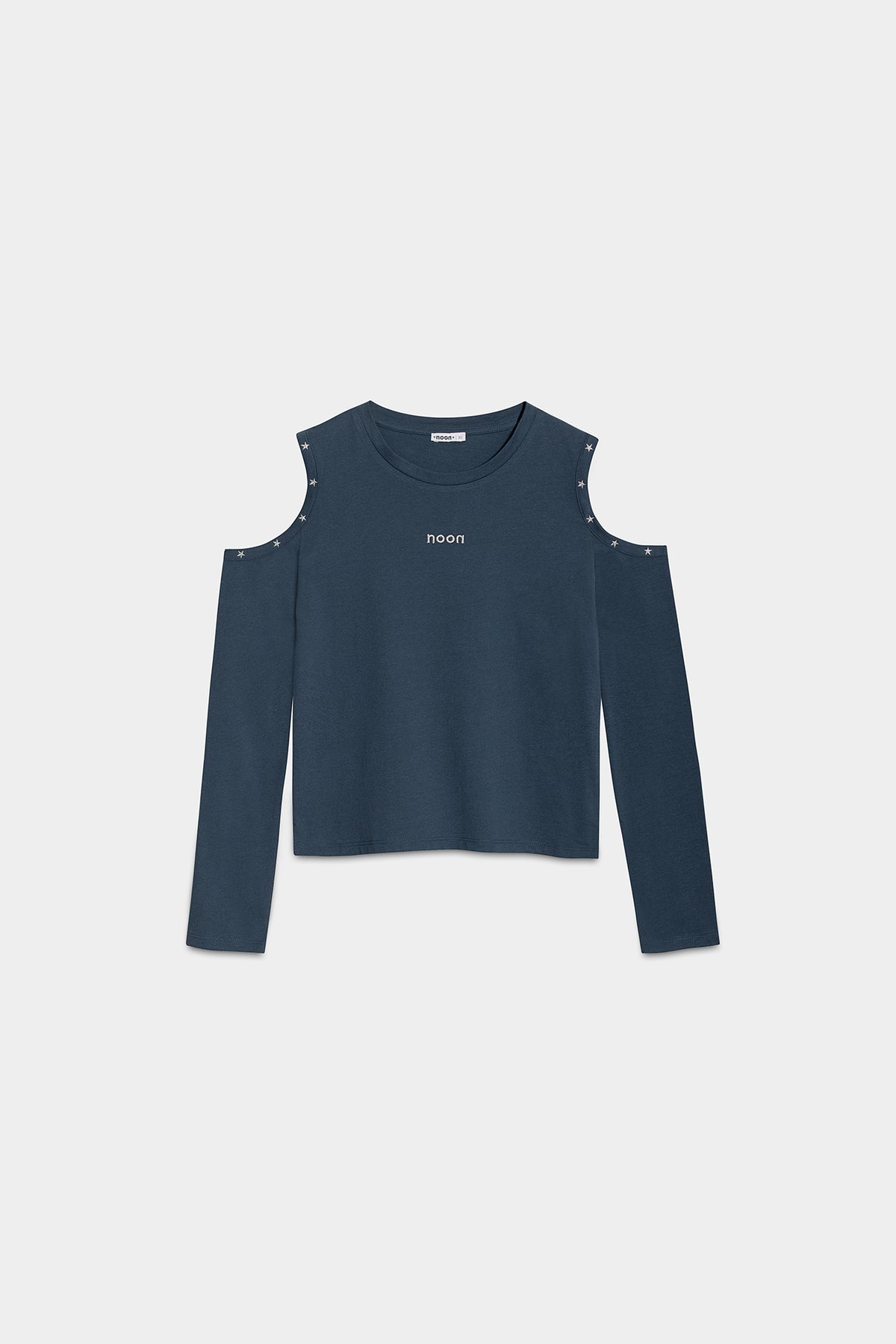 Long-sleeved T-shirt with off-the-shoulder design. The open shoulders add a youthful touch. Features stud detailing on the shoulders and an embroidered noon logo. Made from soft, comfortable fabric. Get yours now!