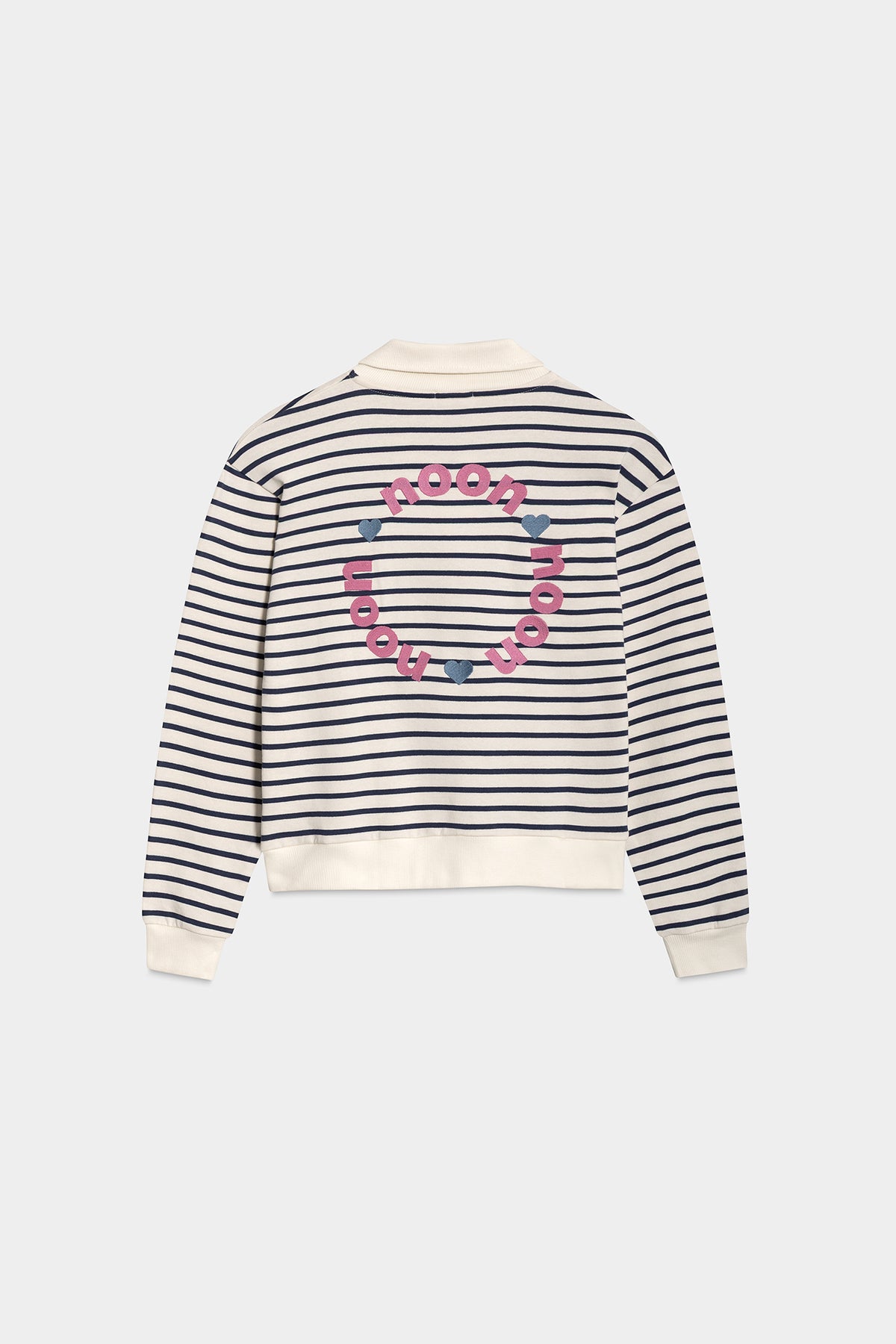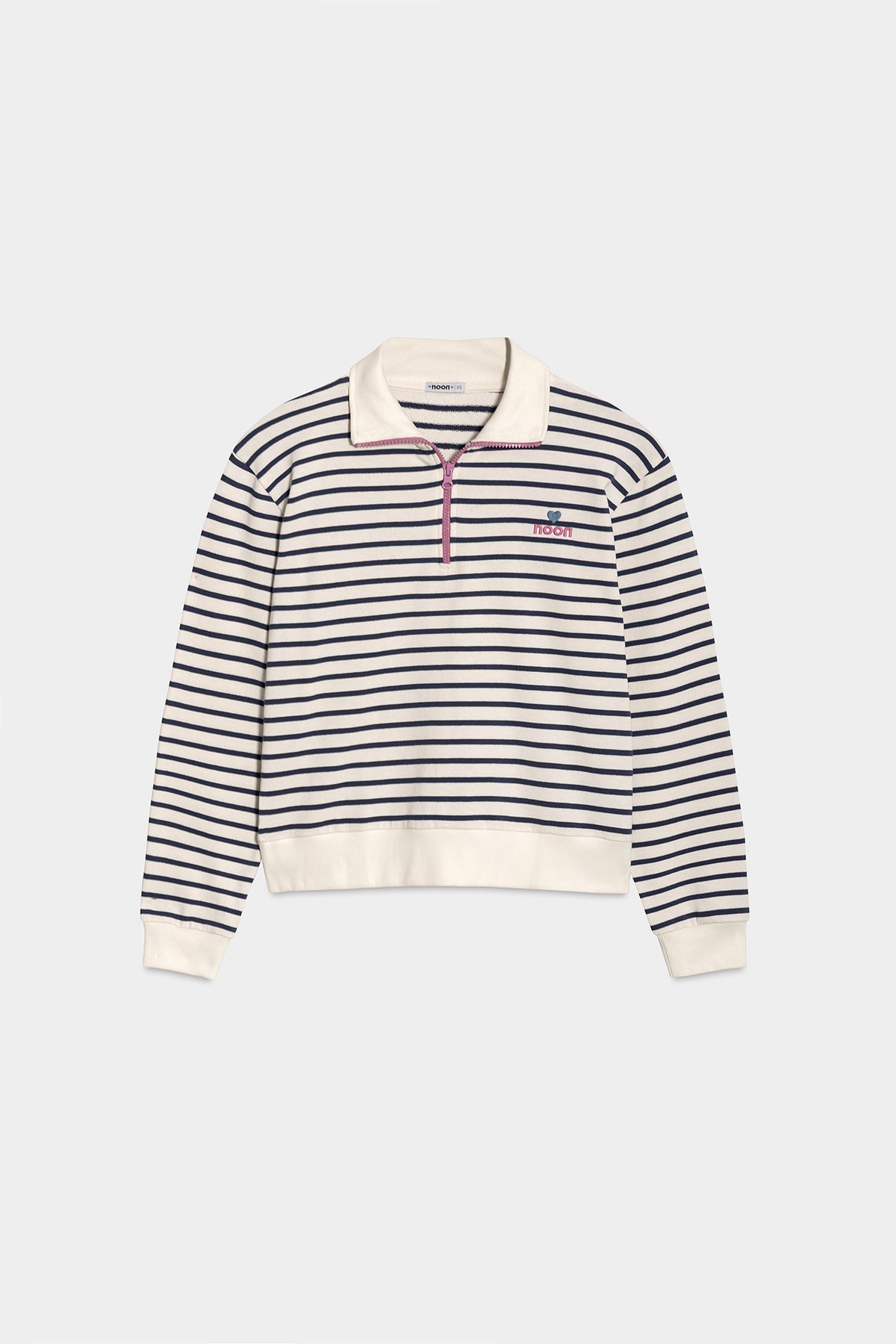 Striped sweatshirt with half zip at the neck. Noon logo embroidered on the front and back. Trendy design and Contrasting pink zipper. This sweatshirt will become a An essential part of your daily life!