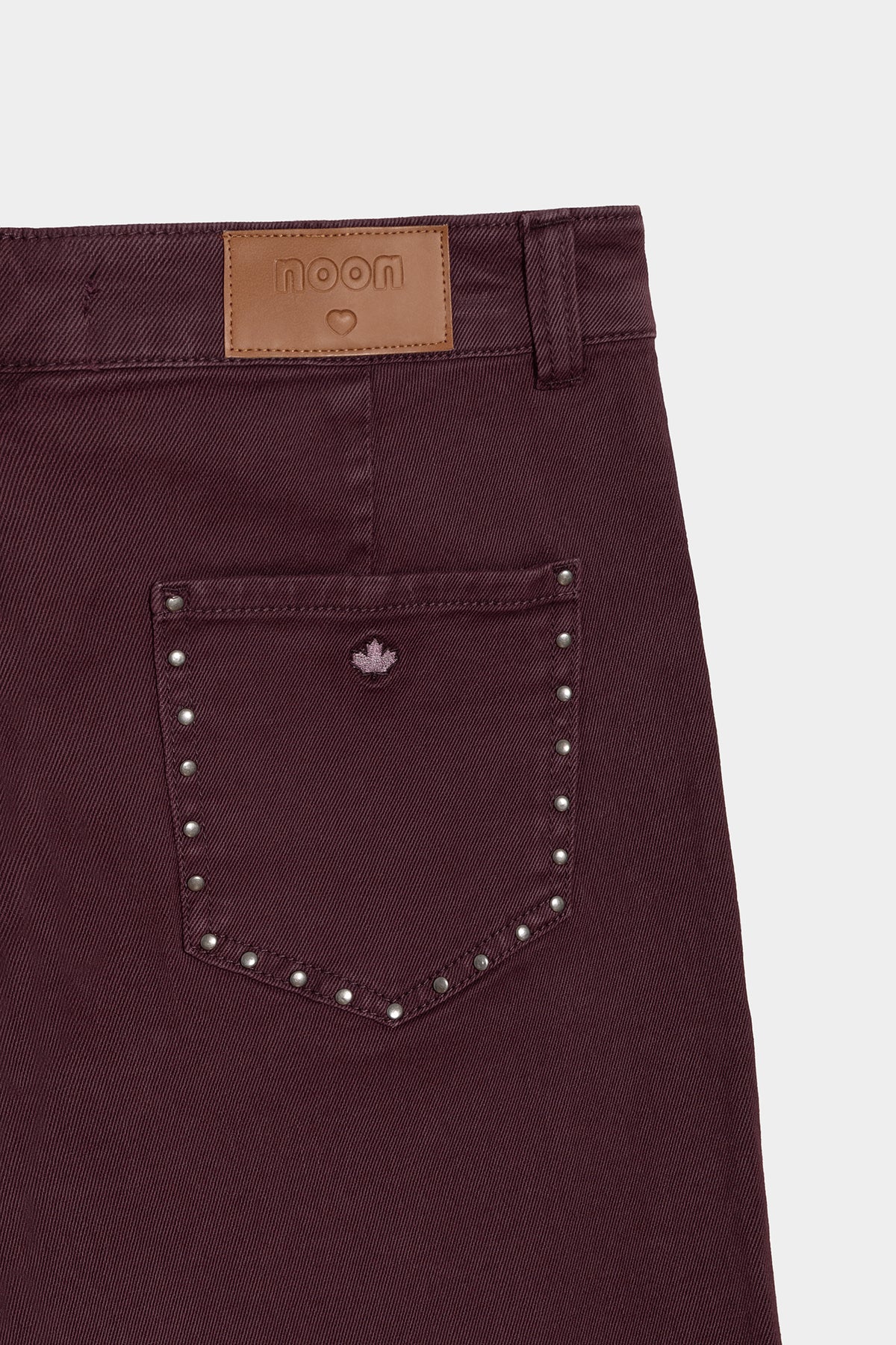 High-waisted culotte jeans with stud detail . Straight cut with wide legs and culotte design. Studs on the pockets Front and back. Embroidered Noon logo. Set the trend this season! season!