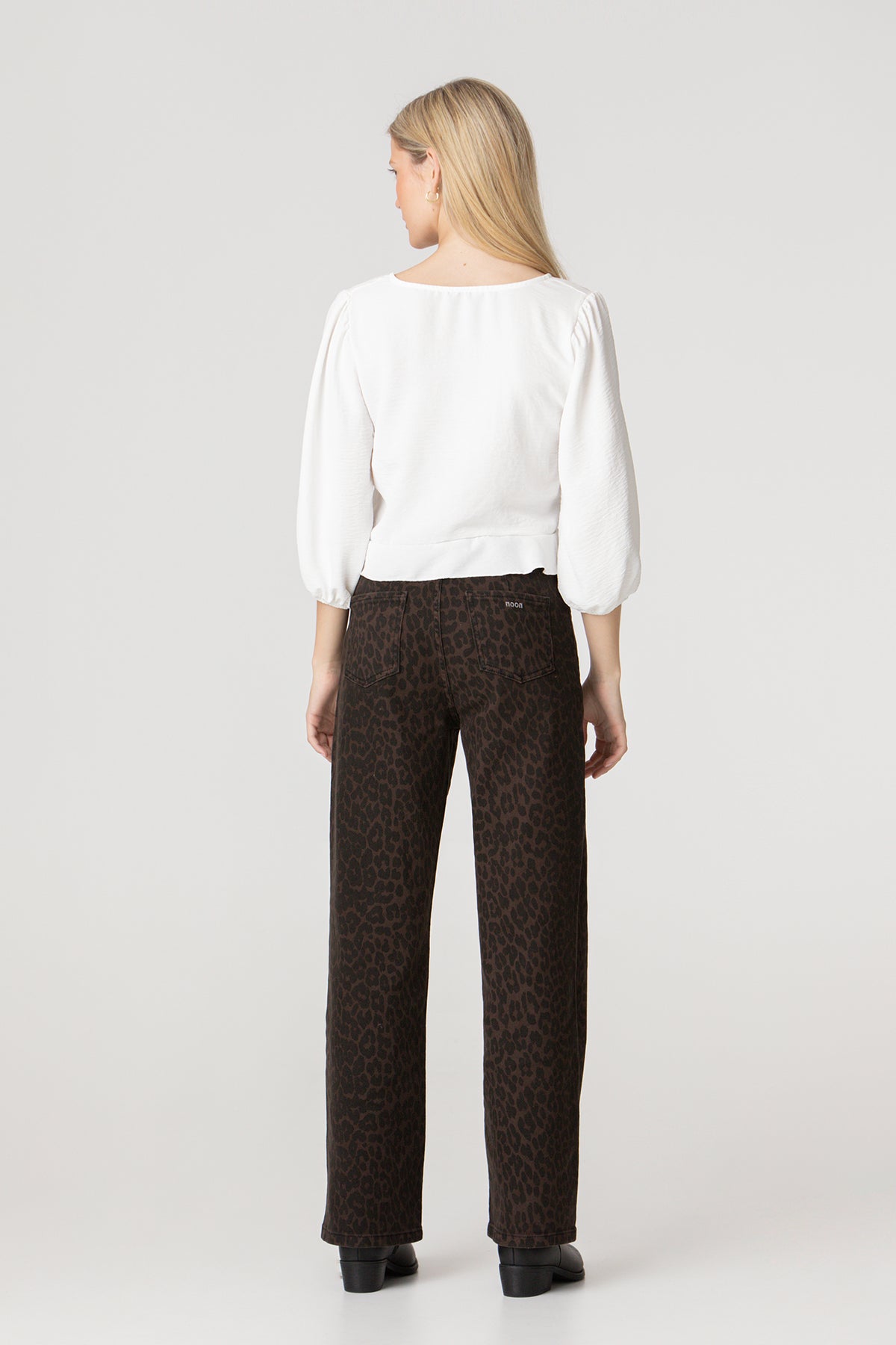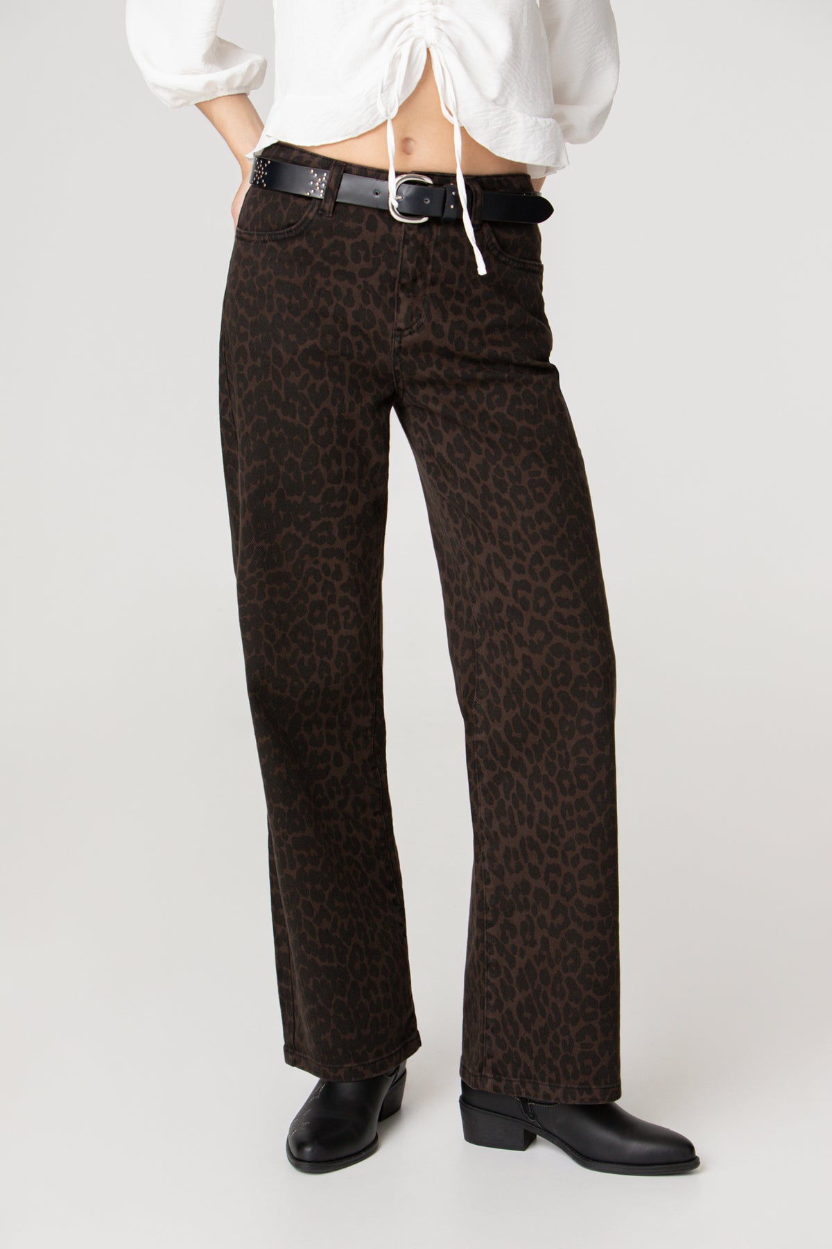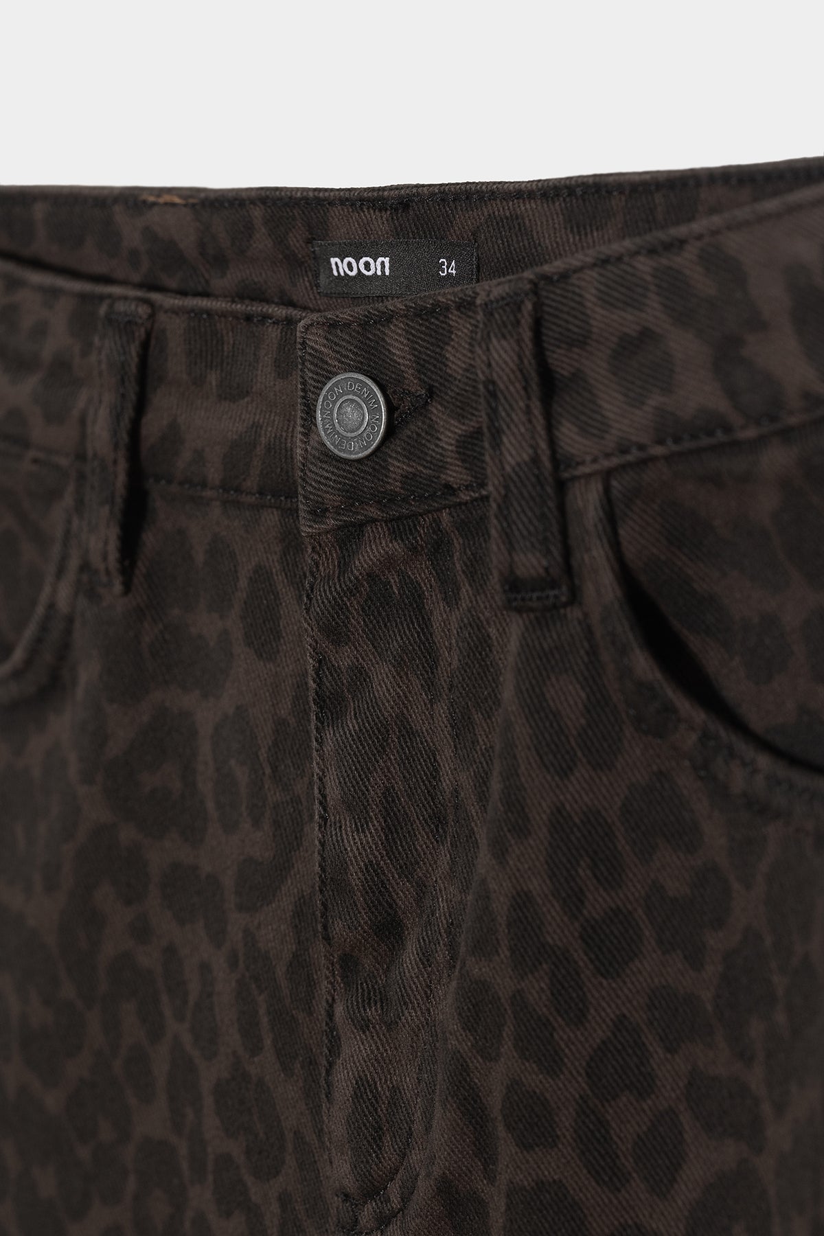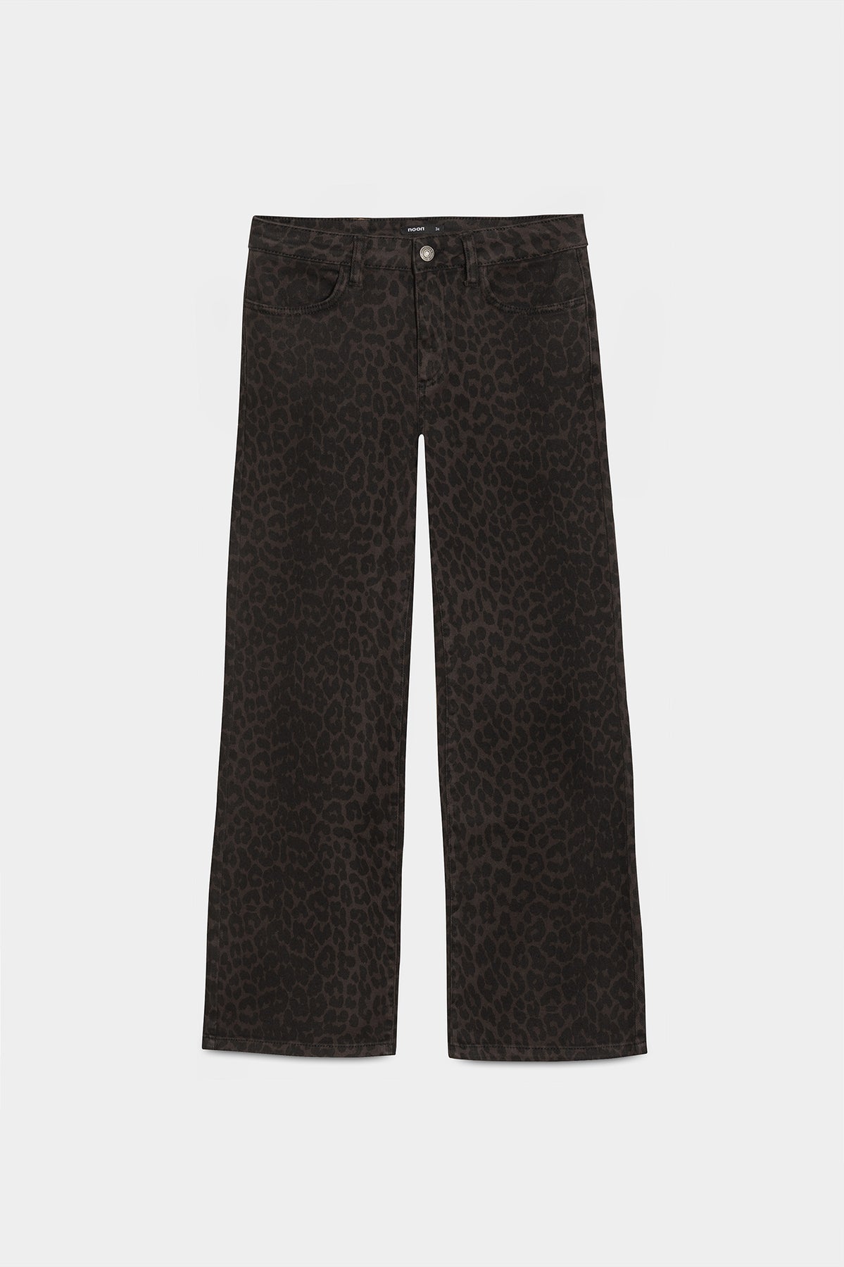 High-waisted jeans with brown leopard print . High-waisted and straight-cut to flatter the figure. Four pockets, zip closure zipper and button, and embroidered Noon logo on the pocket rear. Set the trend with our jeans!