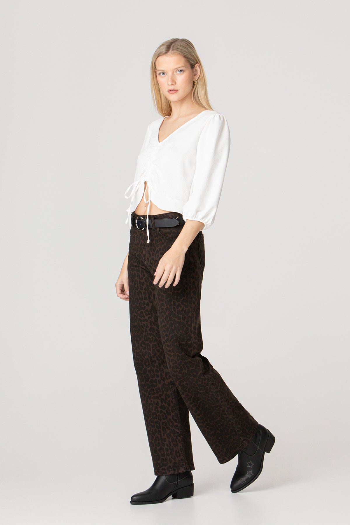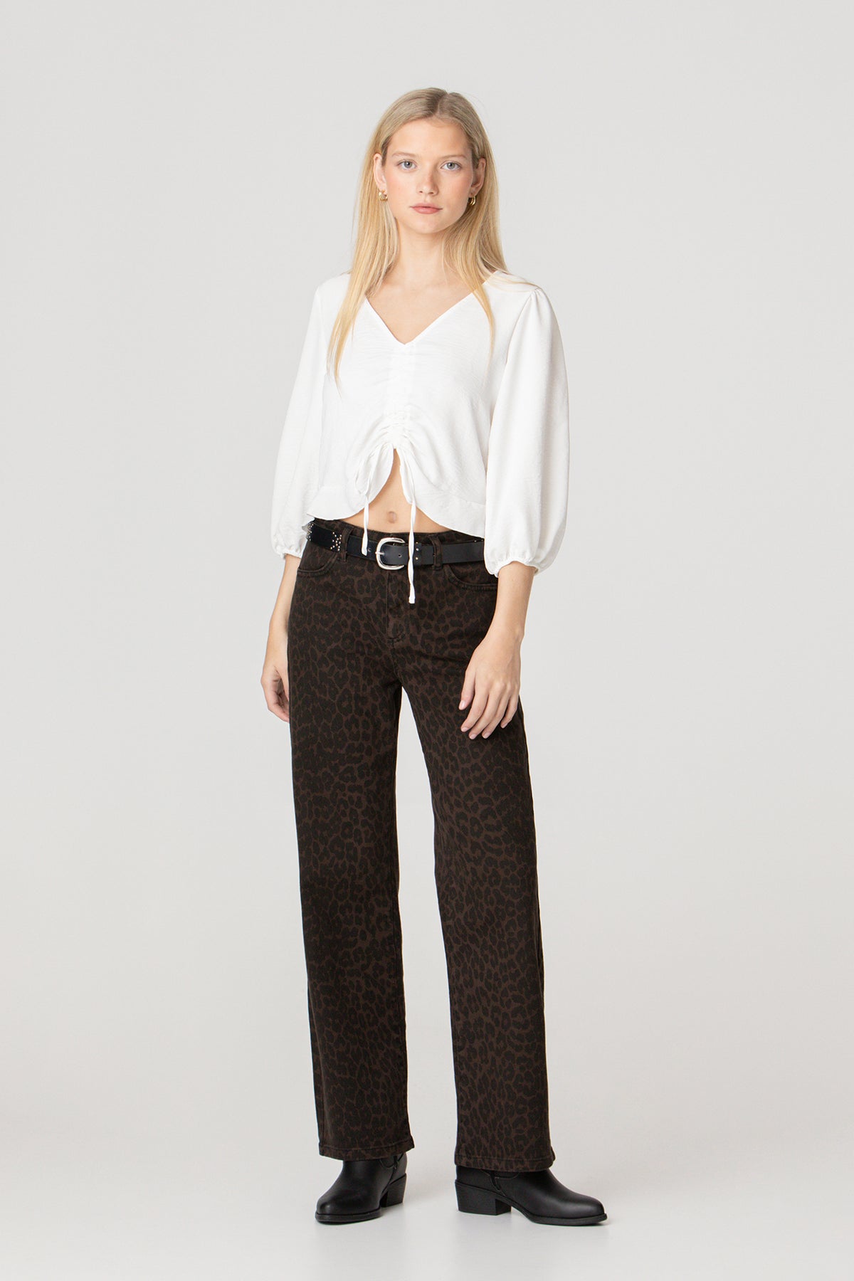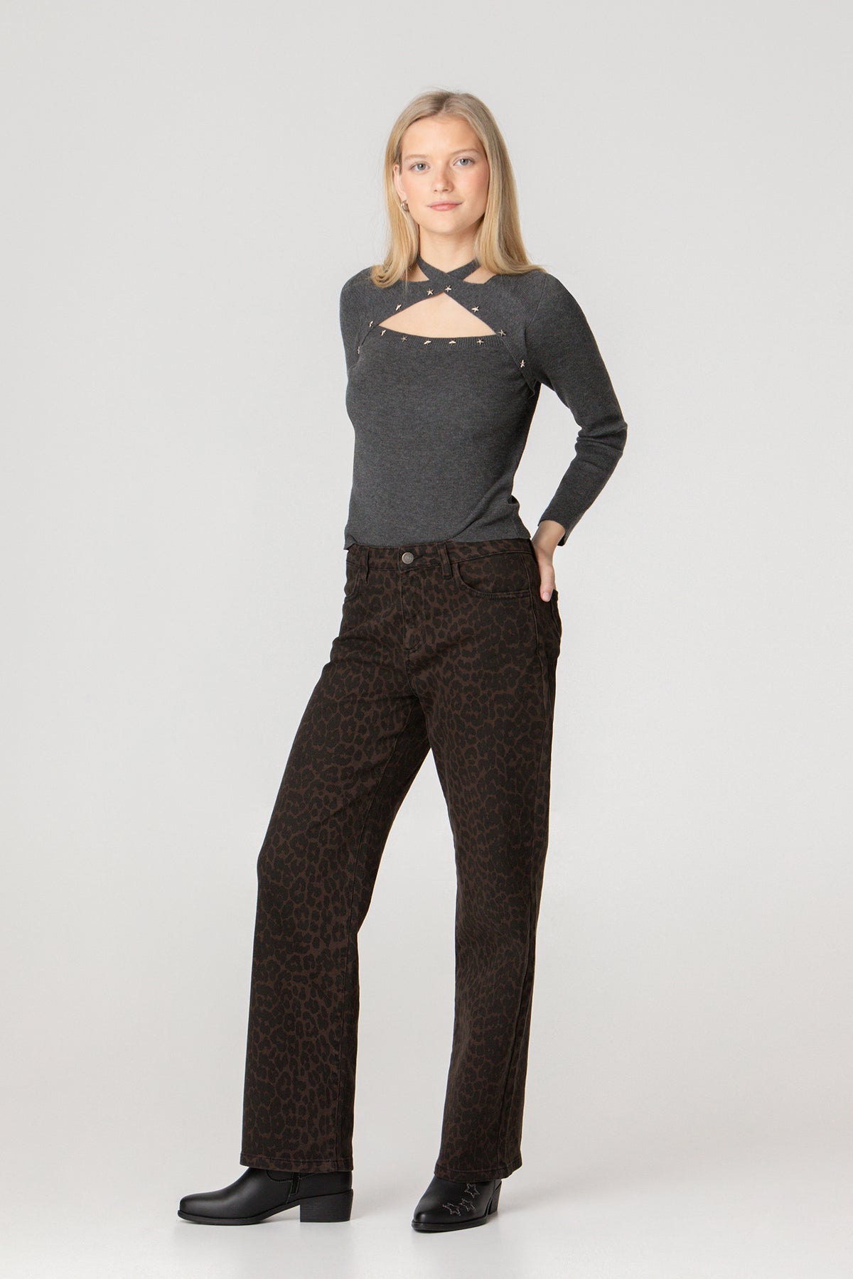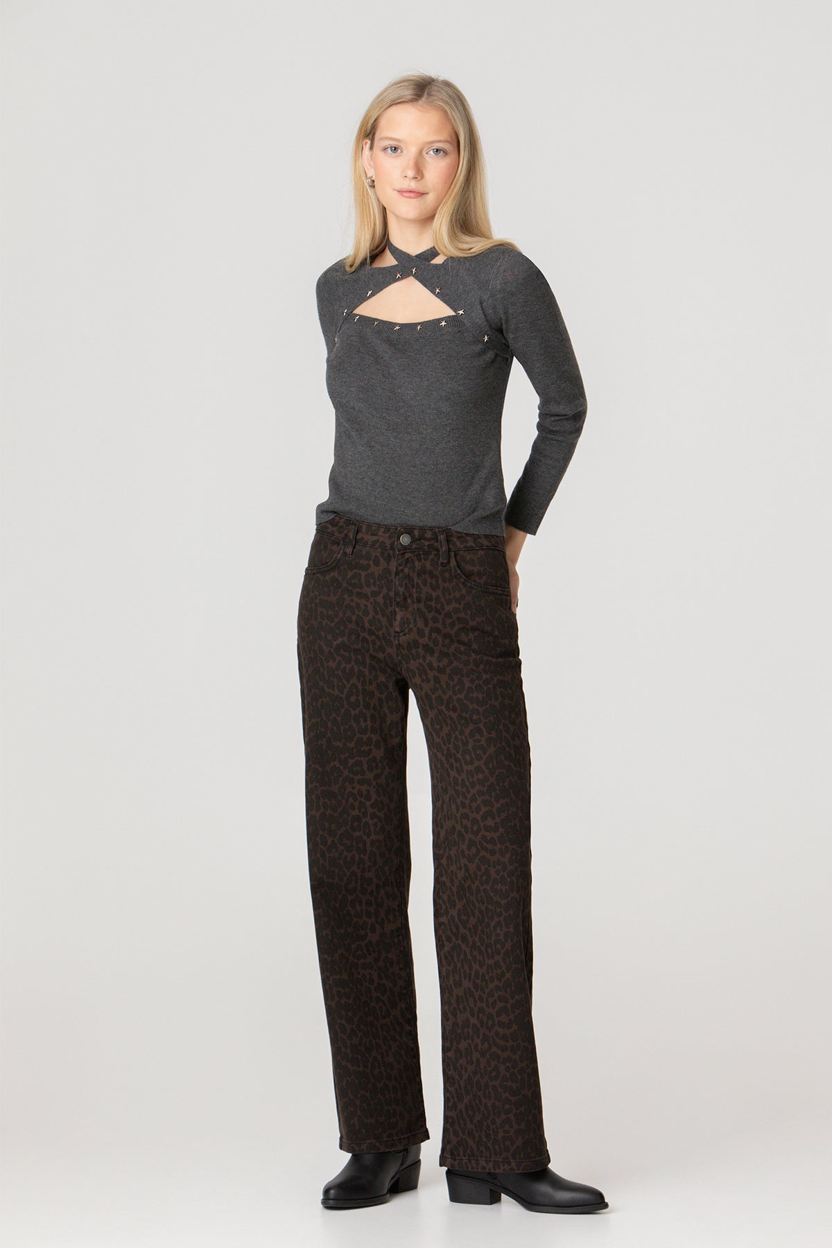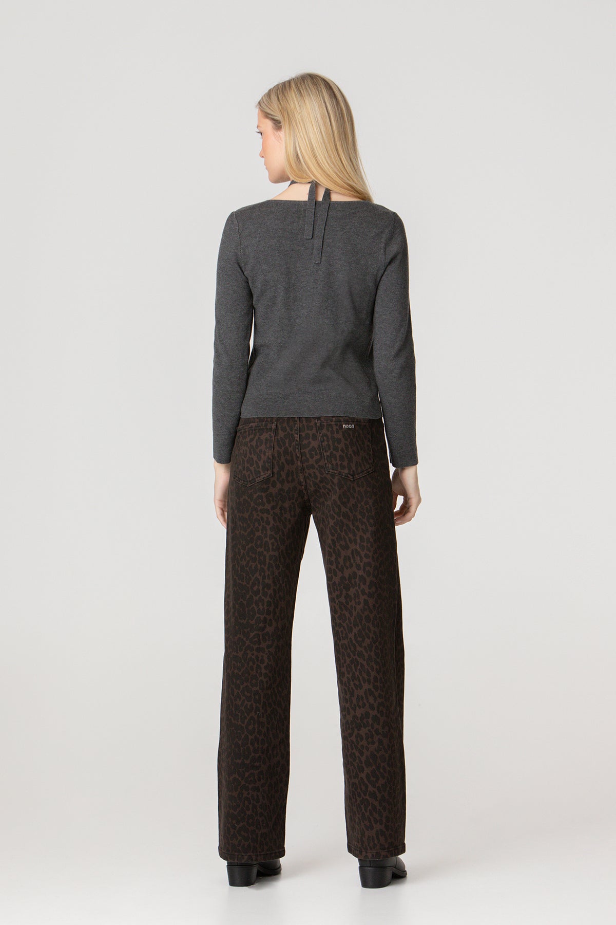 High-waisted jeans with brown leopard print . High-waisted and straight-cut to flatter the figure. Four pockets, zip closure zipper and button, and embroidered Noon logo on the pocket rear. Set the trend with our jeans!