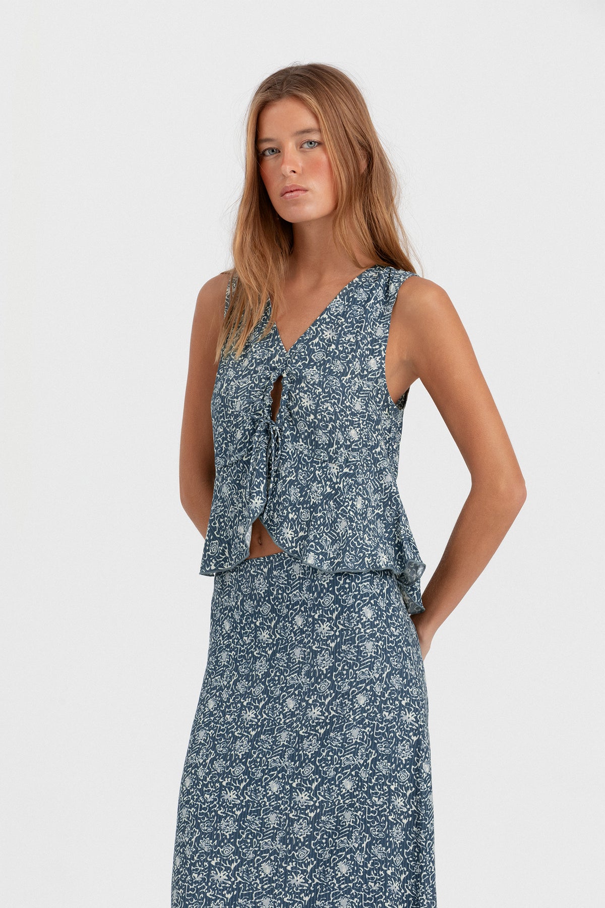 Top Estampado Sin Mangas con Aberturas Delanteras. Tejido suelto y cierre delantero con lazada. Cierre en el cuello con botón trasero para un ajuste perfecto. ¡Combínalo con la falda midi a juego para conseguir un look completo!