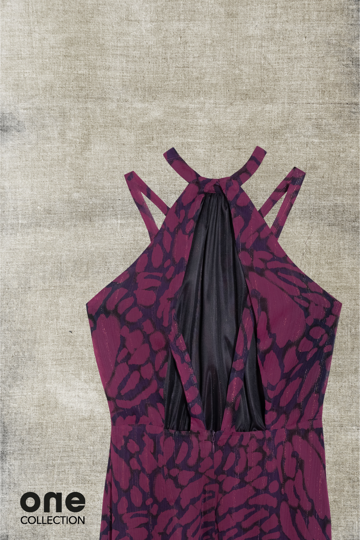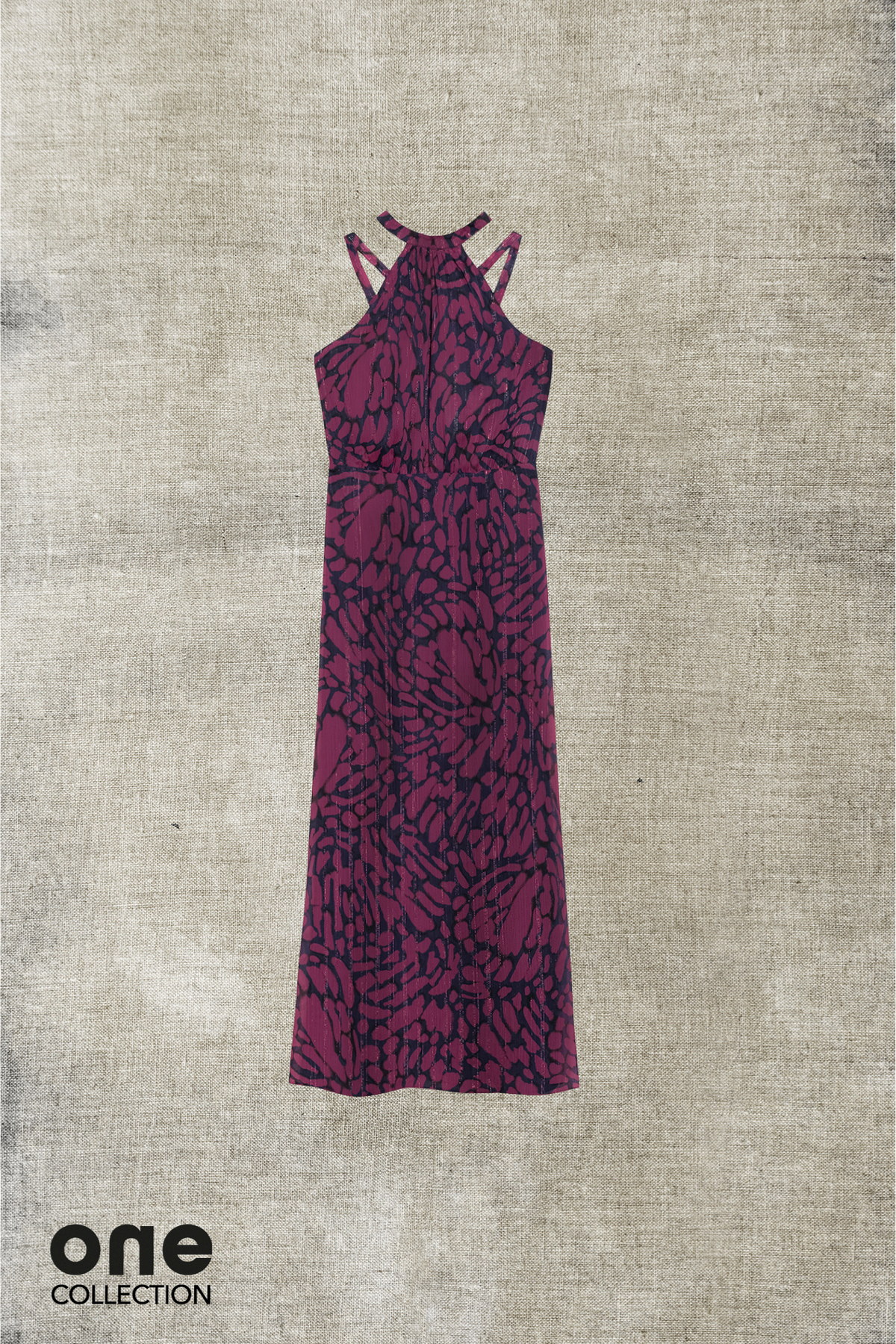 Long printed dress in shades of pink and blue. Features a fitted waist that accentuates the figure, a round neck, and is sleeveless. It has a back zipper closure and a tie at the neck. Open back. Pair it with our heeled sandals for a stunning look.