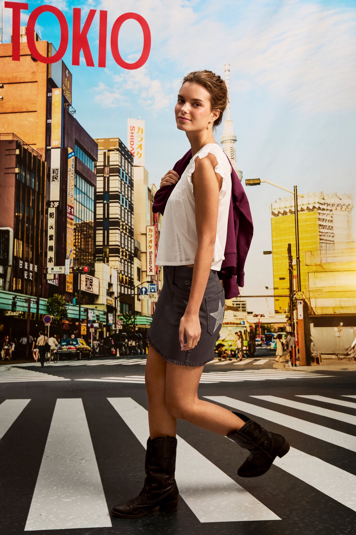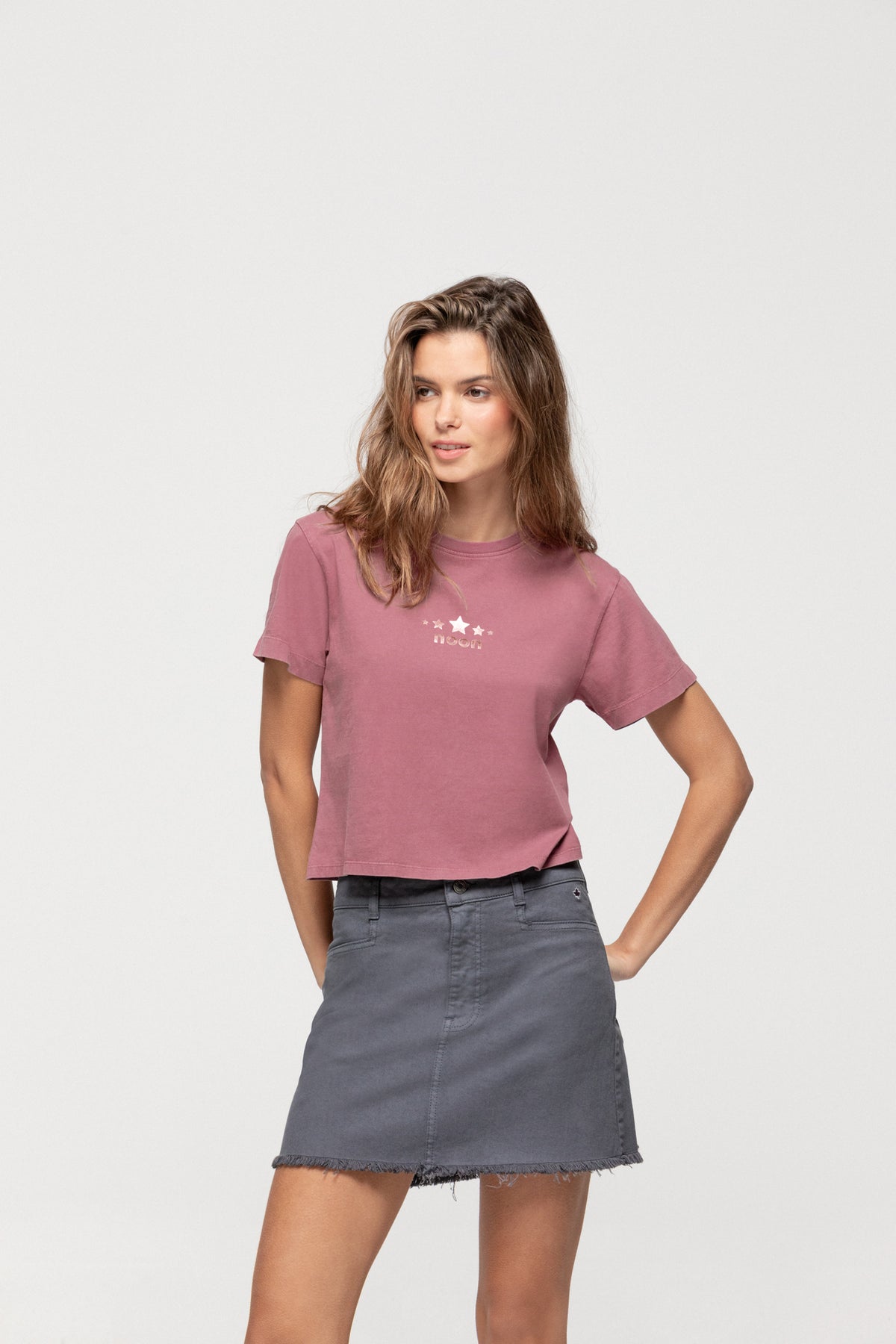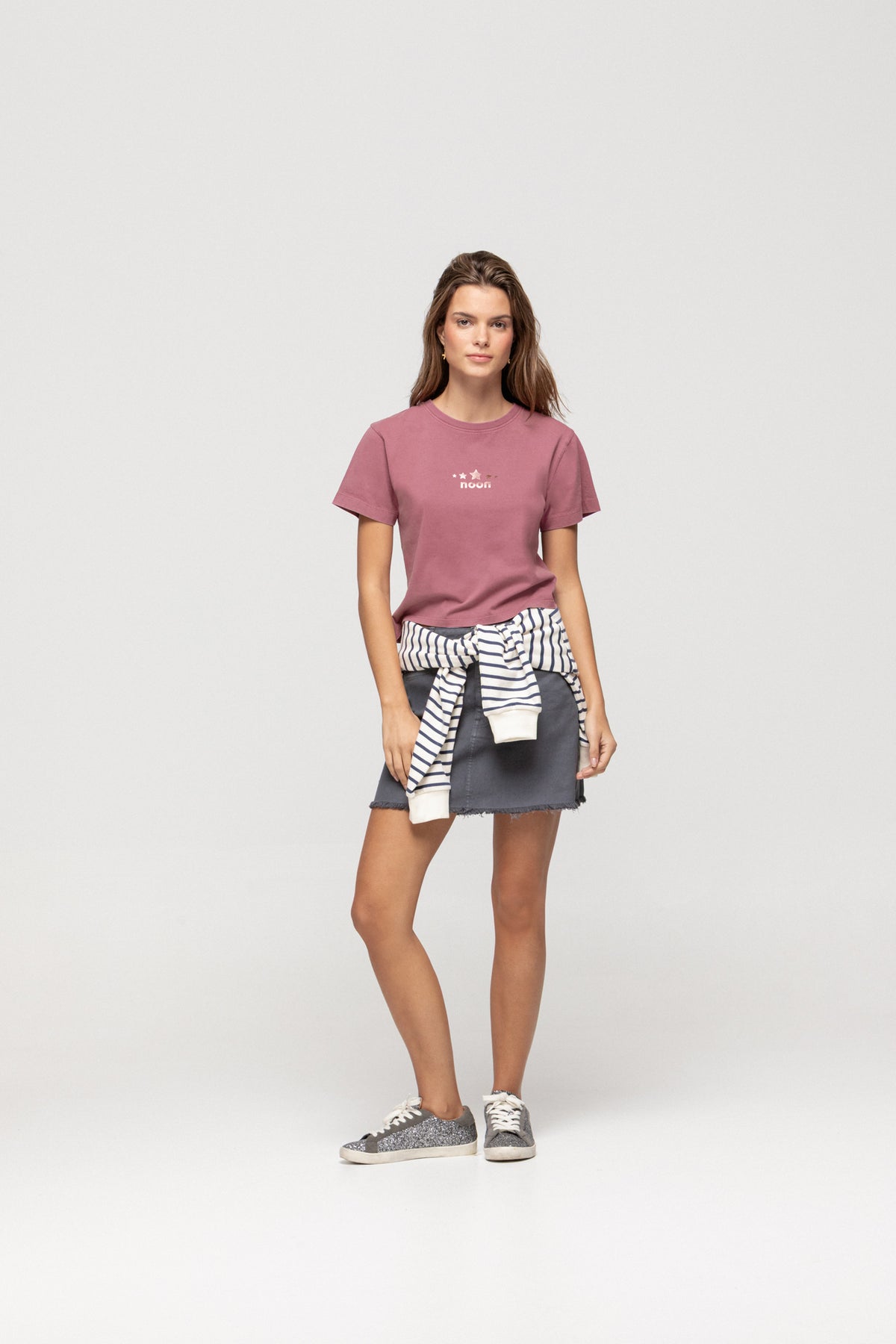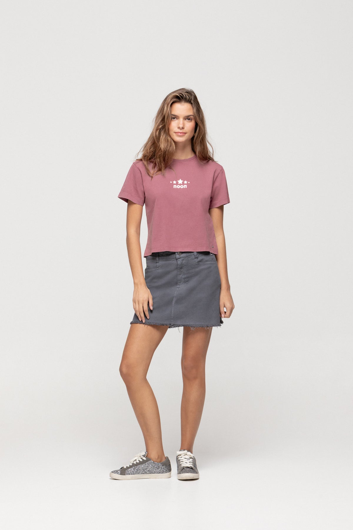 Falda Mini Tejana con Detalles de Estrella Glitter en los Bolsillos Traseros. Bajo desflecado y logo de noon bordado en la parte delantera. ¡No te quedes sin tu imprescindible esta temporada!