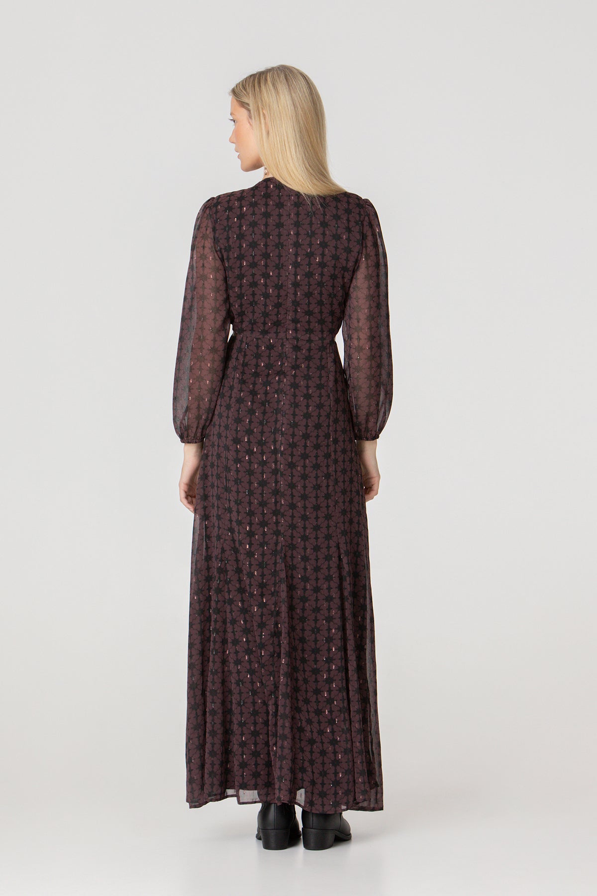 Long printed dress with side slits. Sleeves Long, puffed sleeves that add movement to the garment. V-neck, and closure With a zipper at the back. Perfect for looking radiant on any occasion. party, event or special occasion this season!