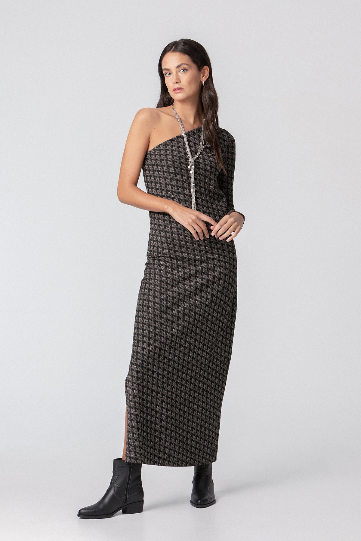 Asymmetrical Midi Dress with Jacquard Print . Print Jacquard with shine and elastic fabric that adapts perfectly to the silhouette. Asymmetrical design with a single shoulder and a long sleeve. Slit at the hem Add movement to the garment. Show it off with your favorite accessories and stand out! with a unique and elegant style!