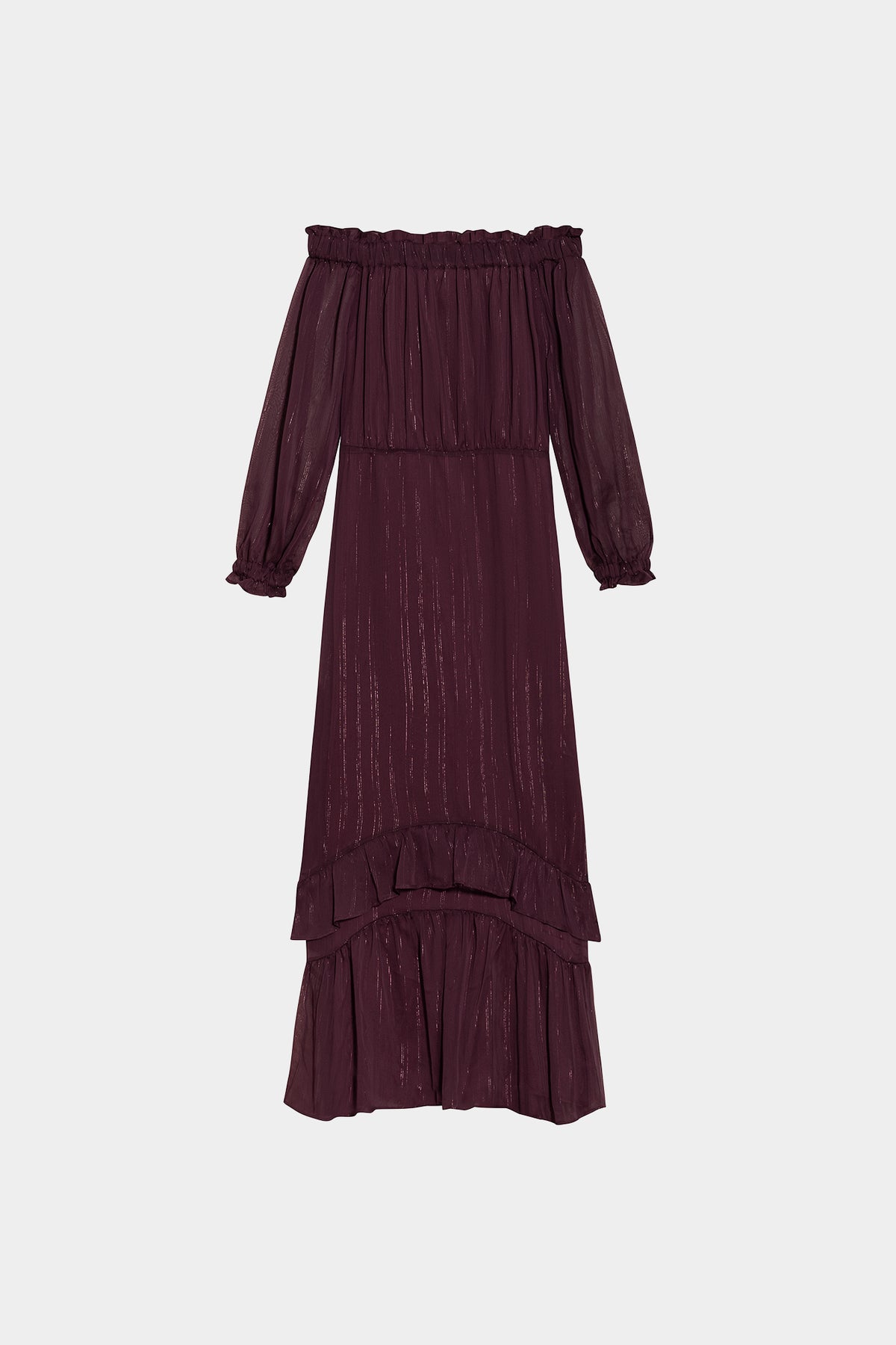 Long burgundy ruffled dress. Trendy print and waistline. Elastic cuffs for a perfect fit. Semi-backless. Perfect for any party, event, or special occasion!