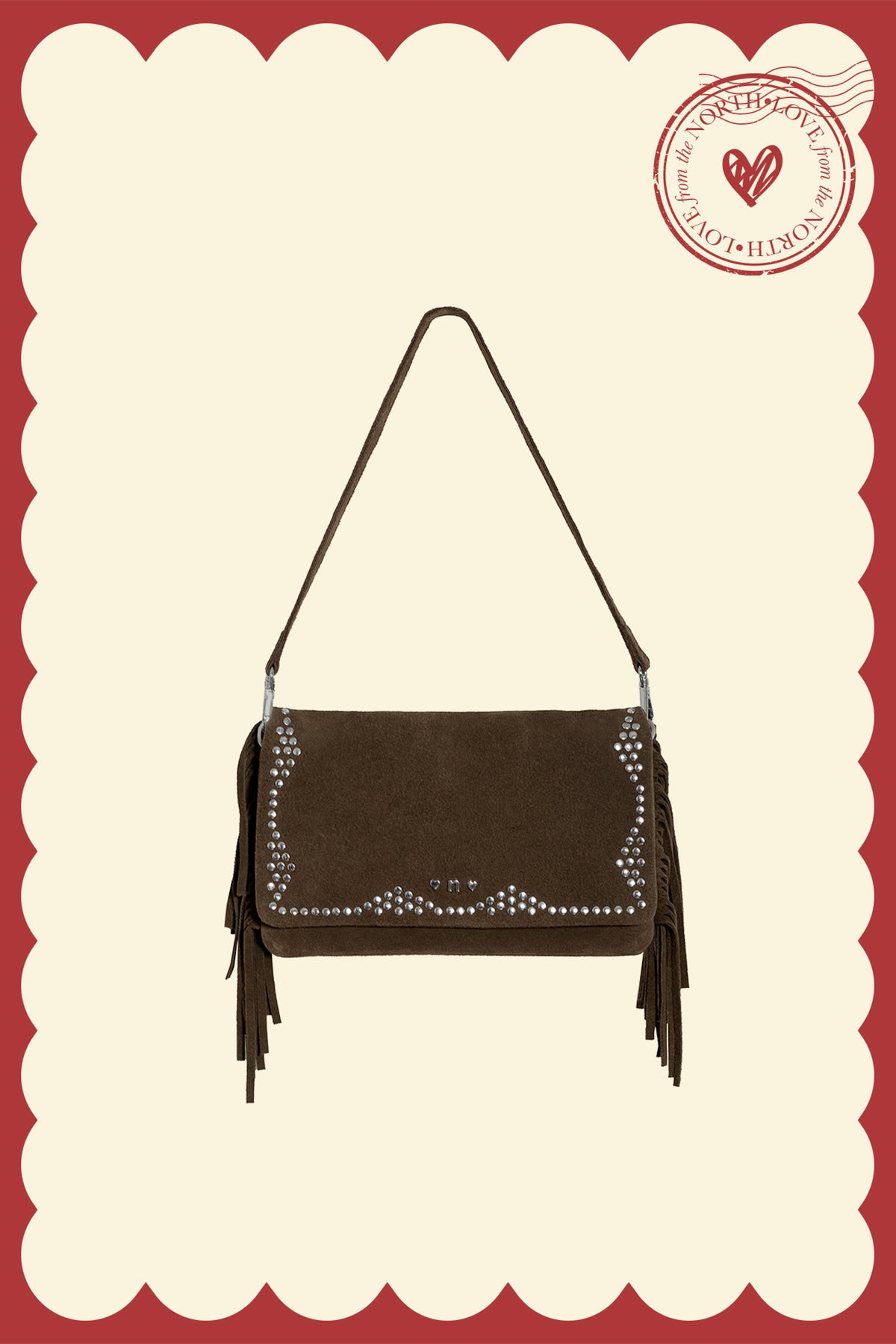 Leather handbag with studs and fringe. Color Brown, studs and trendy fringe. Noon logo on the front. Interior zip pocket. The perfect accessory for your daily looks!