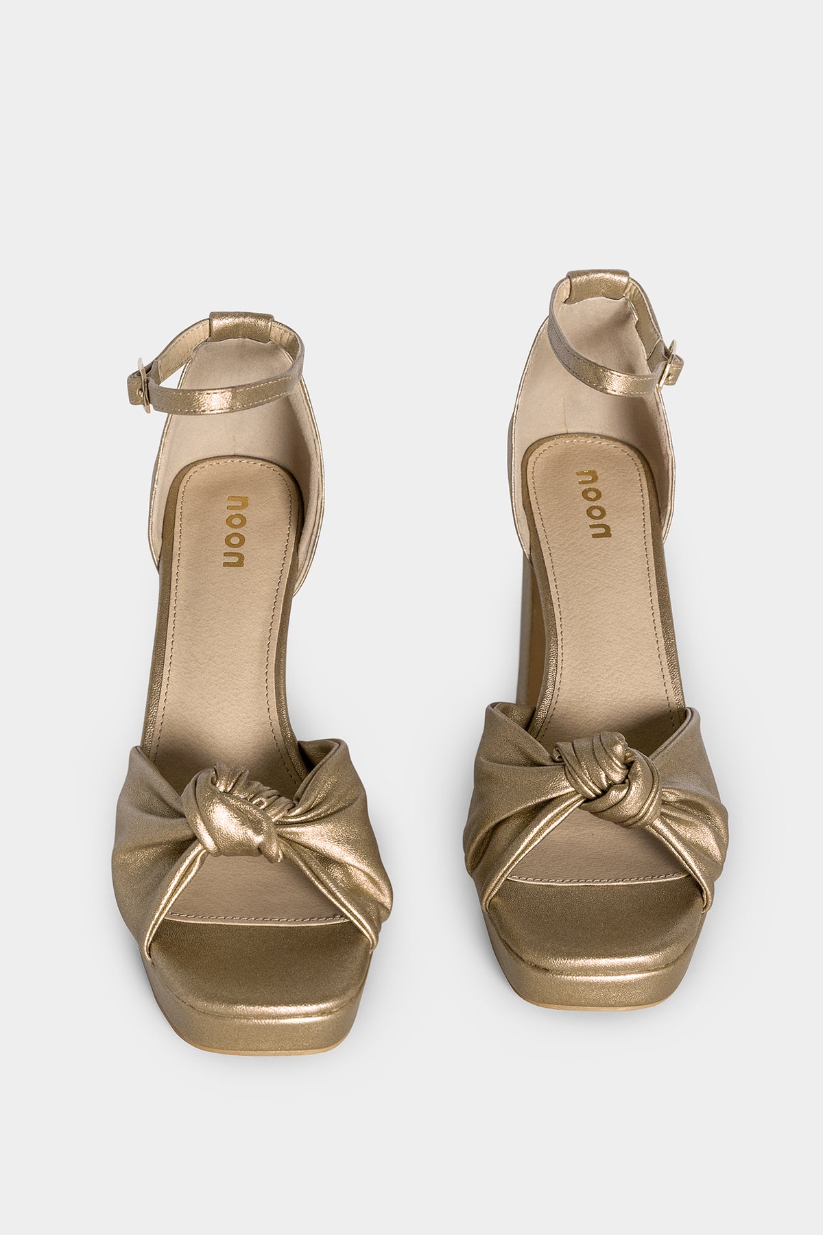 Gold or purple platform heeled sandals. Features a knot detail at the front and an ankle buckle closure for a perfect fit. Ideal for events, parties, or any special occasion.