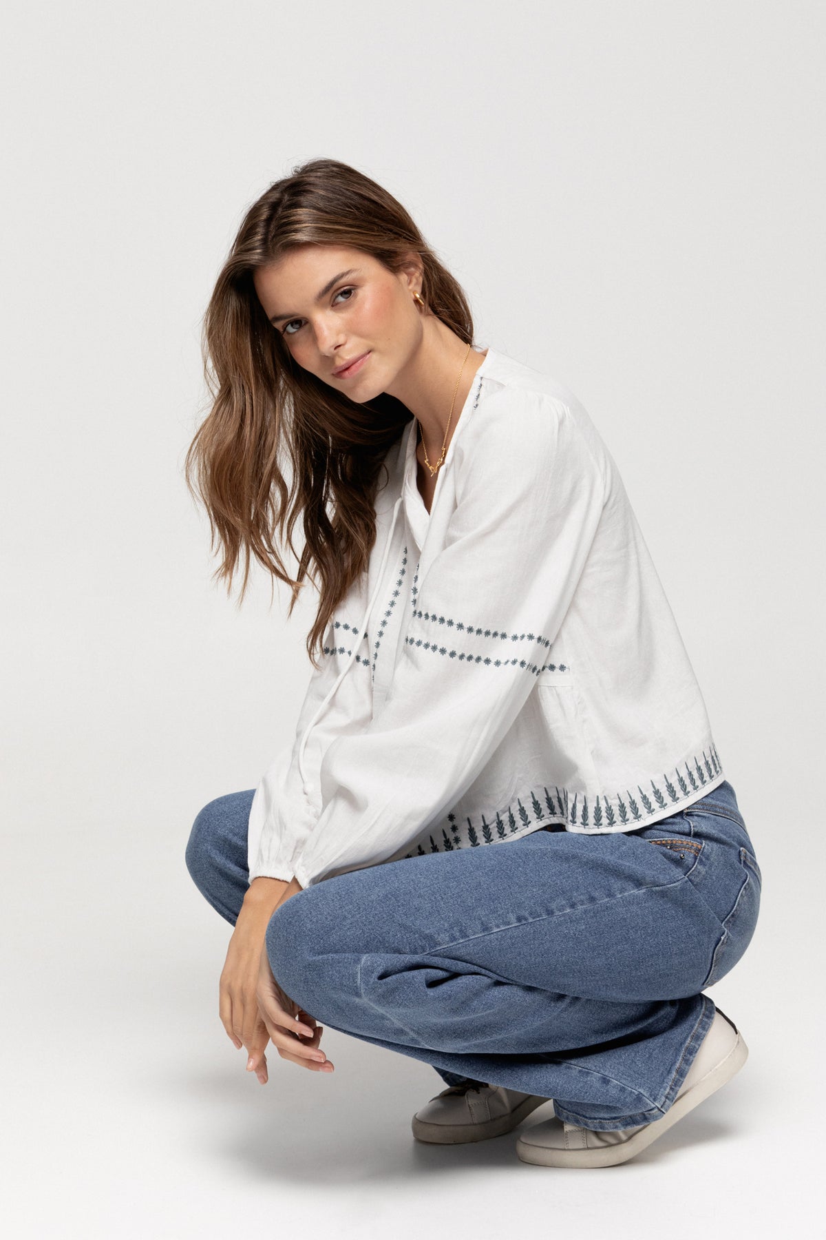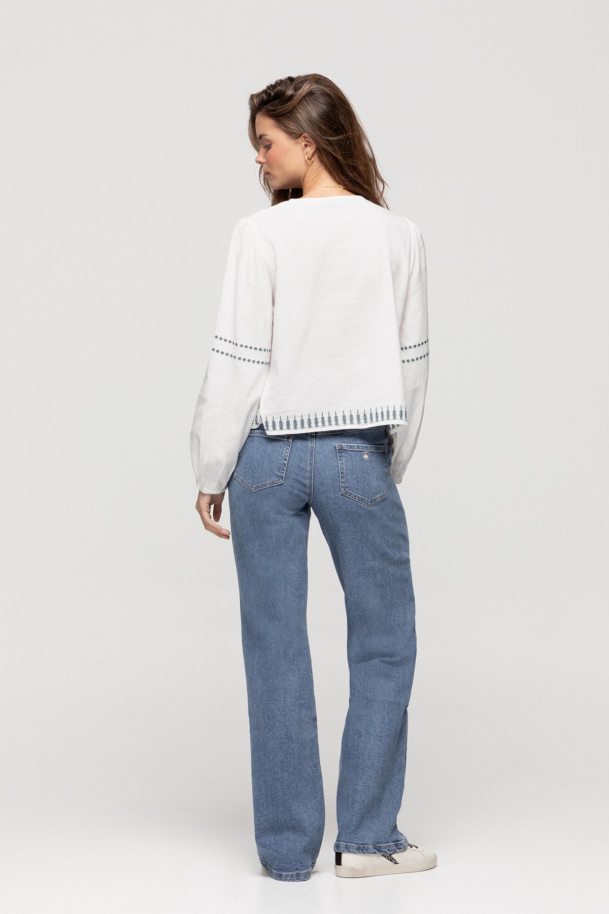 Denim jeans with contrasting embroidered details. Straight cut with a wide leg. Four pockets with an embroidered Noon logo on the back pocket. Center front zip fastening. Add a touch of style to your looks with our trendy jeans!