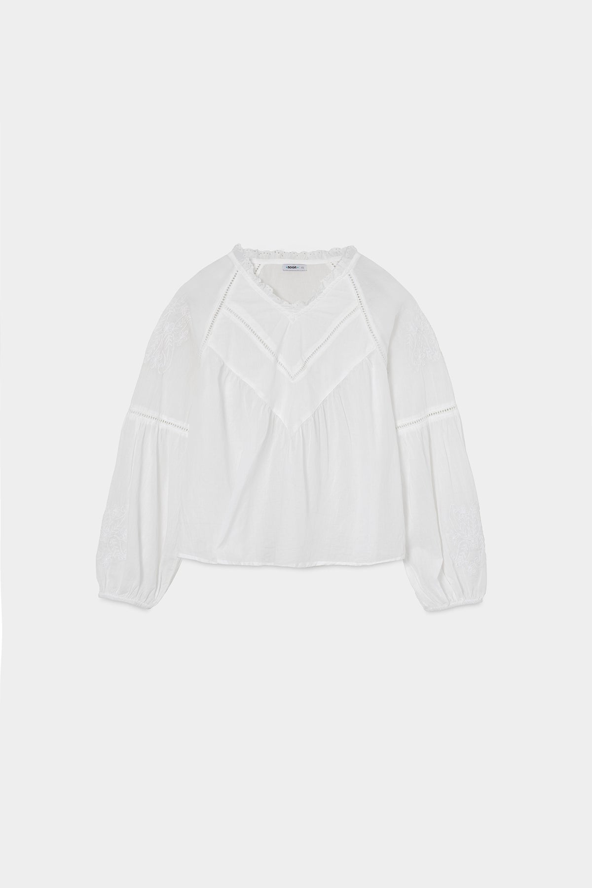 Blusa de Algodón con Detalle de Bordados en las Mangas. Tejido suelto que se adapta perfectamente. Puños elásticos y tejido calado en tendencia. ¡Se convertirá en un básico de tu armario esta temporada!