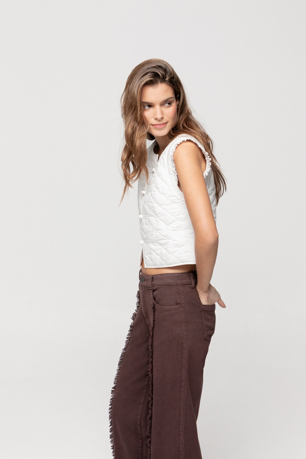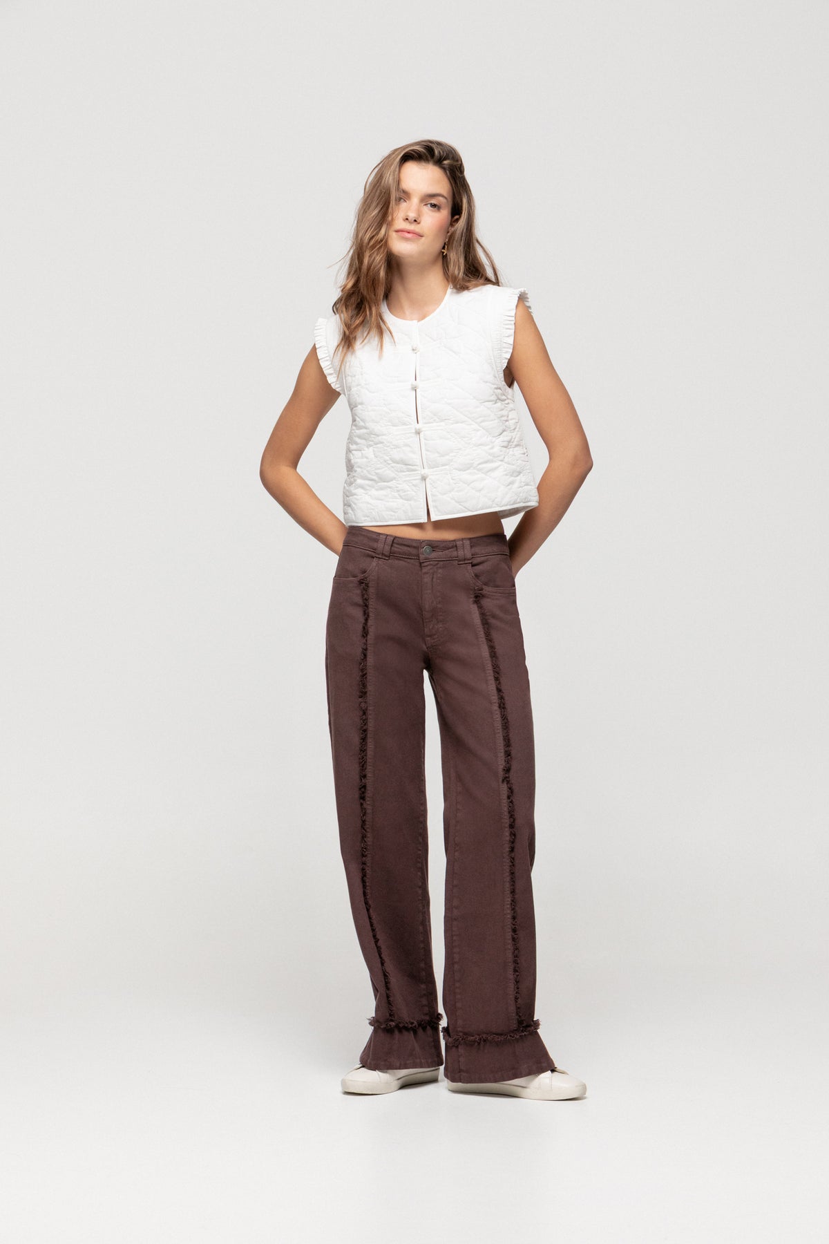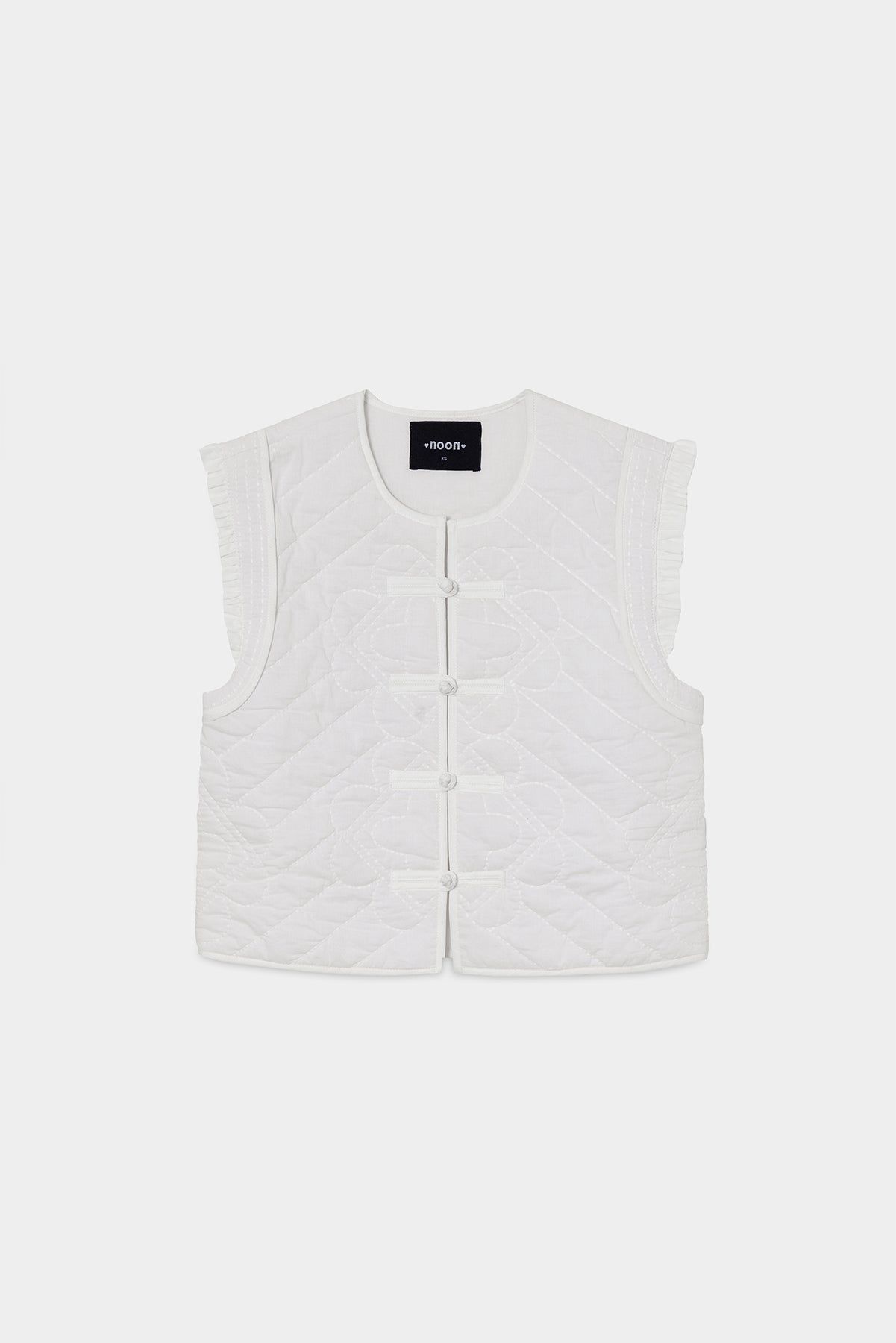 Chaleco Sin Mangas Enguatado con Volantes en la Sisa. Detalle de bordados combinados a contraste. Forro interior. Cierre con botones delanteros a juego. ¡Combínalo con cualquiera de nuestras blusas y consigue un look ideal!