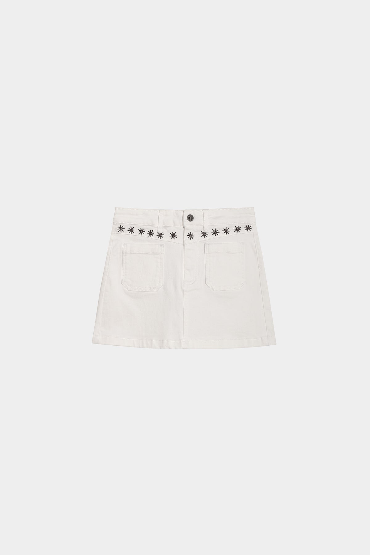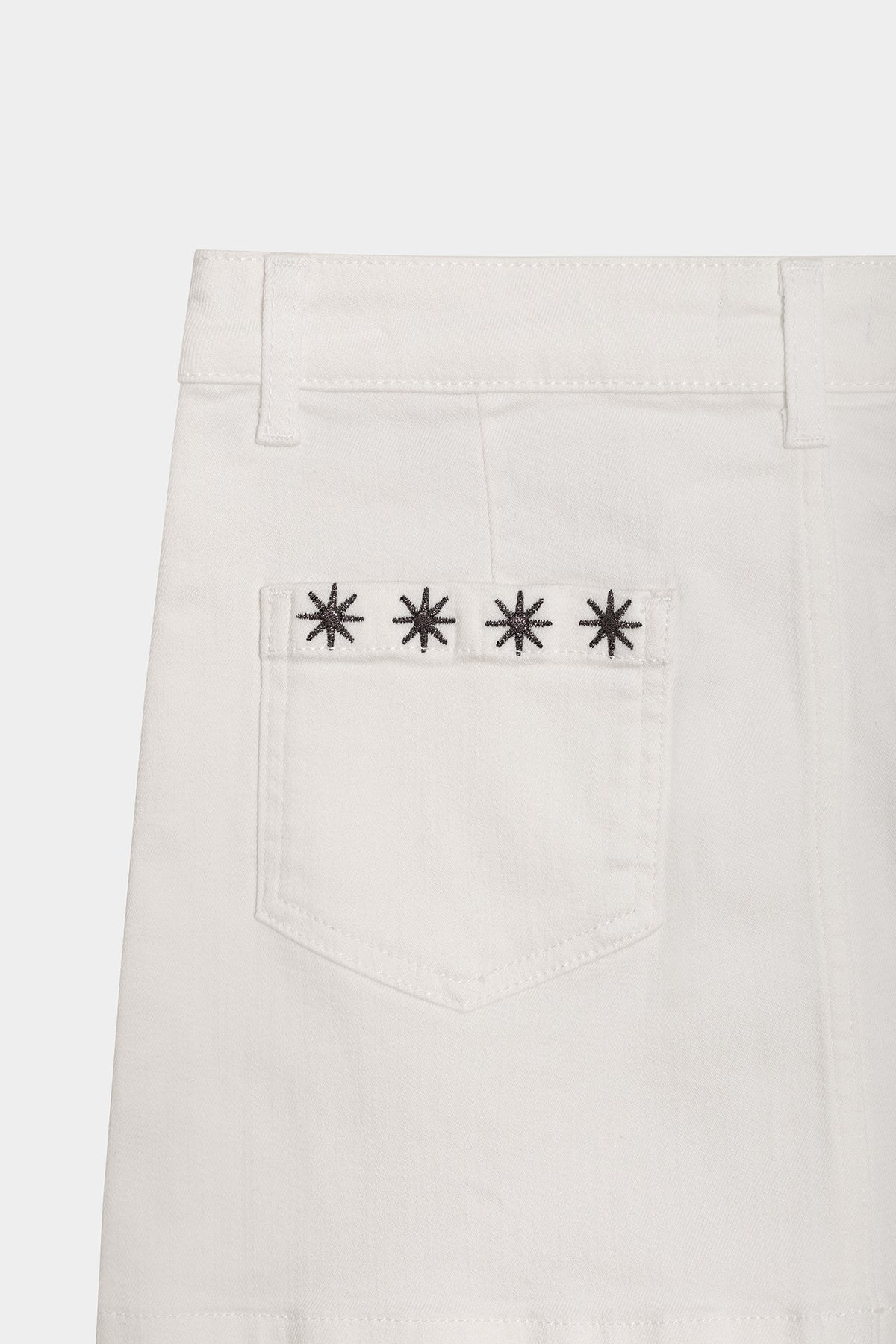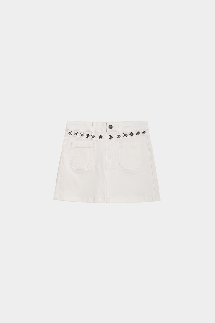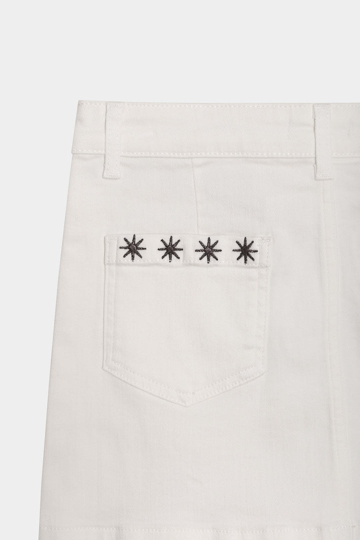 Falda mini tejana en color blanco. Confeccionada en denim suave, presenta detalles de estrellas bordadas que aportan un toque original. Combínala con cualquiera de nuestros tops y consigue un total look perfecto para esta temporada.