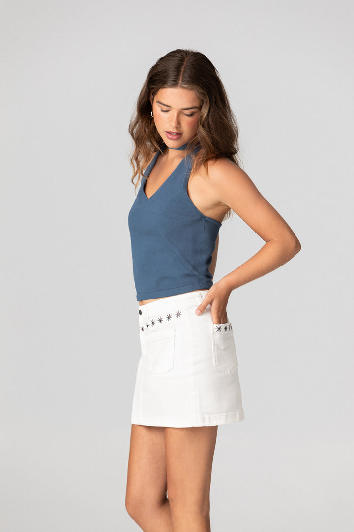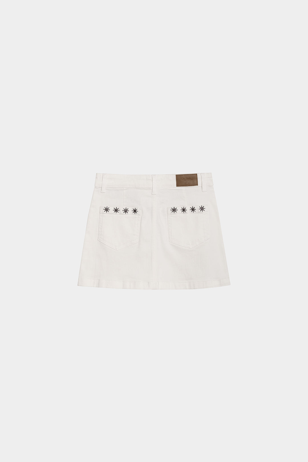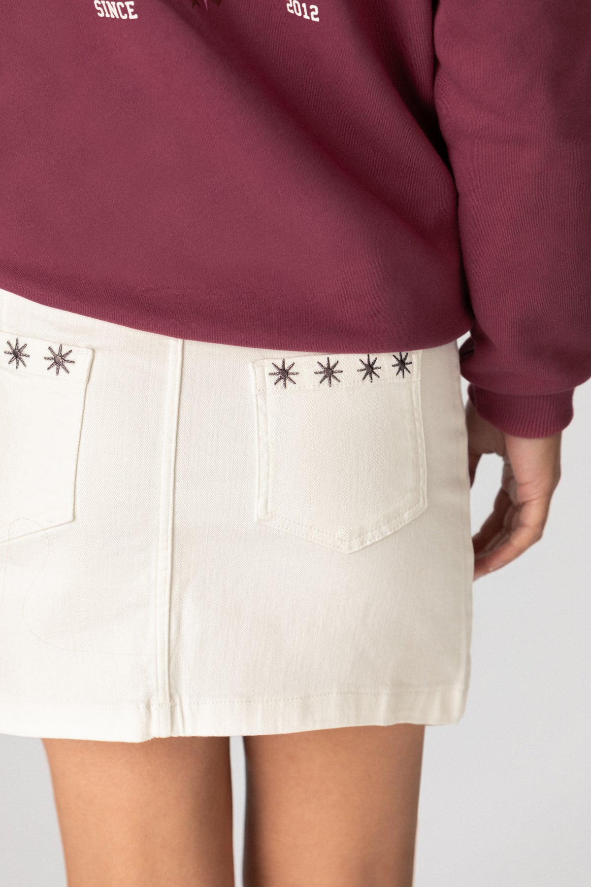 Falda mini tejana en color blanco. Confeccionada en denim suave, presenta detalles de estrellas bordadas que aportan un toque original. Combínala con cualquiera de nuestros tops y consigue un total look perfecto para esta temporada.