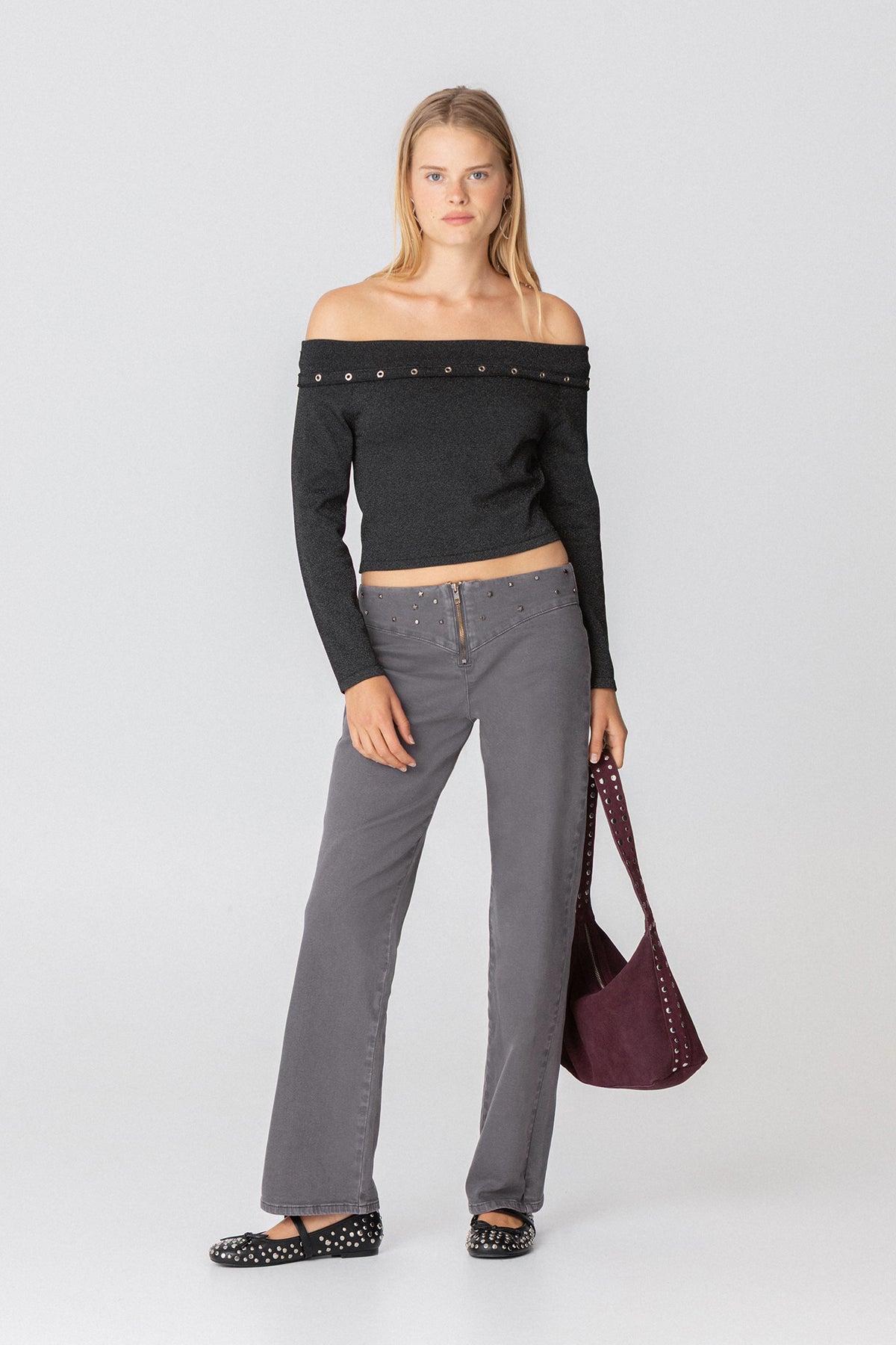Jeans de Tiro Medio con Detalles de Tachuelas. Incorporan un cierre con cremallera central sin botón. El logo de noon bordado en el bolsillo trasero añade un detalle distintivo. ¡Conviértelos en un básico imprescindible de tu armario!